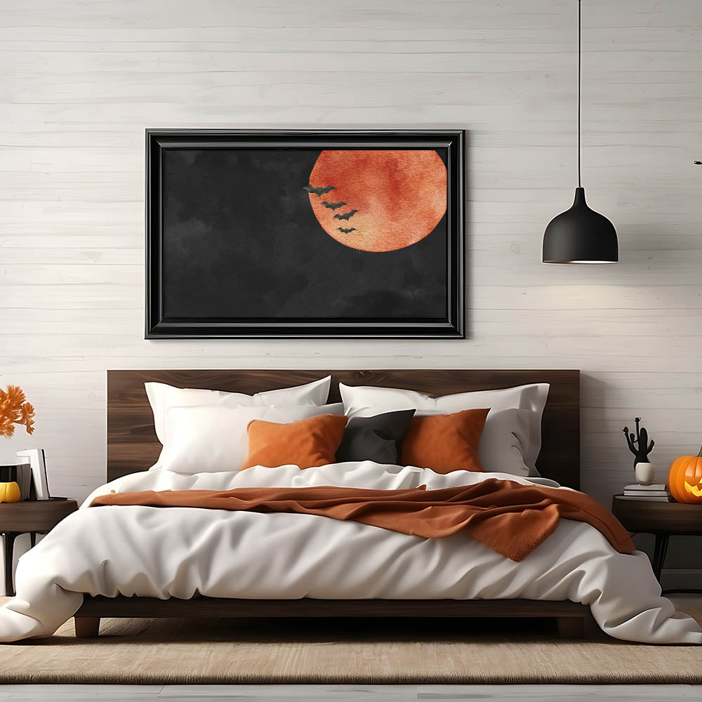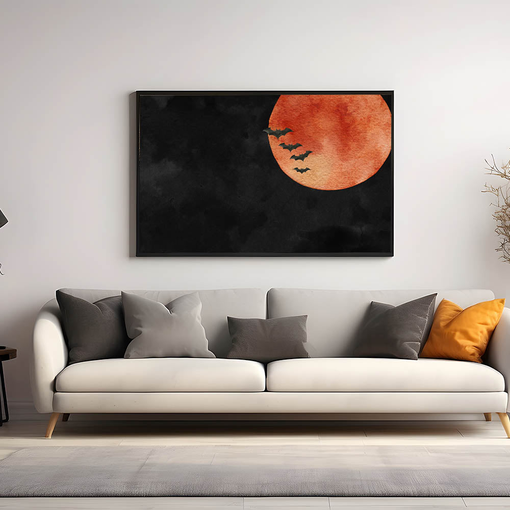 Elevate your Halloween wall decor with this mesmerizing watercolor print, featuring a blood-red moon against a deep black sky, with eerie bats flying across. This minimalist yet striking artwork captures the essence of a spooky autumn night, making it a must-have for Halloween wall decorations. The rich watercolor texture adds a handcrafted touch, blending artistic elegance with supernatural charm.