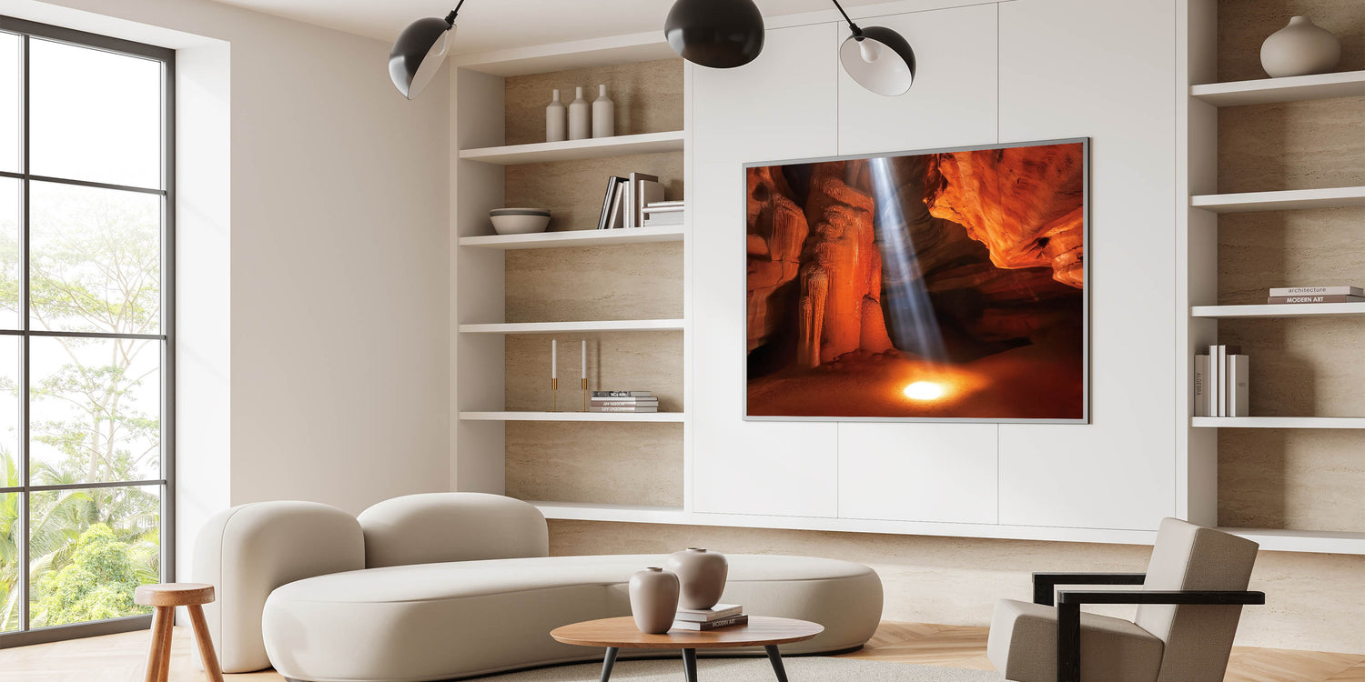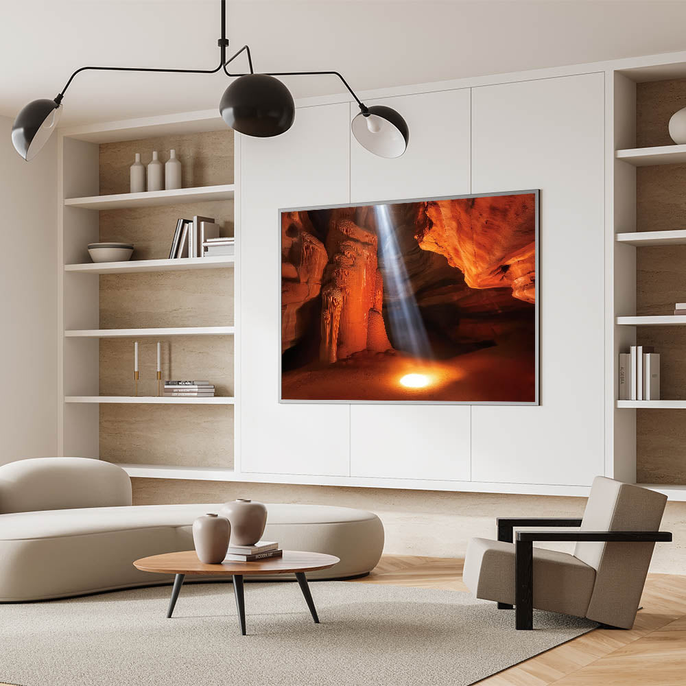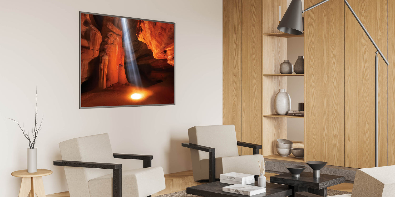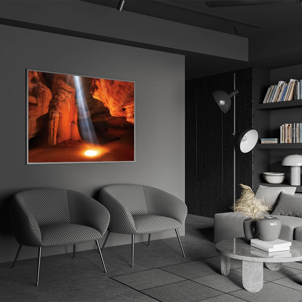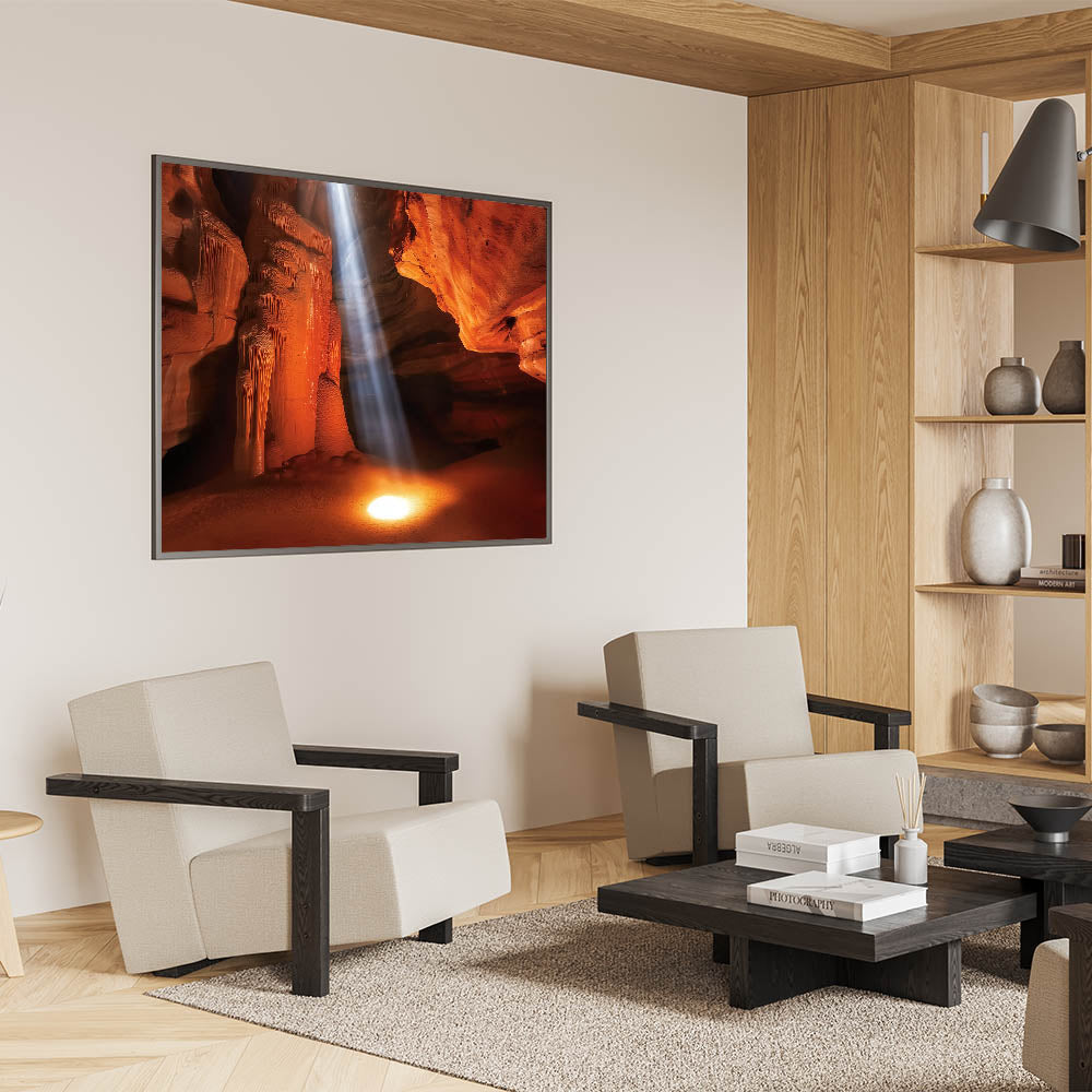 Illuminate your space with this stunning sunlit canyon wall art, capturing a dramatic beam of light cutting through rich orange and red sandstone formations. This breathtaking design highlights the intricate textures and natural beauty of canyon landscapes, offering a warm and inviting focal point for your home or office. Ideal for art lovers and nature enthusiasts, it adds a touch of inspiration to any space.
