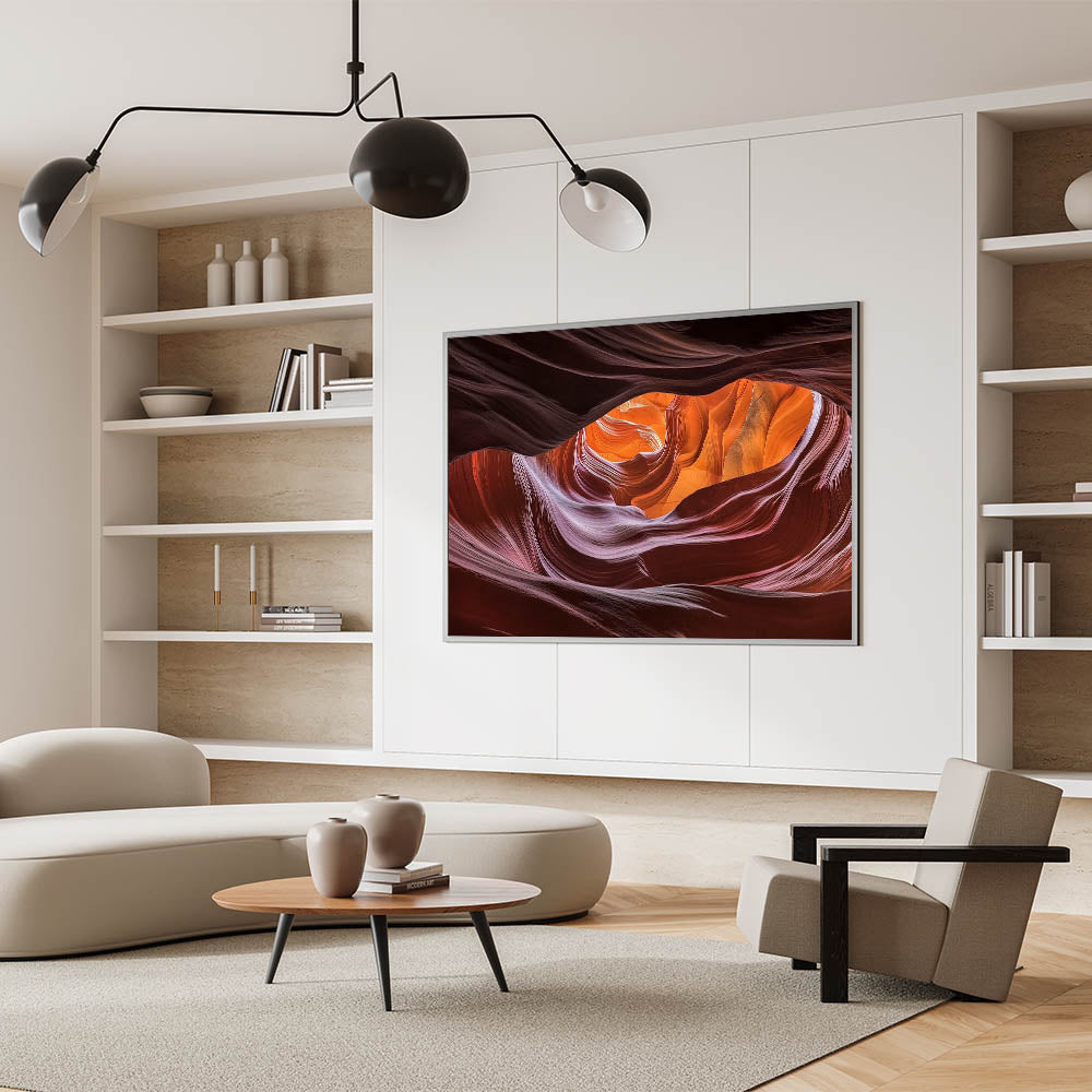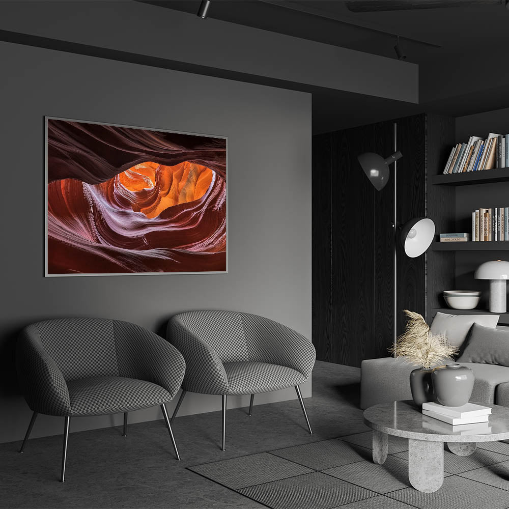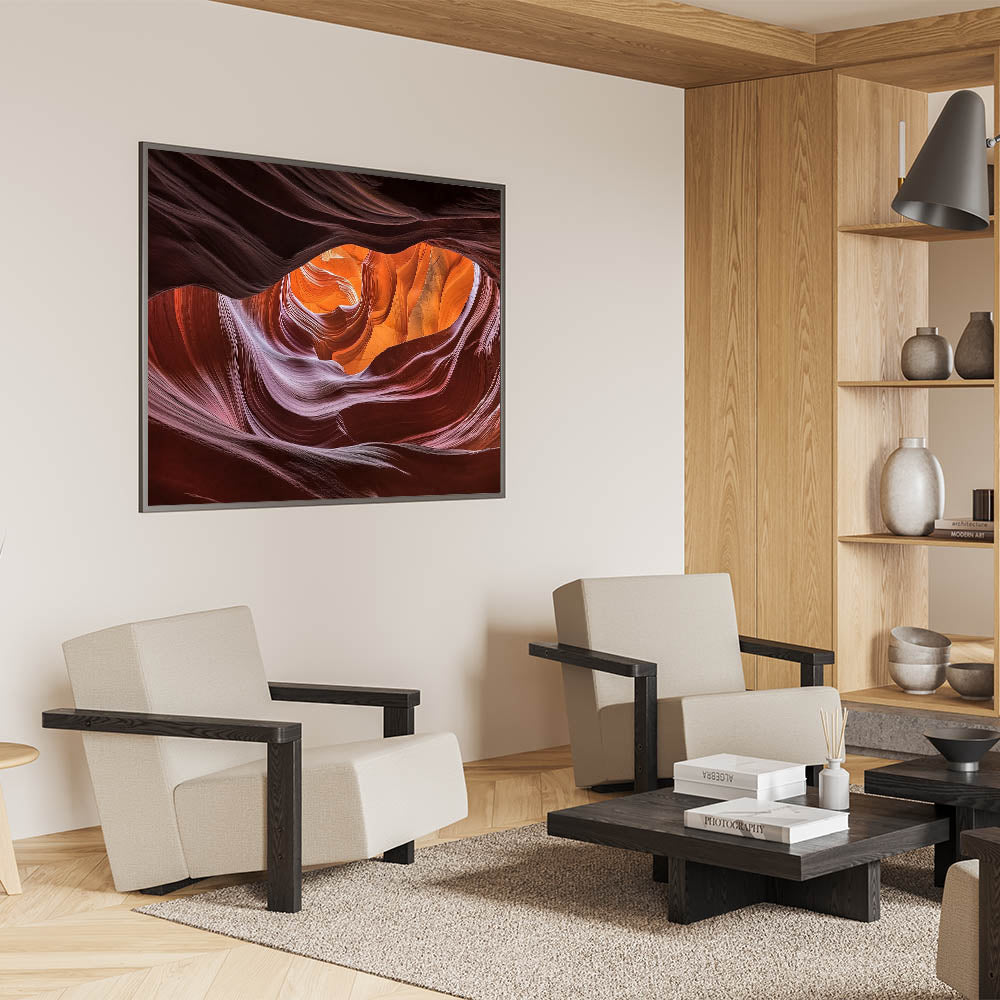 Immerse yourself in the mesmerizing beauty of this swirling canyon wall art. The smooth, flowing curves of the canyon are bathed in rich shades of orange, red, and purple, creating a striking visual that captures the essence of nature’s artistry. Illuminated by soft natural light, this abstract design showcases an intricate blend of textures and vibrant colors that bring warmth and depth to any space.