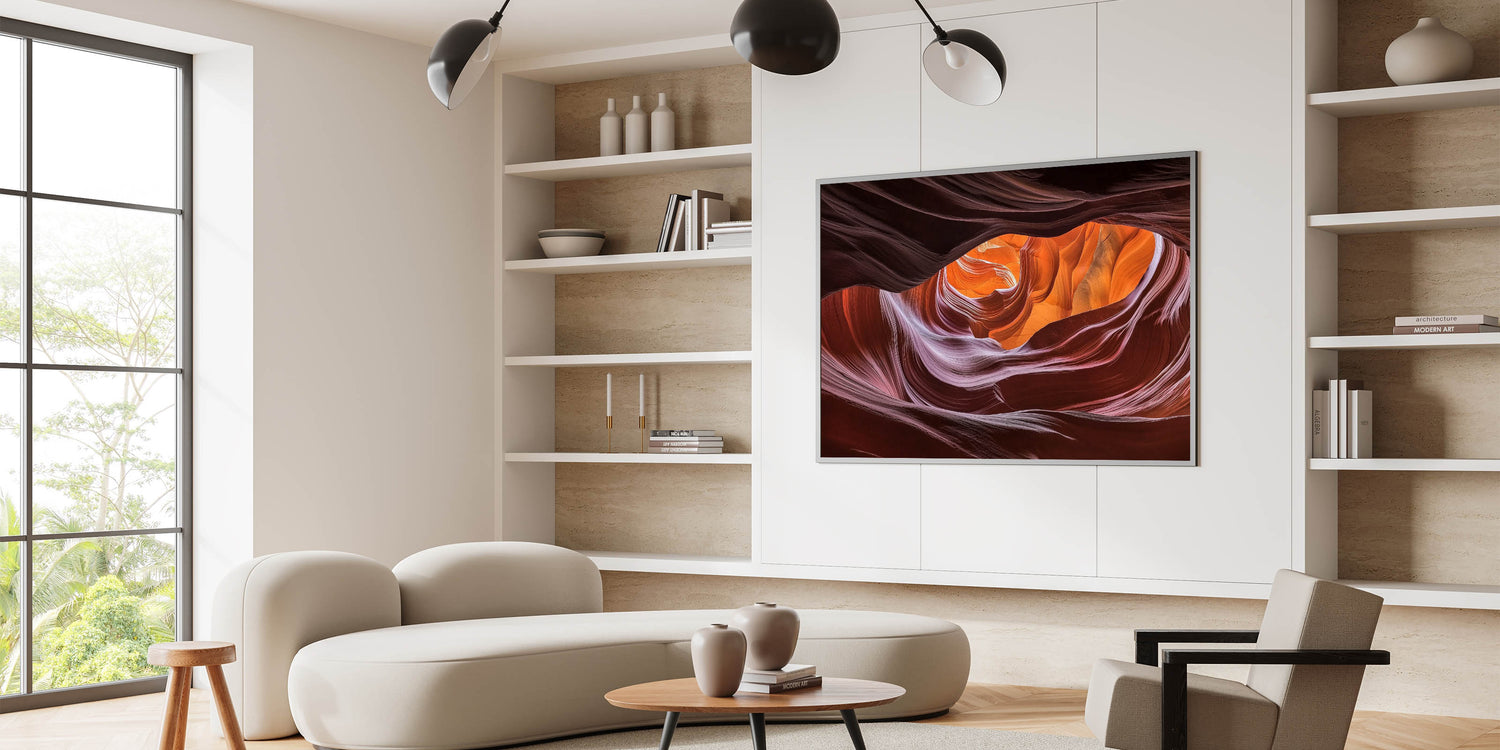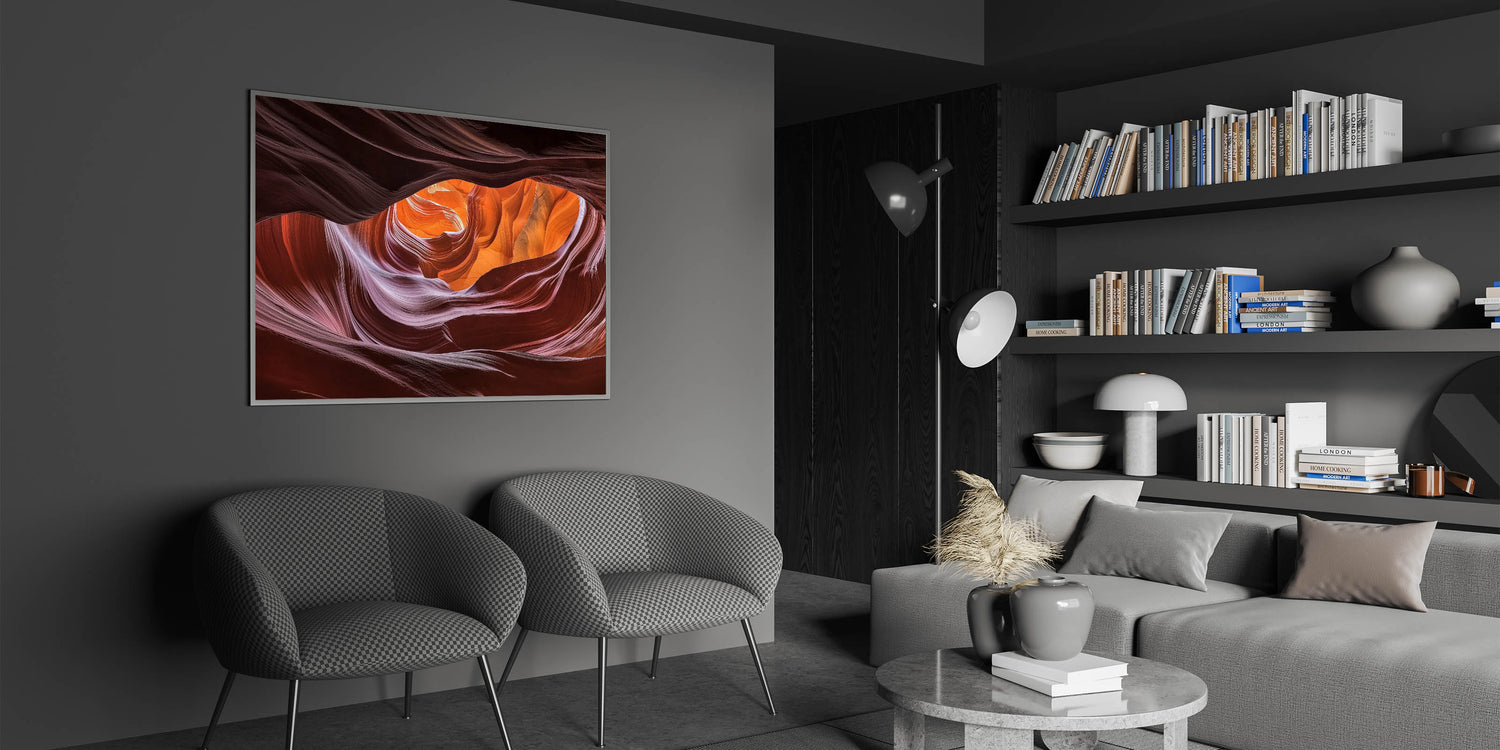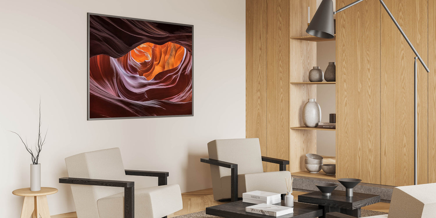Immerse yourself in the mesmerizing beauty of this swirling canyon wall art. The smooth, flowing curves of the canyon are bathed in rich shades of orange, red, and purple, creating a striking visual that captures the essence of nature’s artistry. Illuminated by soft natural light, this abstract design showcases an intricate blend of textures and vibrant colors that bring warmth and depth to any space.