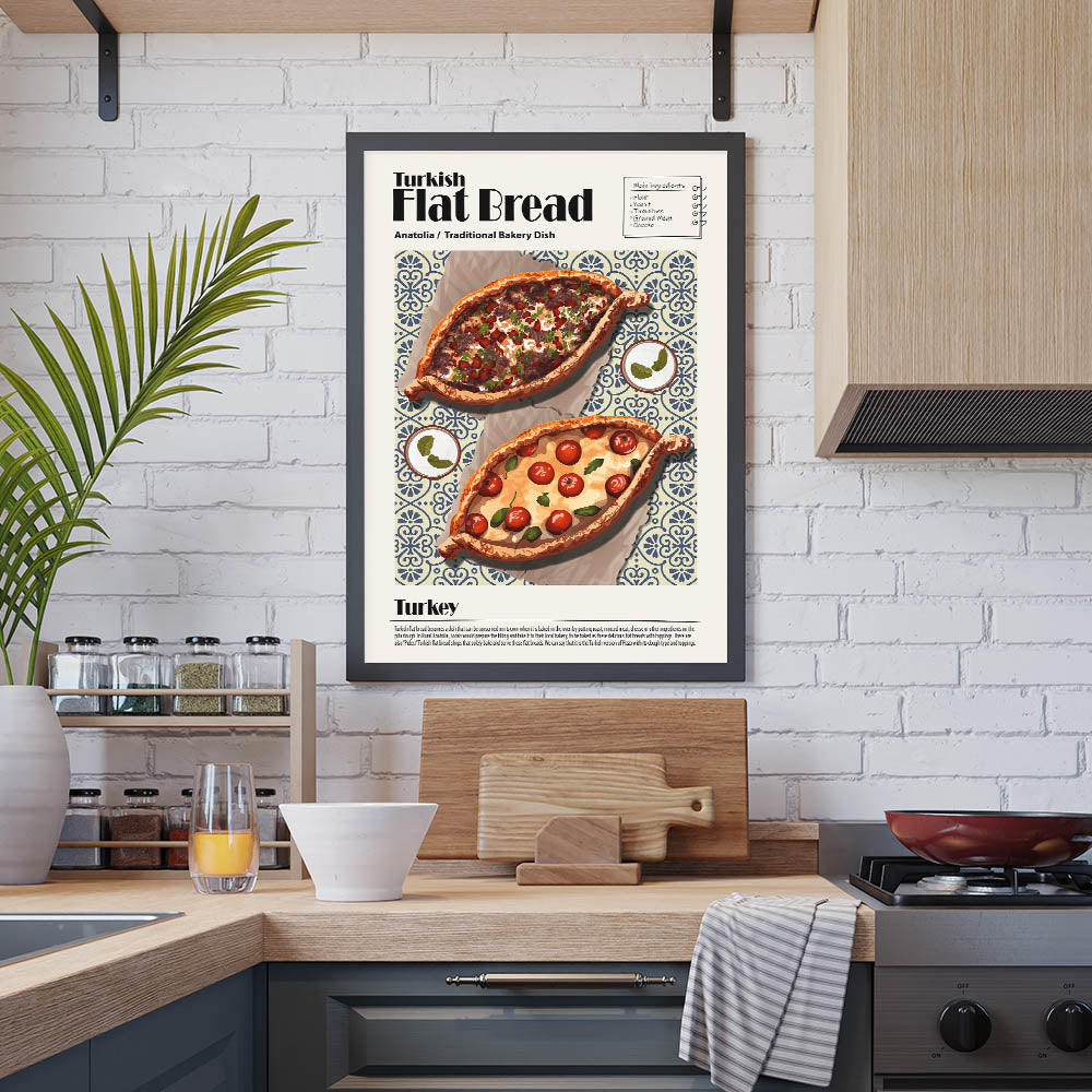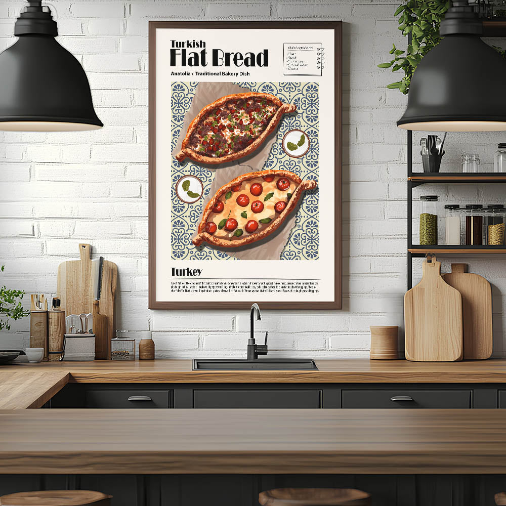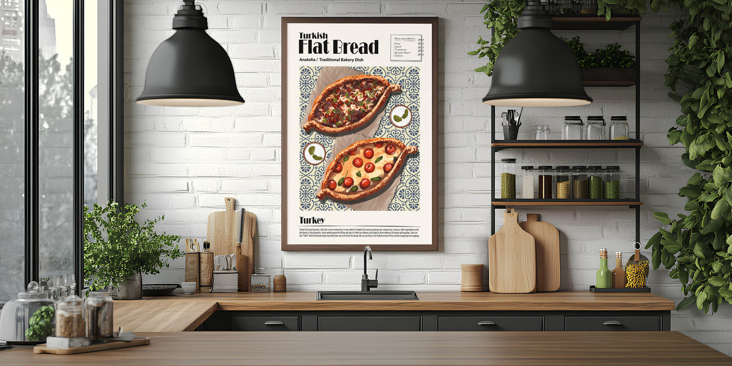 Bring the rich flavors of Anatolia into your home with this Turkish Flatbread Dishes Wall Art. This culinary wall art showcases two traditional pide flatbreads, one topped with seasoned ground meat and fresh herbs, while the other features melted cheese, cherry tomatoes, and basil. The elegant blue-and-white tile background adds an authentic touch, making this food wall art a striking addition to any kitchen or dining space.