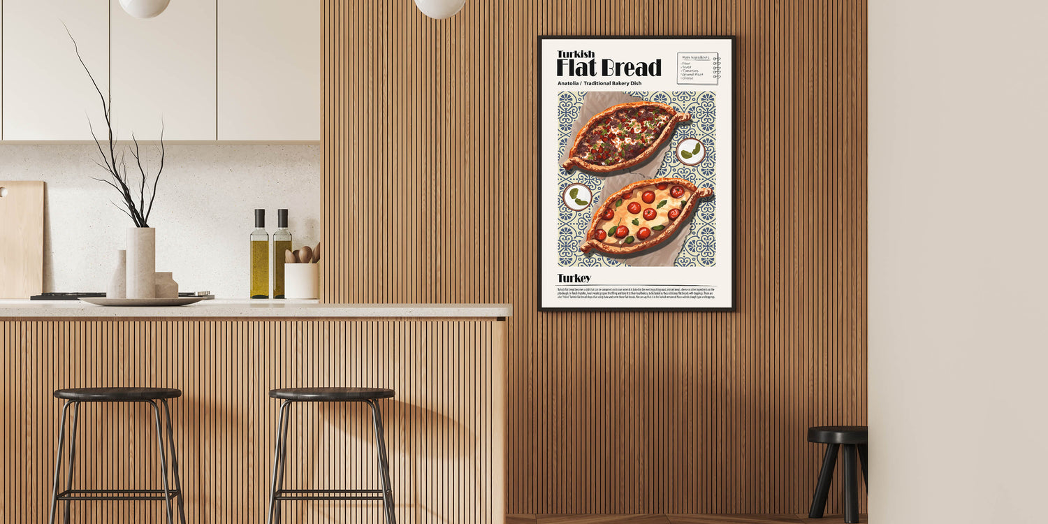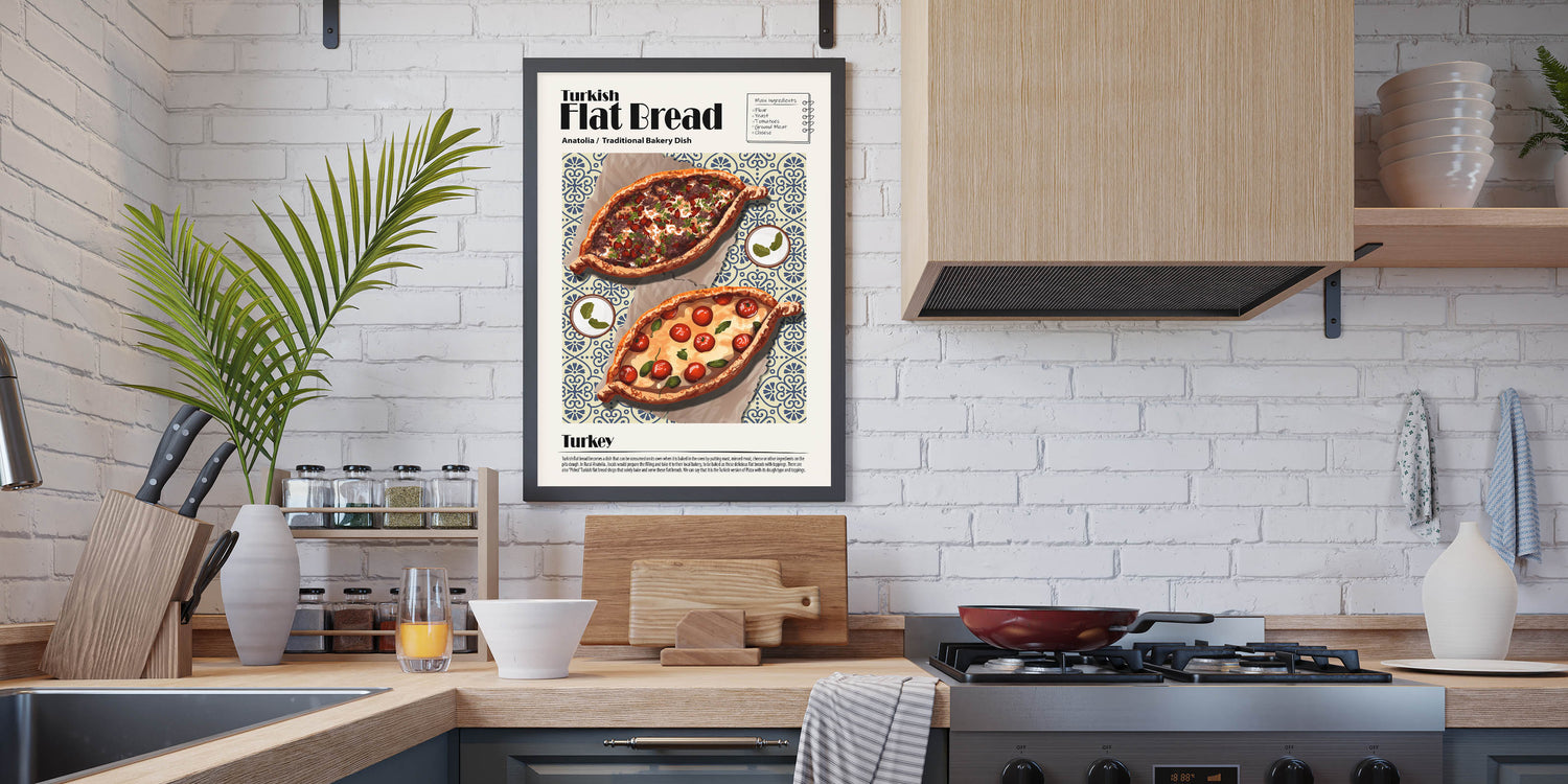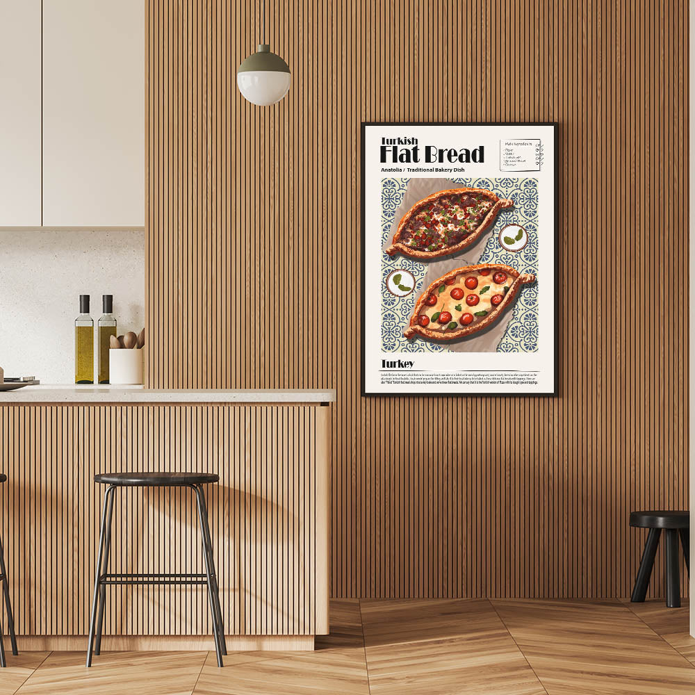 Bring the rich flavors of Anatolia into your home with this Turkish Flatbread Dishes Wall Art. This culinary wall art showcases two traditional pide flatbreads, one topped with seasoned ground meat and fresh herbs, while the other features melted cheese, cherry tomatoes, and basil. The elegant blue-and-white tile background adds an authentic touch, making this food wall art a striking addition to any kitchen or dining space.
