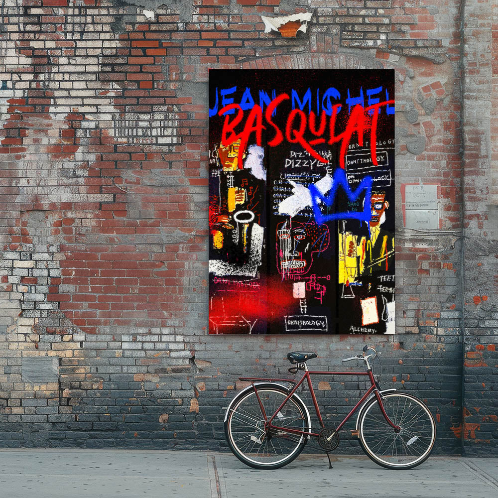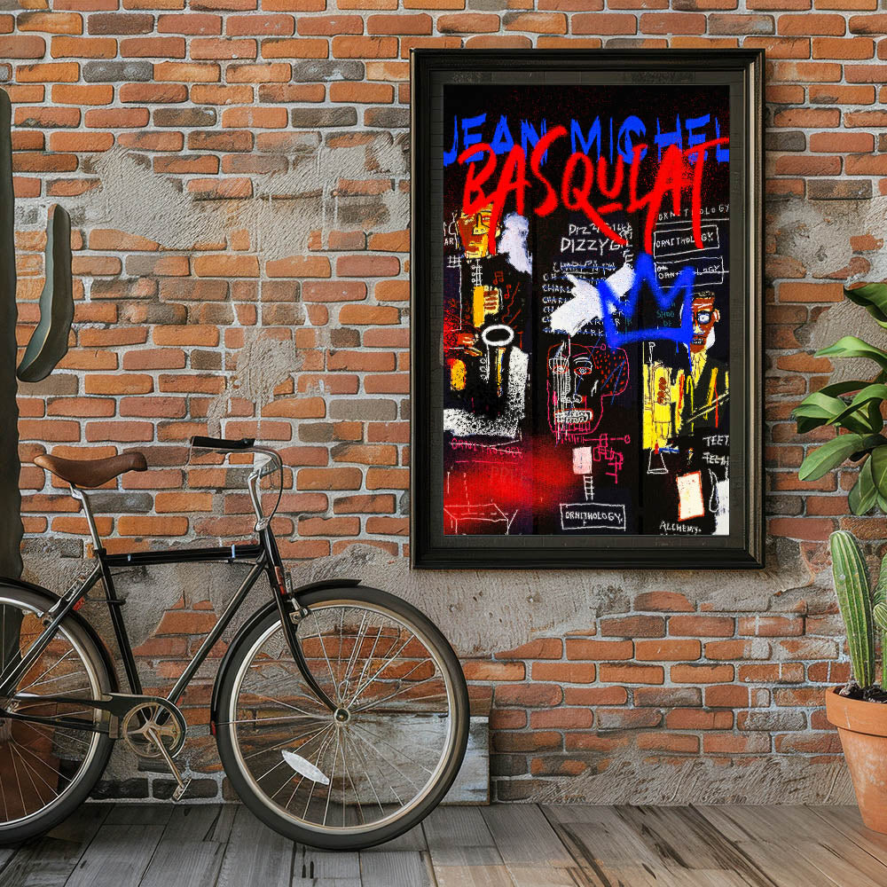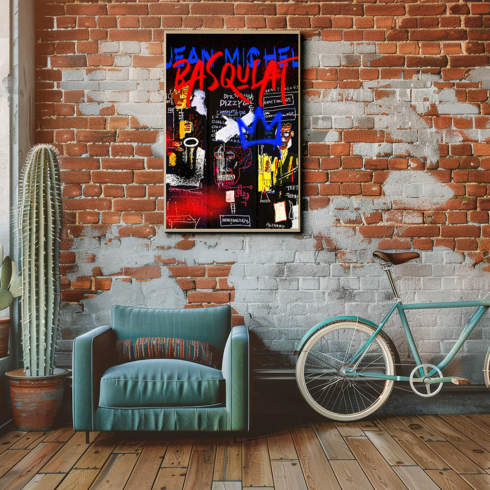Make a bold statement with this urban pop art wall art, inspired by the raw energy and graffiti style of Jean-Michel Basquiat. This artwork features vibrant shades of red, blue, yellow, and white against a deep black backdrop, with expressive text and chaotic lines that capture the essence of modern street art. The iconic crown motif and striking figures add a layer of complexity, making this piece a perfect choice for those who appreciate bold, contemporary art.