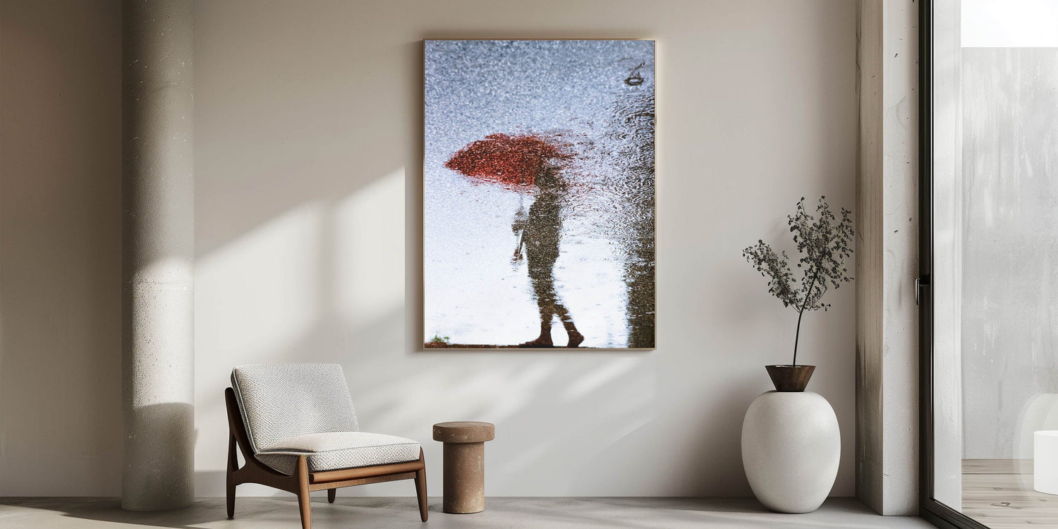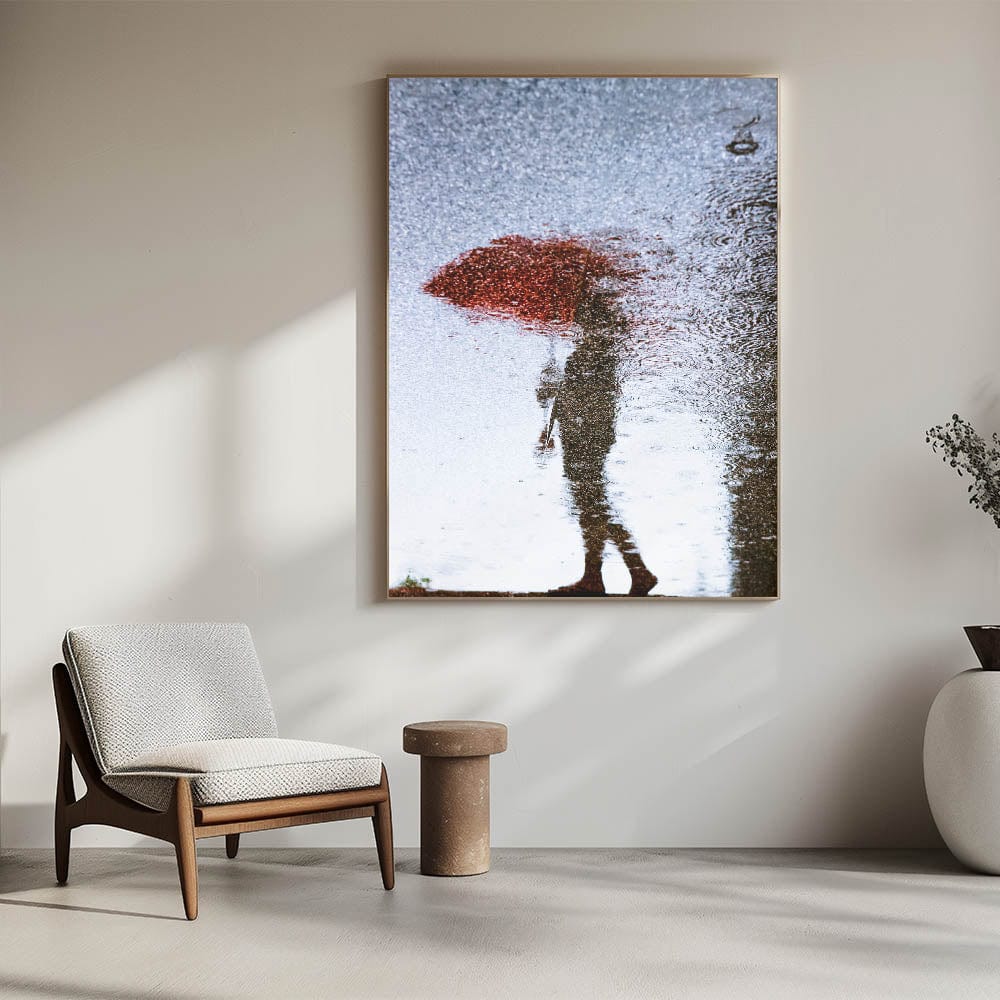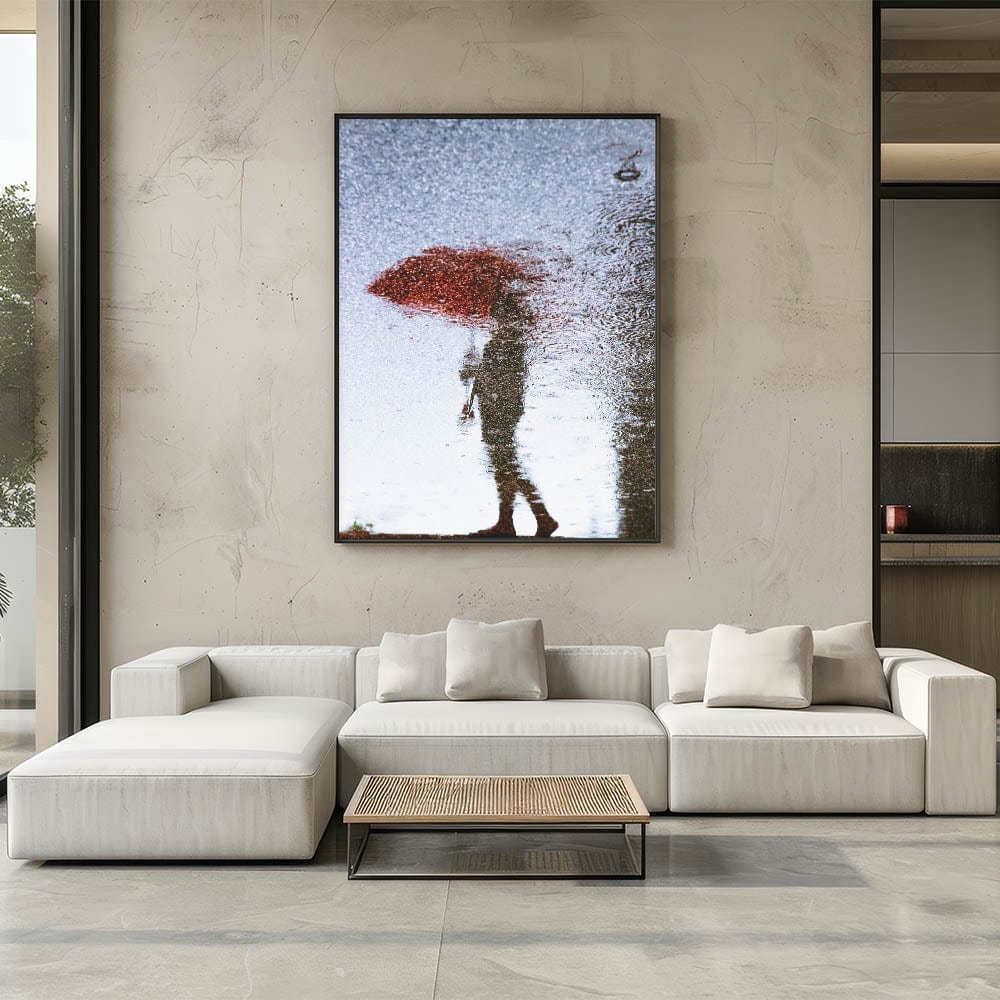 Embrace the poetic beauty of rainy city streets with this stunning urban scenery wall art. Featuring the distorted reflection of a person holding a red umbrella in a rain-soaked puddle, this contemporary city wall decor blends mystery, movement, and emotion into a captivating composition.