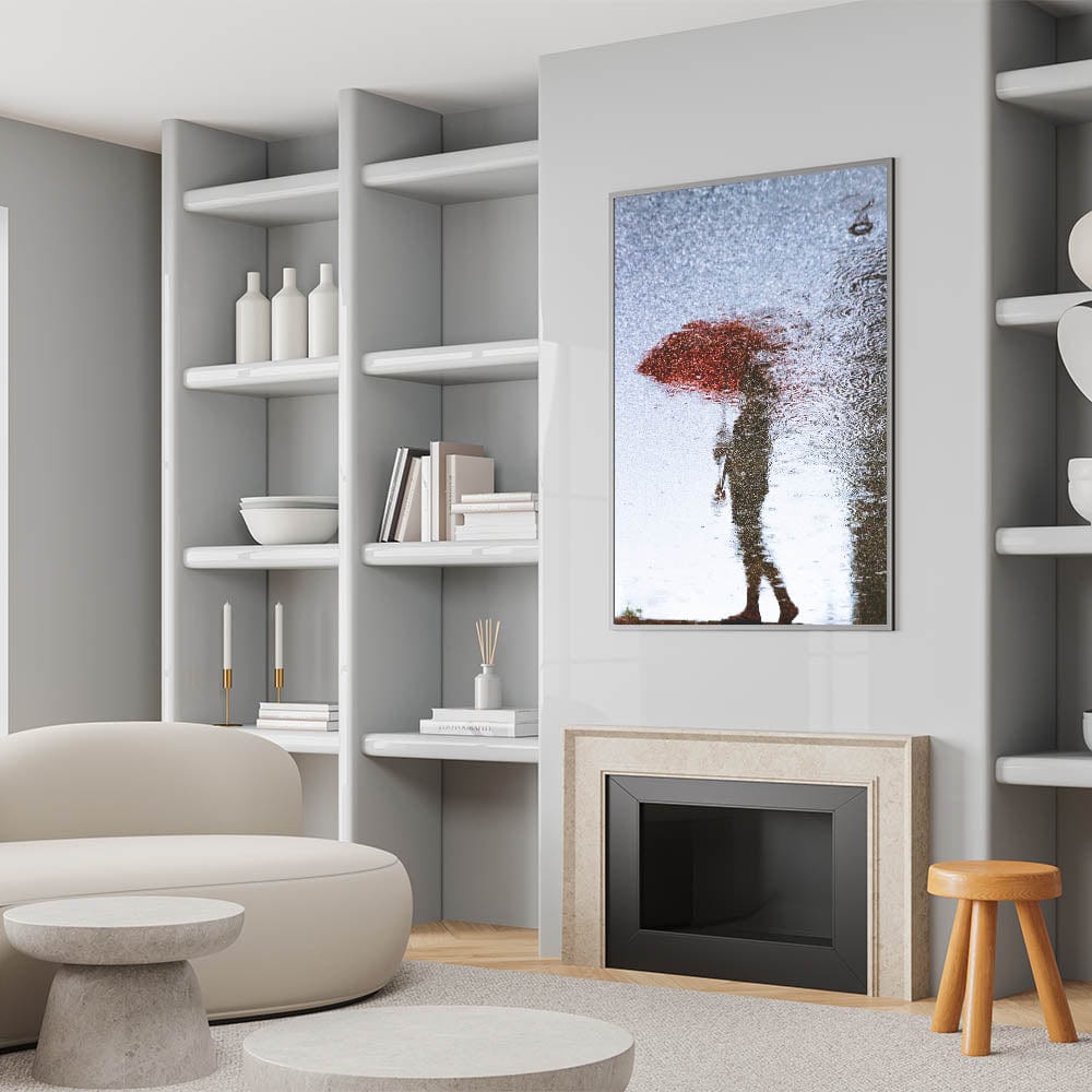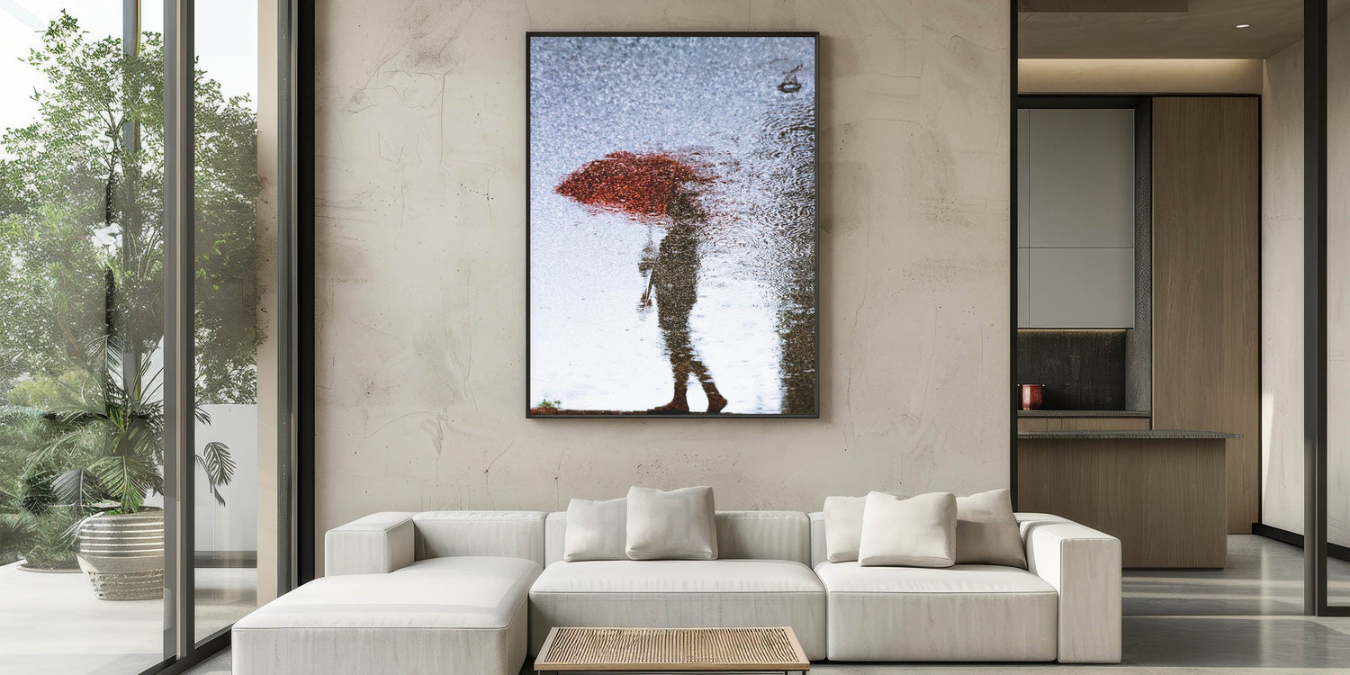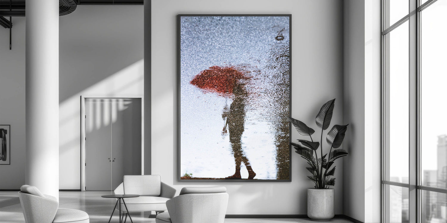 Embrace the poetic beauty of rainy city streets with this stunning urban scenery wall art. Featuring the distorted reflection of a person holding a red umbrella in a rain-soaked puddle, this contemporary city wall decor blends mystery, movement, and emotion into a captivating composition.
