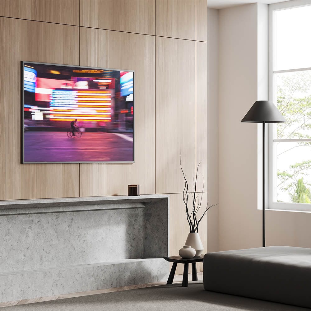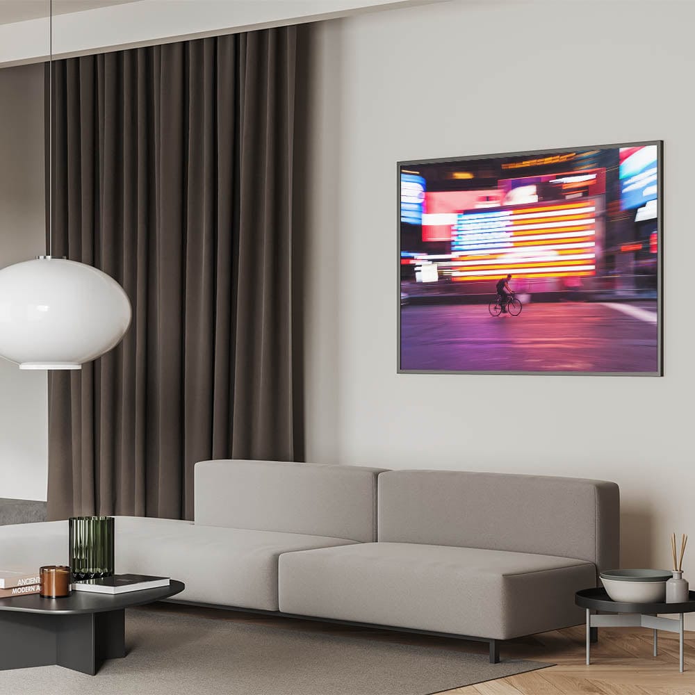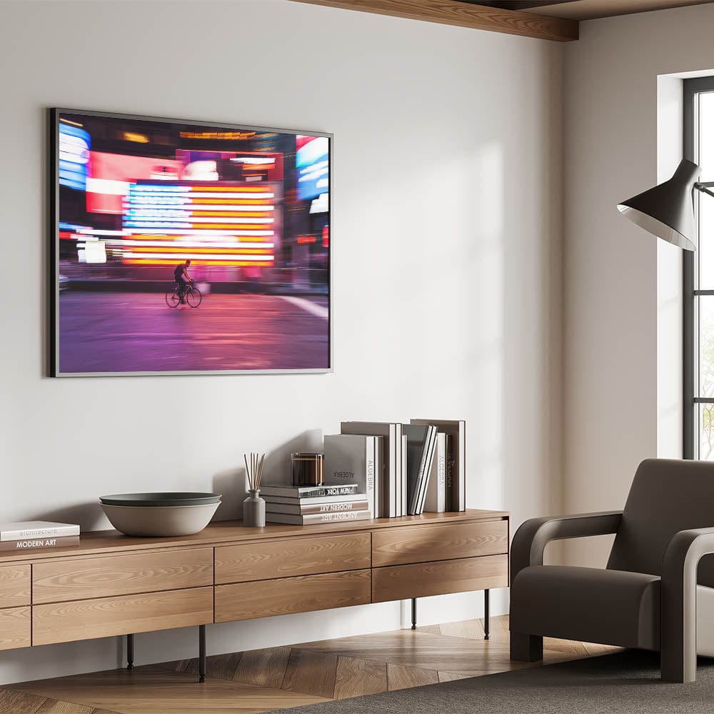 Capture the energy of the city with this stunning urban scenery wall art, featuring a cyclist in motion against a backdrop of dazzling neon lights. The blurred movement creates a dynamic effect, symbolizing the fast-paced rhythm of modern urban life. This high-quality urban photography print is a bold statement piece that adds vibrancy and depth to any contemporary setting.