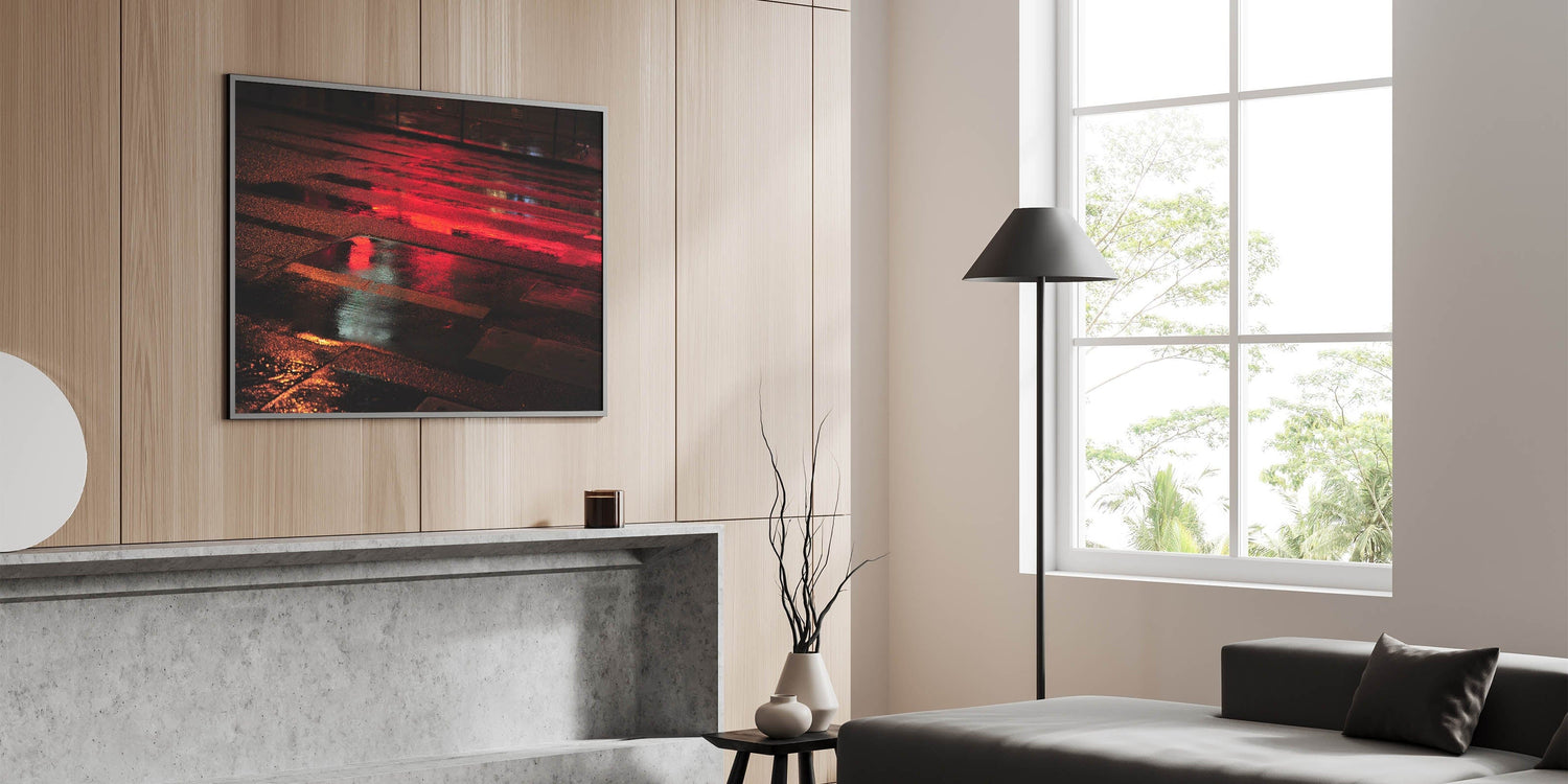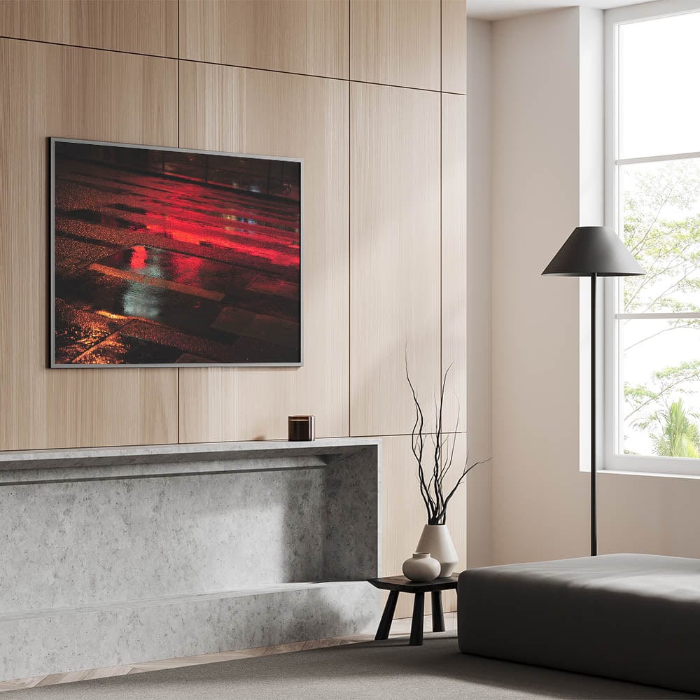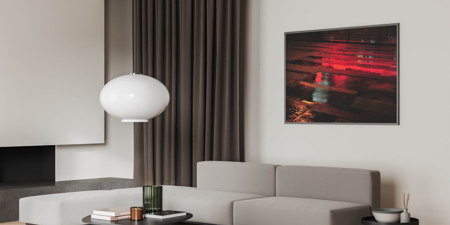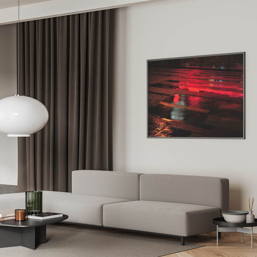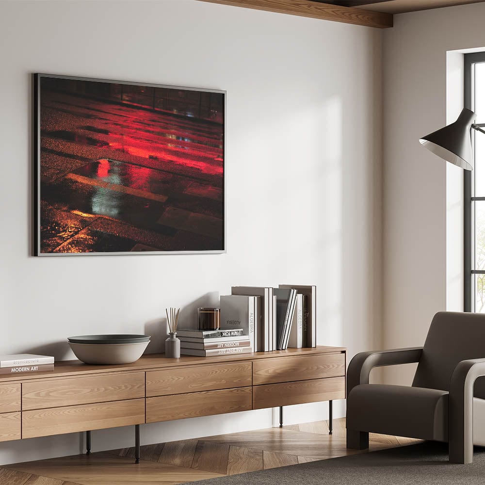 Immerse yourself in the energy of the city with this striking urban scenery wall art. Capturing a wet street illuminated by vivid red reflections, this modern cityscape photography print adds depth, drama, and movement to any interior space.