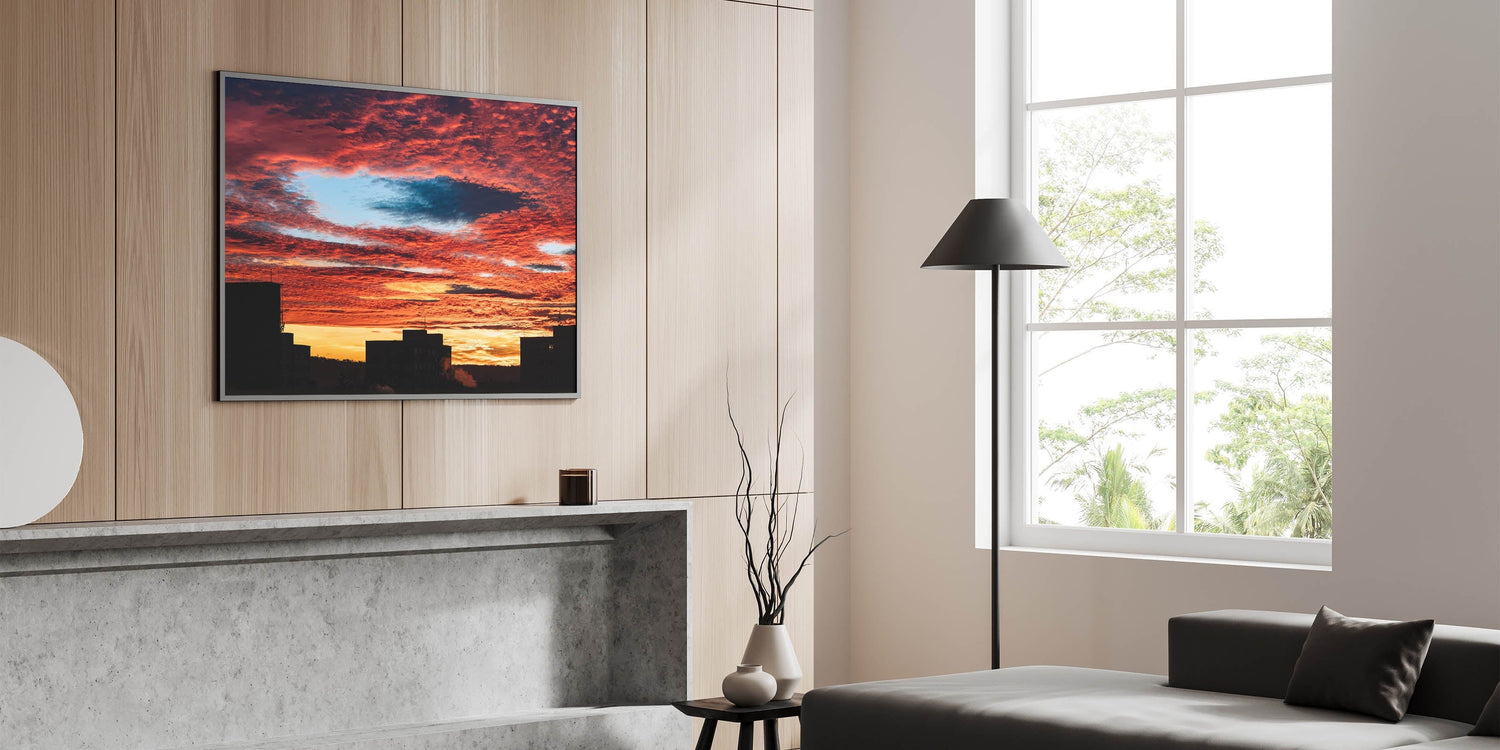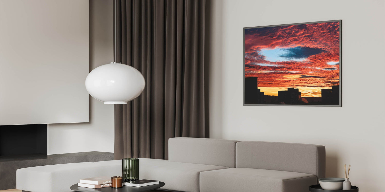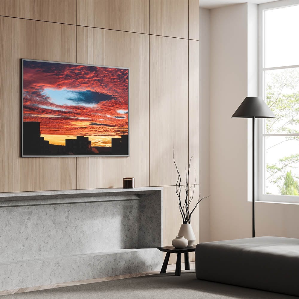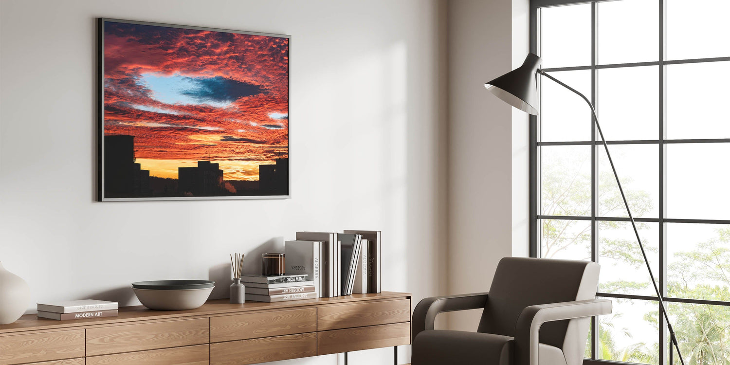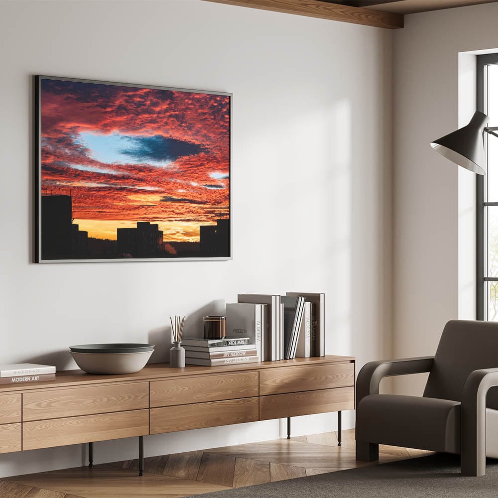 Captures vibrant cityscape canvas prints with bold sunset tones