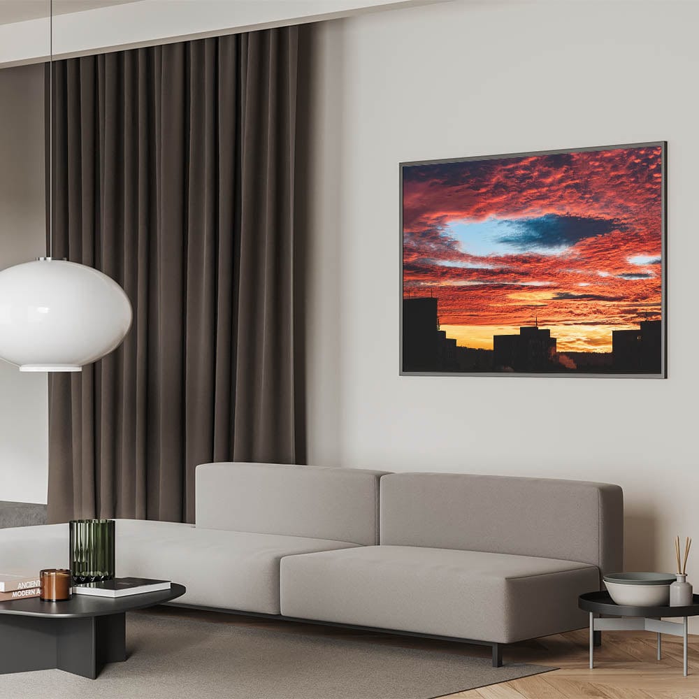 Capture the raw beauty of city life with this powerful piece of urban scenery wall art. Featuring a striking skyline set against a dramatic sunset sky, this design fuses the bold structure of urban architecture with the vibrant colors of nature. Whether you're decorating a modern home, a creative workspace, or a contemporary office, this modern urban landscape art brings energy and depth to your interior. The blend of deep reds, blacks, and golden light offers a captivating focal point that celebrates metropolitan life in motion.