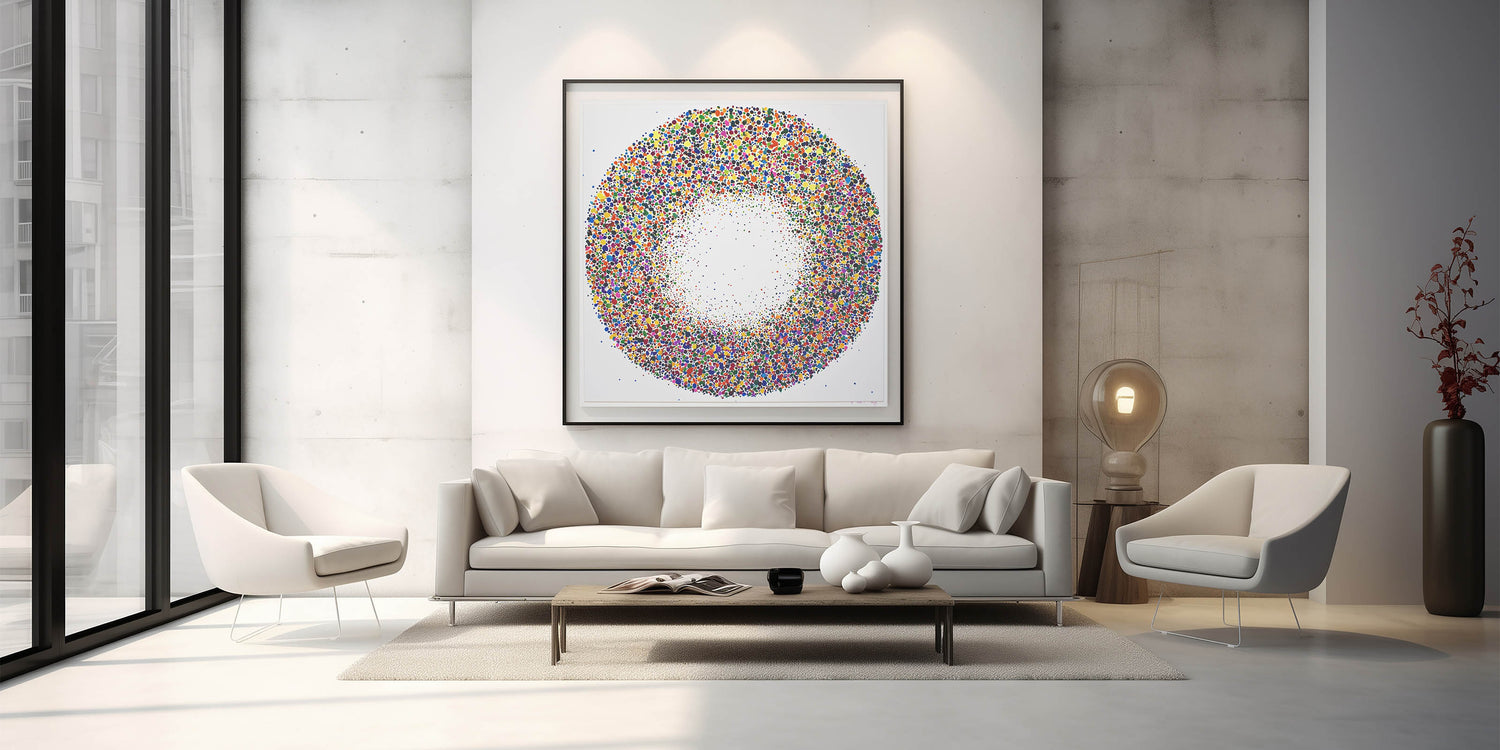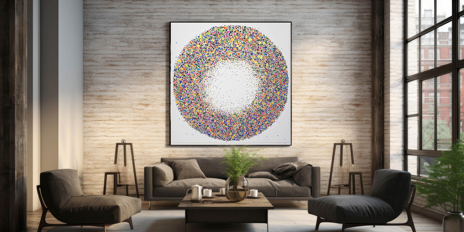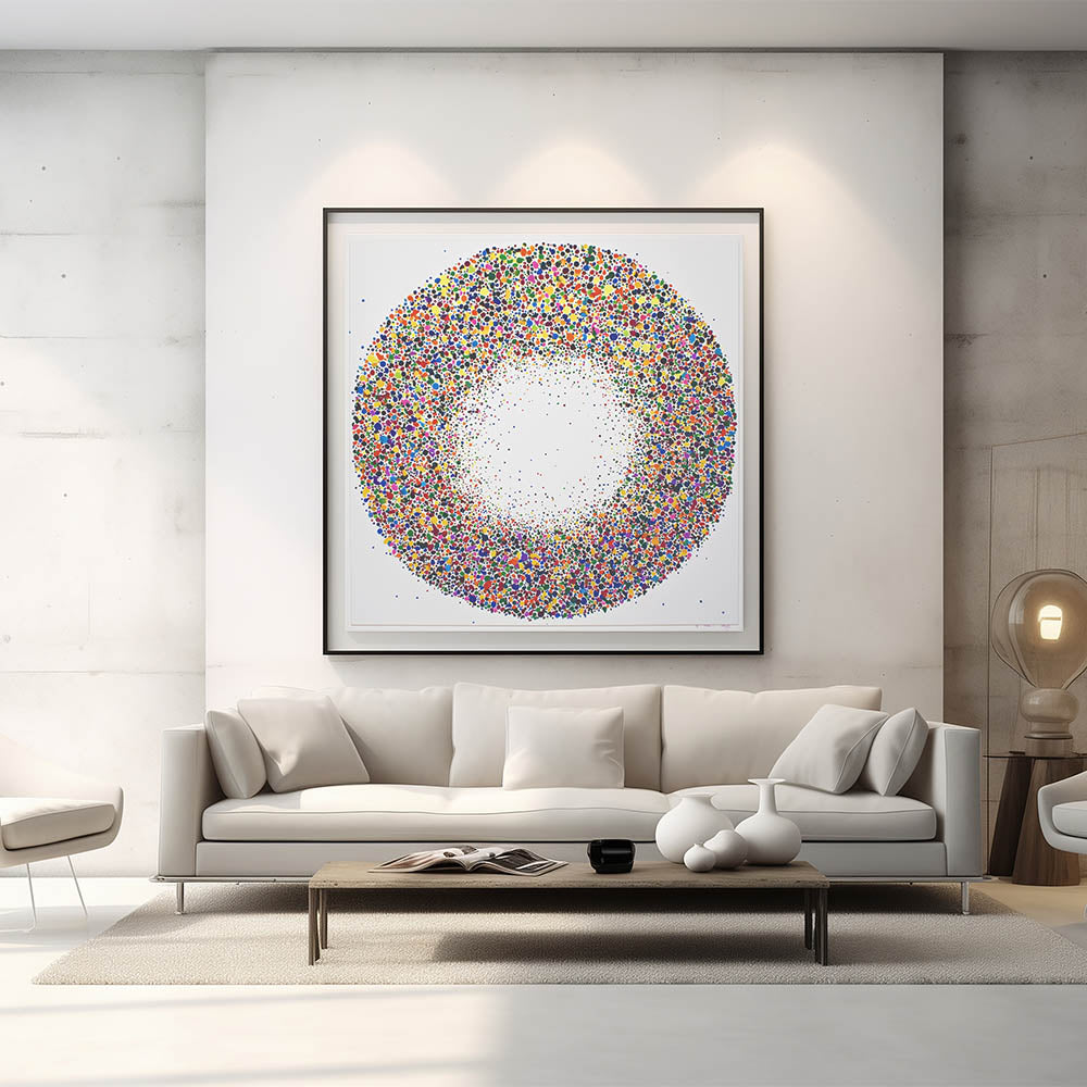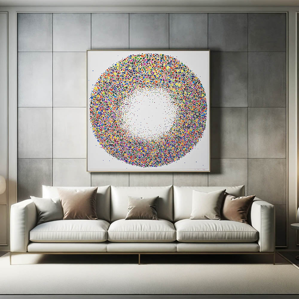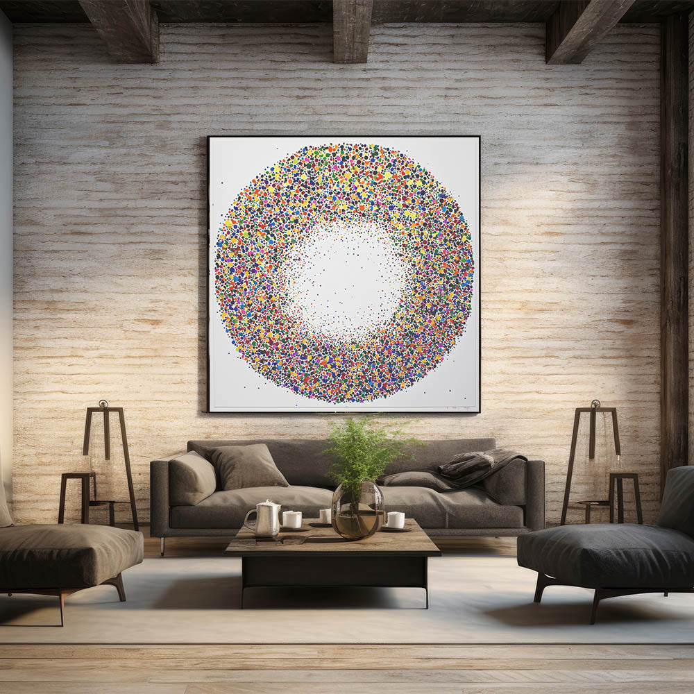 Brighten your decor with this vibrant circular splatter artwork from the "Splatters and Spots in Abstracts" collection. Featuring an intricate design of colorful dots arranged in a mesmerizing circular pattern, this piece is a celebration of energy and creativity. The dynamic mix of multicolor splatters creates a bold yet balanced visual, perfect for adding personality to any space.