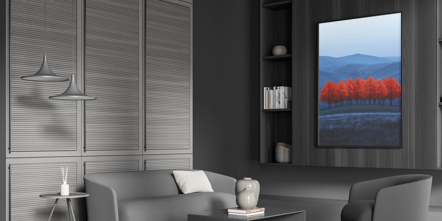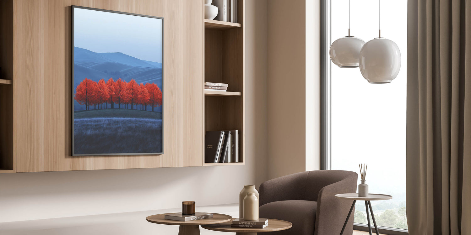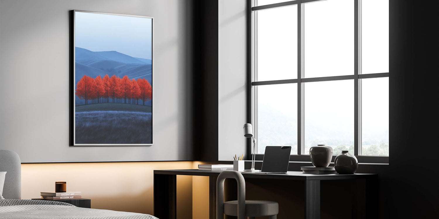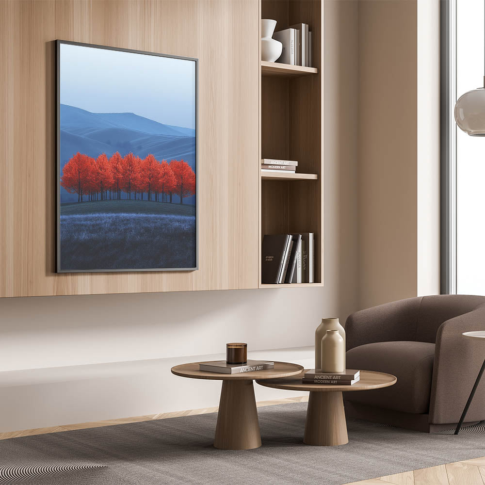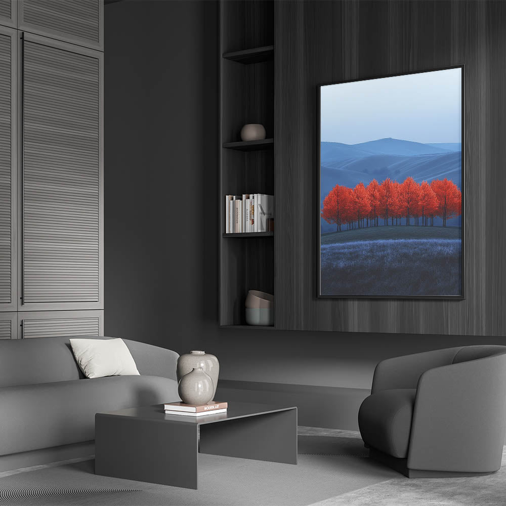 Immerse yourself in the beauty of contrast with this mesmerizing fine art photography canvas print. Featuring a grove of striking red trees set against a rolling blue-toned landscape, this composition blends surreal colors with breathtaking natural beauty.