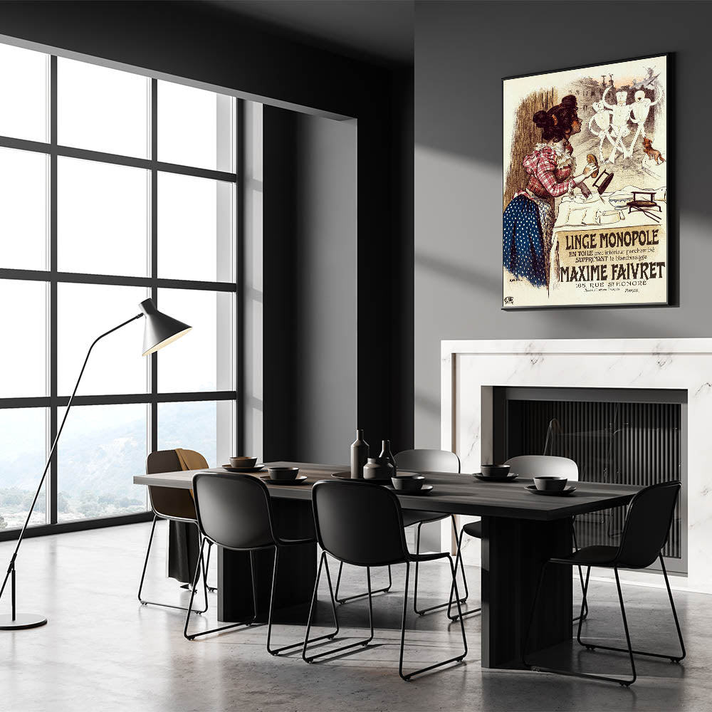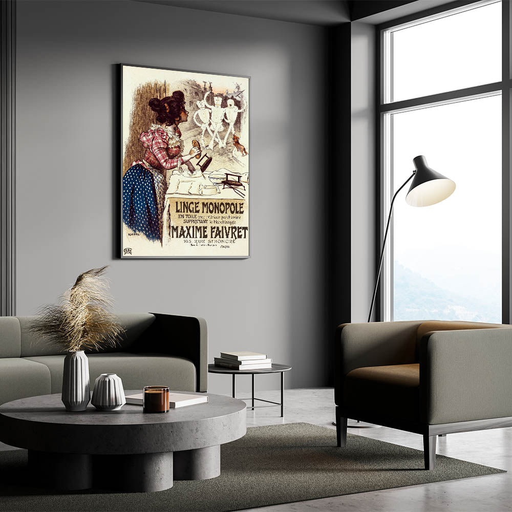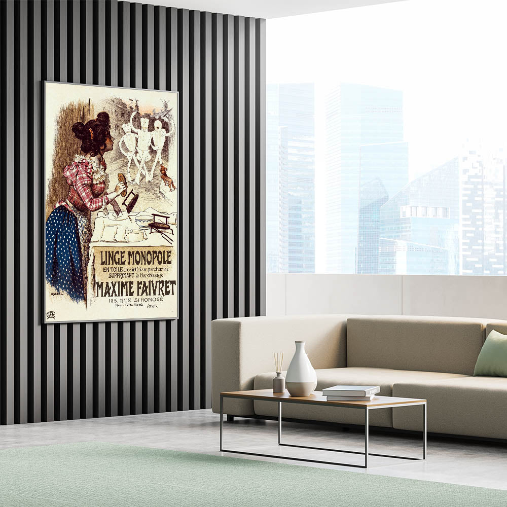 Bring a touch of vintage charm into your home with this vintage advertisement poster for Linge Monopole. Featuring a playful scene of a woman watching animated mannequins, this retro art print combines humor and historical style. With its warm tones and lively characters, the poster promotes the Maxime Faivret laundry service, highlighting its revolutionary textile treatment that eliminated the need for bleaching.