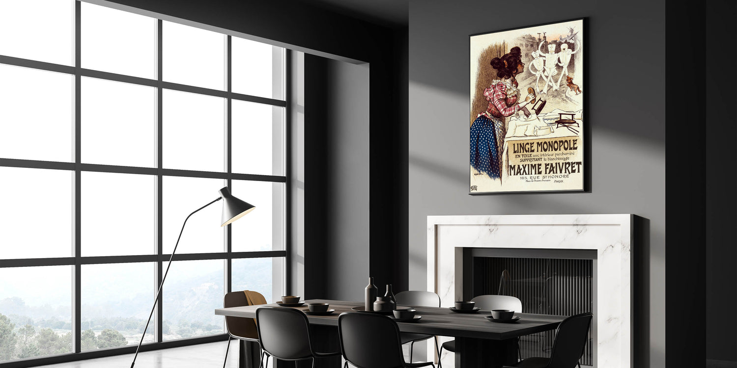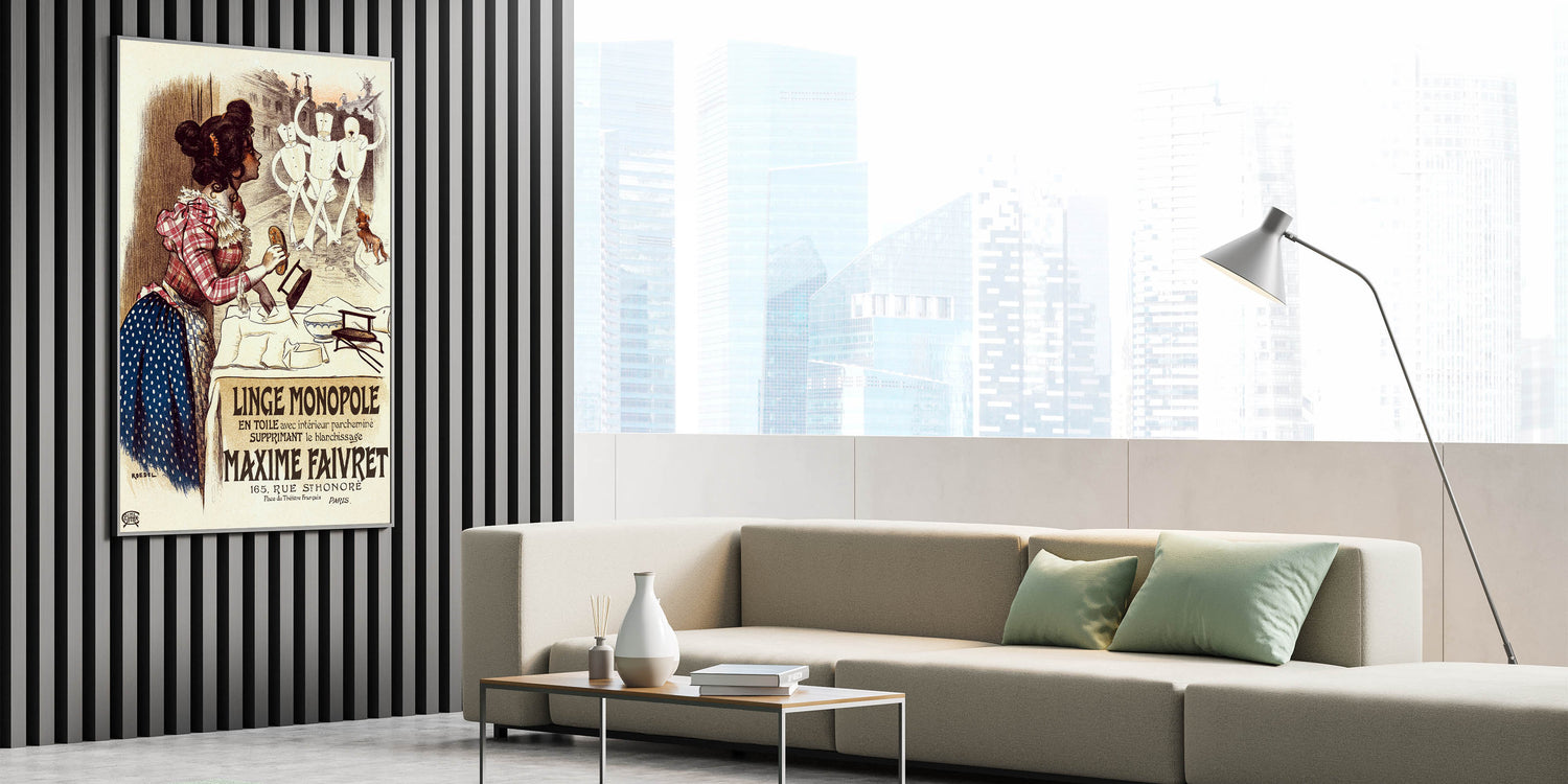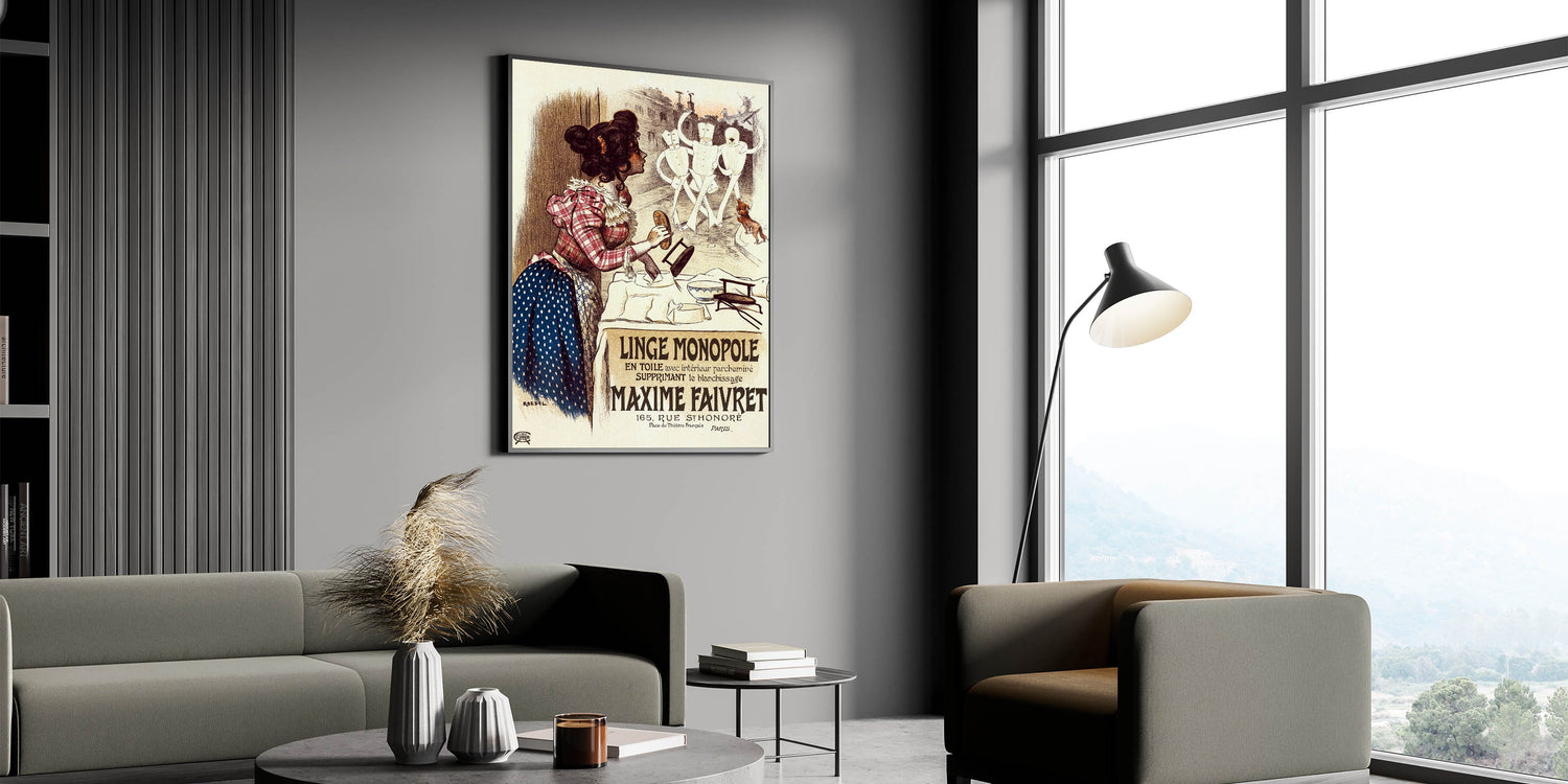 Bring a touch of vintage charm into your home with this vintage advertisement poster for Linge Monopole. Featuring a playful scene of a woman watching animated mannequins, this retro art print combines humor and historical style. With its warm tones and lively characters, the poster promotes the Maxime Faivret laundry service, highlighting its revolutionary textile treatment that eliminated the need for bleaching.