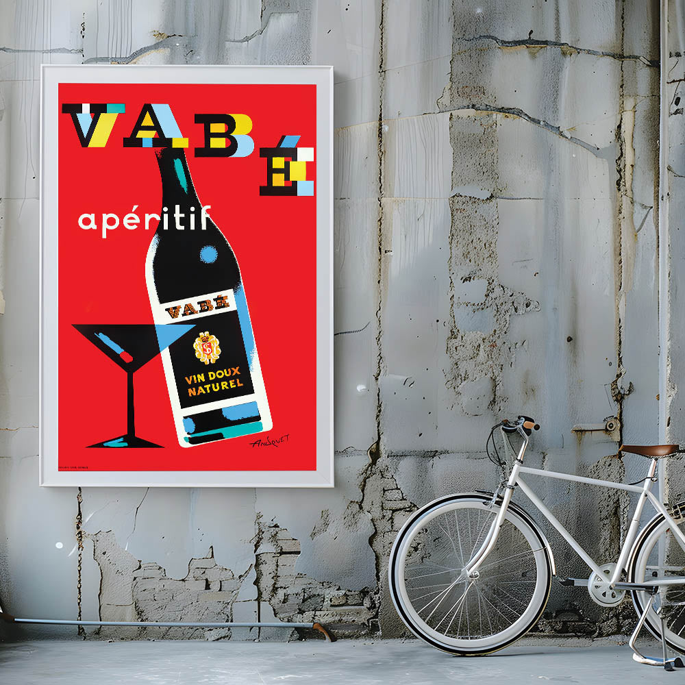 Add a bold, modern touch to your space with this Vabé Apéritif vintage advertising poster. This classic vintage ad showcases a stylish and minimalistic bottle of Vabé Vin Doux Naturel, set against a striking red background with playful typography in blue, yellow, black, and white. The sleek martini glass silhouette adds a contemporary touch, making this nostalgic advertising print a perfect addition to any space.