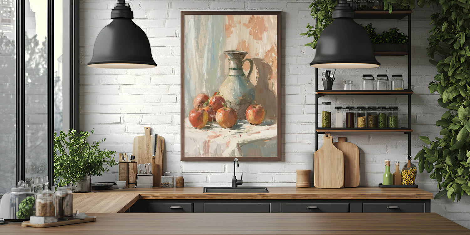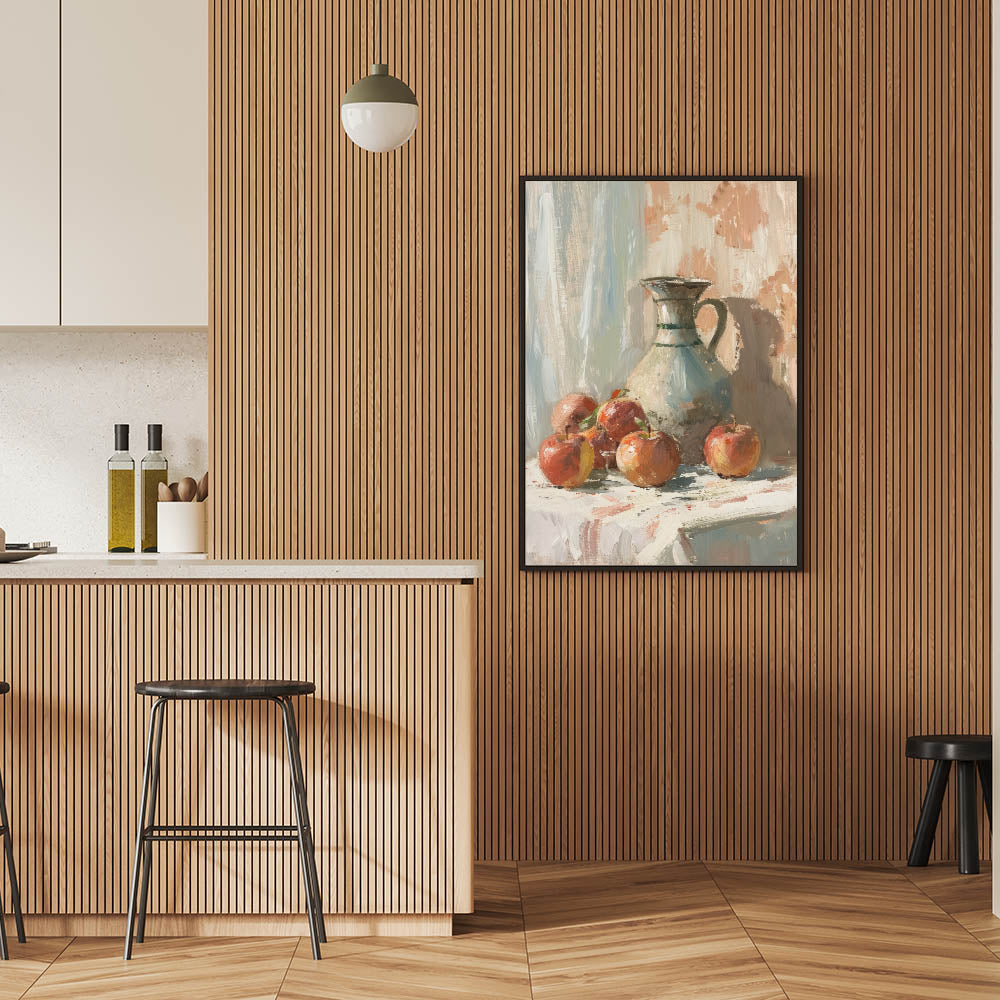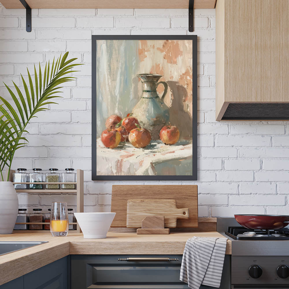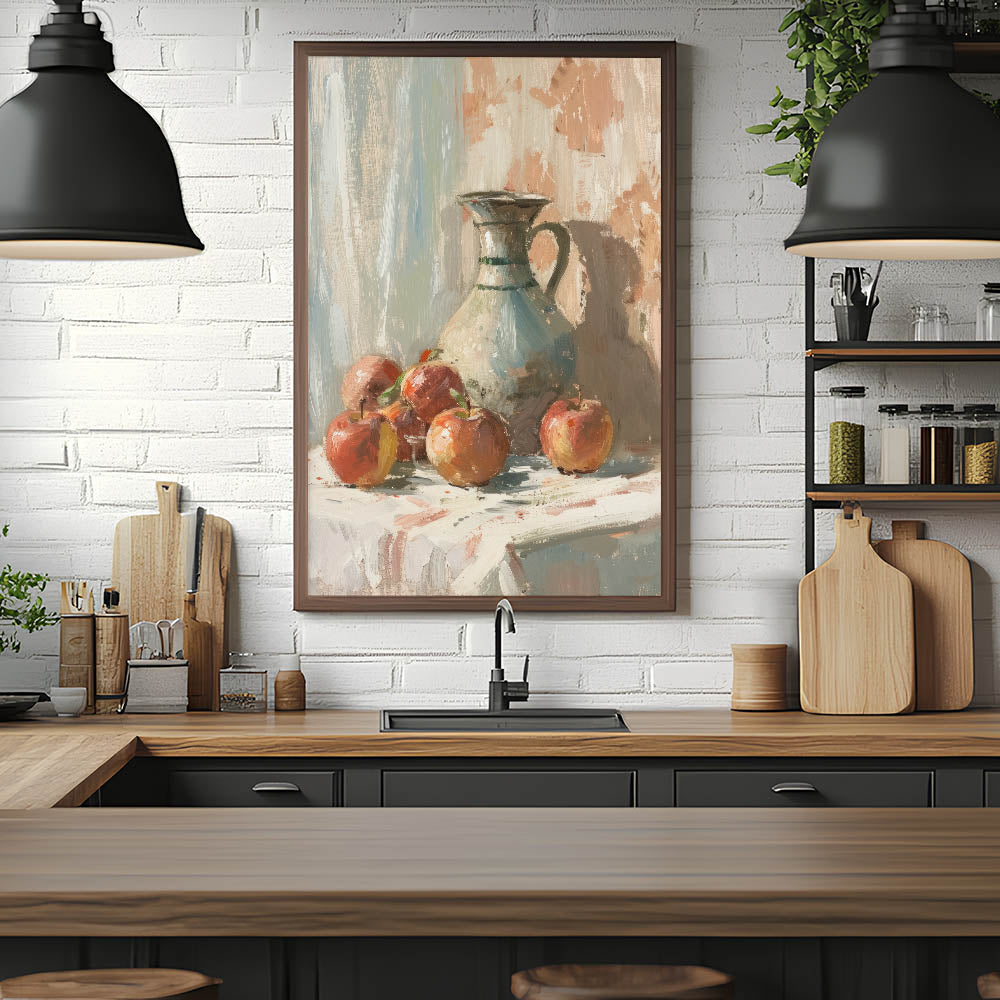 Add a touch of vintage elegance to your space with this Apple Still Life Wall Art. This beautifully detailed fruit painting showcases vibrant red apples beside a classic ceramic jug, set against a soft pastel-toned background with light blue, beige, and peach hues. The warm yet delicate color palette makes this piece a perfect choice for kitchen fruit decor, adding a rustic yet sophisticated charm.