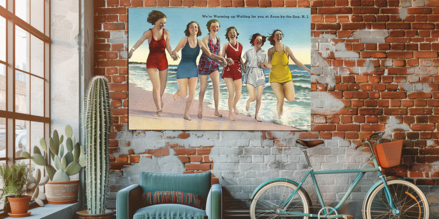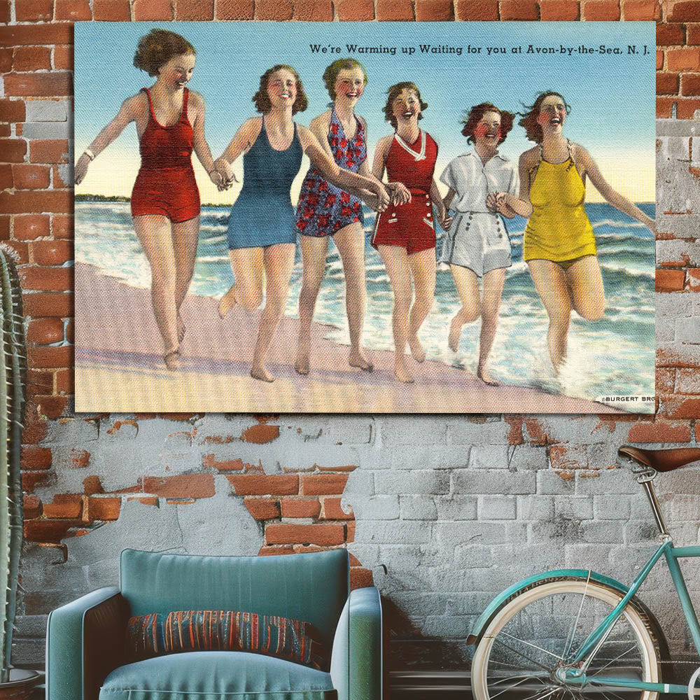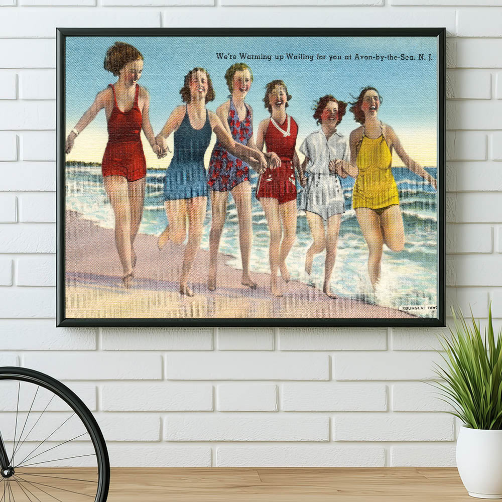 Capture the joy of a summer beach day with this vintage Avon-by-the-Sea travel poster. Featuring a lively scene of women in vintage swimsuits walking along the shore, this retro tourism art brings the nostalgic spirit of the 1930s seaside getaway to life. Whether you're drawn to vintage aesthetics or the charm of classic beach vacations, this timeless travel art is a perfect addition to your decor.