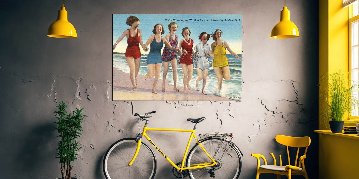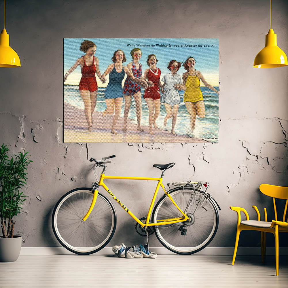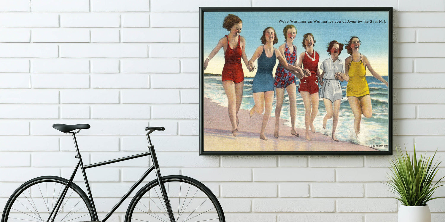 Capture the joy of a summer beach day with this vintage Avon-by-the-Sea travel poster. Featuring a lively scene of women in vintage swimsuits walking along the shore, this retro tourism art brings the nostalgic spirit of the 1930s seaside getaway to life. Whether you're drawn to vintage aesthetics or the charm of classic beach vacations, this timeless travel art is a perfect addition to your decor.