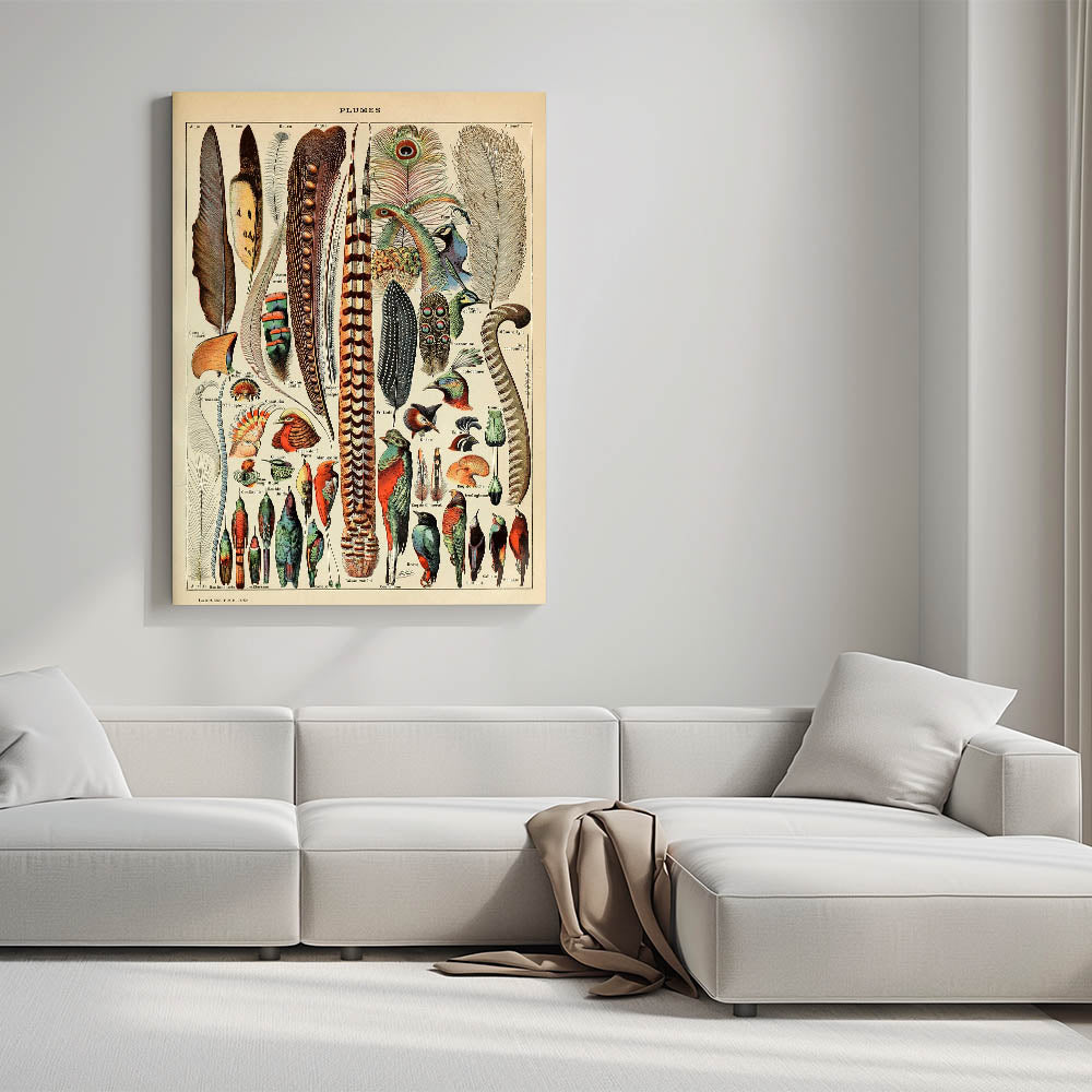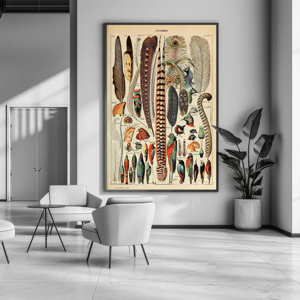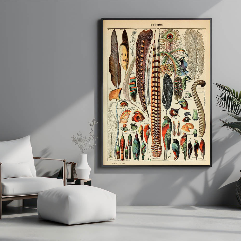 Bring the vibrancy of nature into your home with our Vintage Bird Feathers Illustration from the Nature Elements wall art collection. This stunning print features a variety of bird feathers, showcasing their unique patterns and rich colors. Perfect for bird lovers and nature enthusiasts, this artwork captures the elegance and diversity of avian life.