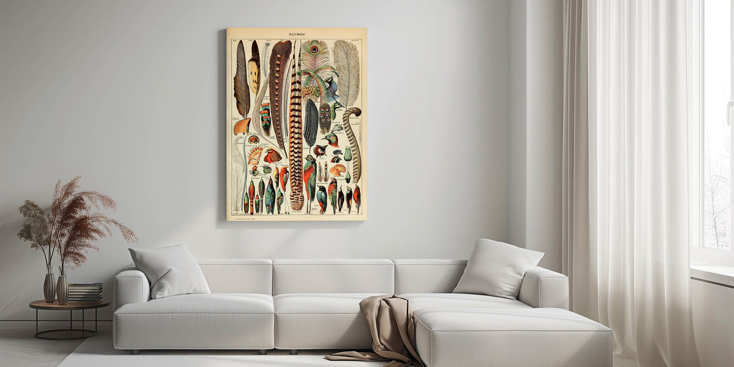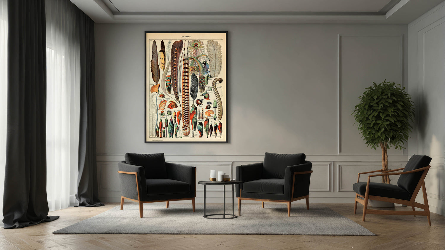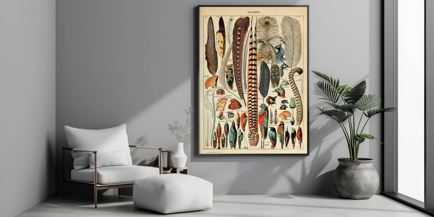 Bring the vibrancy of nature into your home with our Vintage Bird Feathers Illustration from the Nature Elements wall art collection. This stunning print features a variety of bird feathers, showcasing their unique patterns and rich colors. Perfect for bird lovers and nature enthusiasts, this artwork captures the elegance and diversity of avian life.