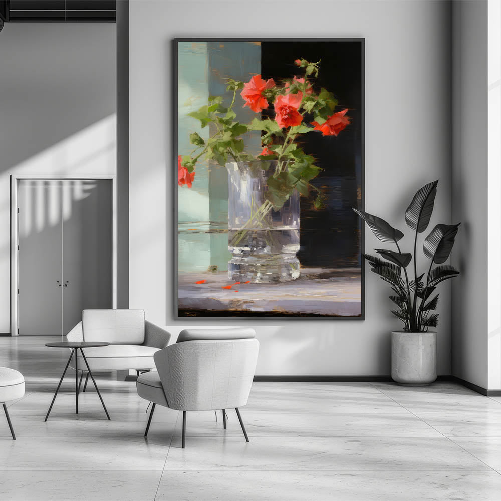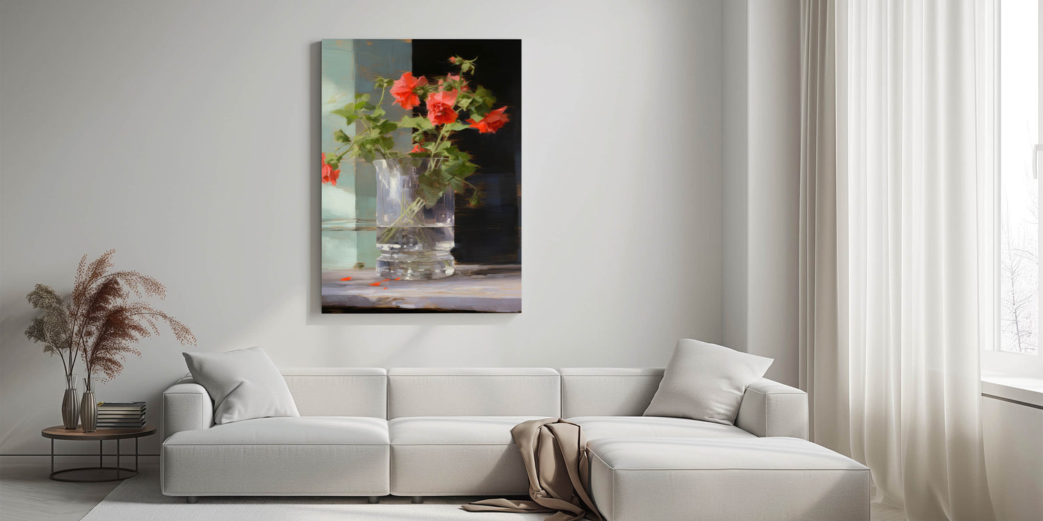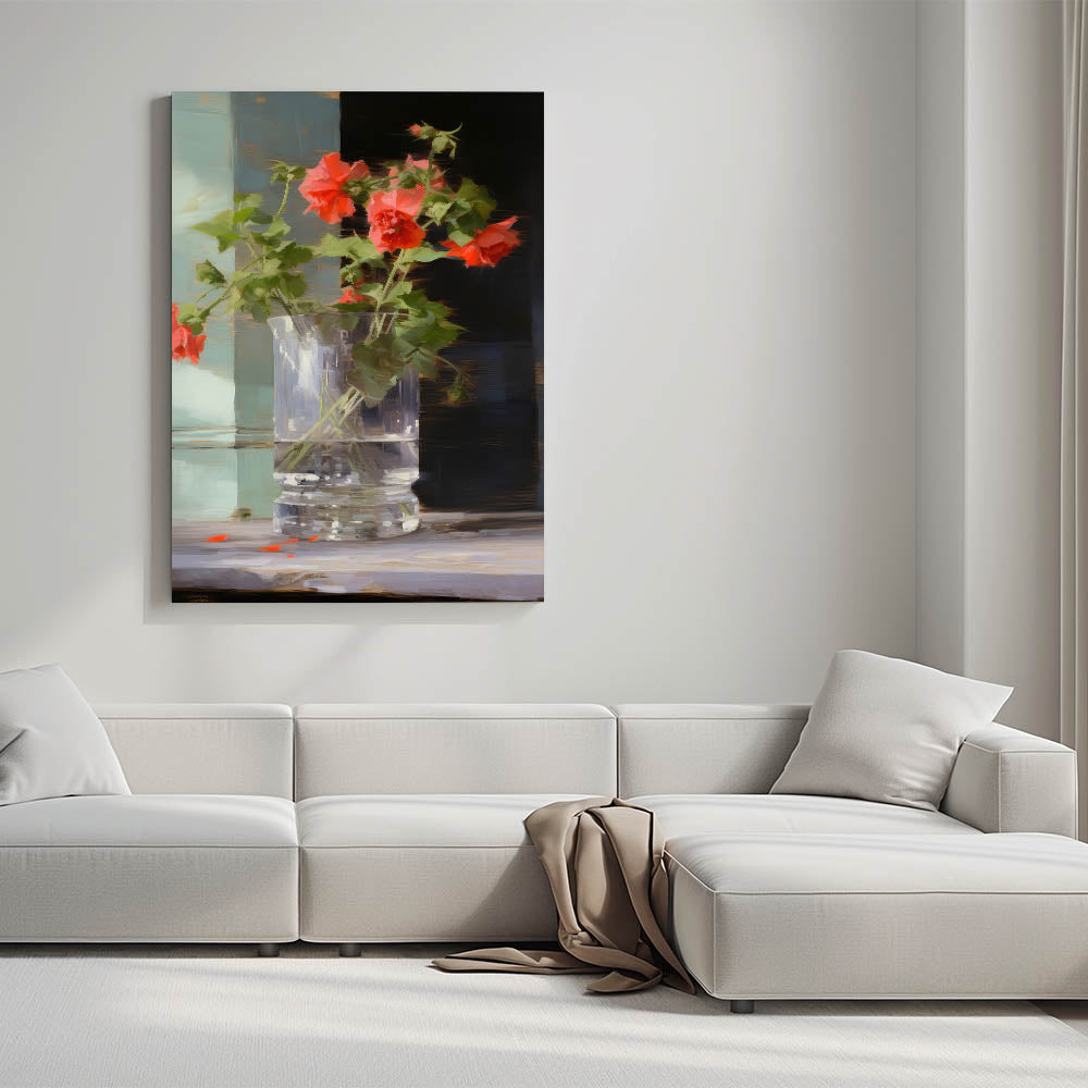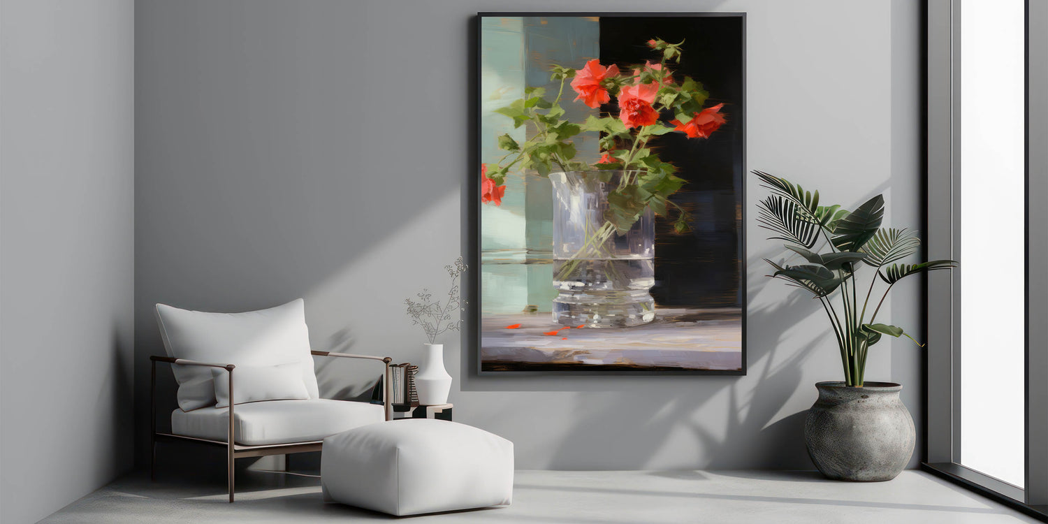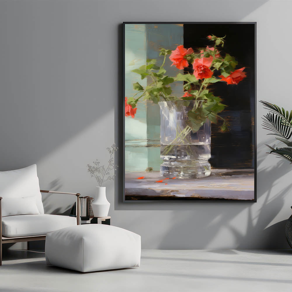 Add a touch of warmth and color to your décor with this vintage botanical art print featuring vibrant red flowers in a glass vase. The dynamic contrast between the vivid flowers and the soft, neutral background creates a striking yet calming piece that brings nature’s beauty into any room.