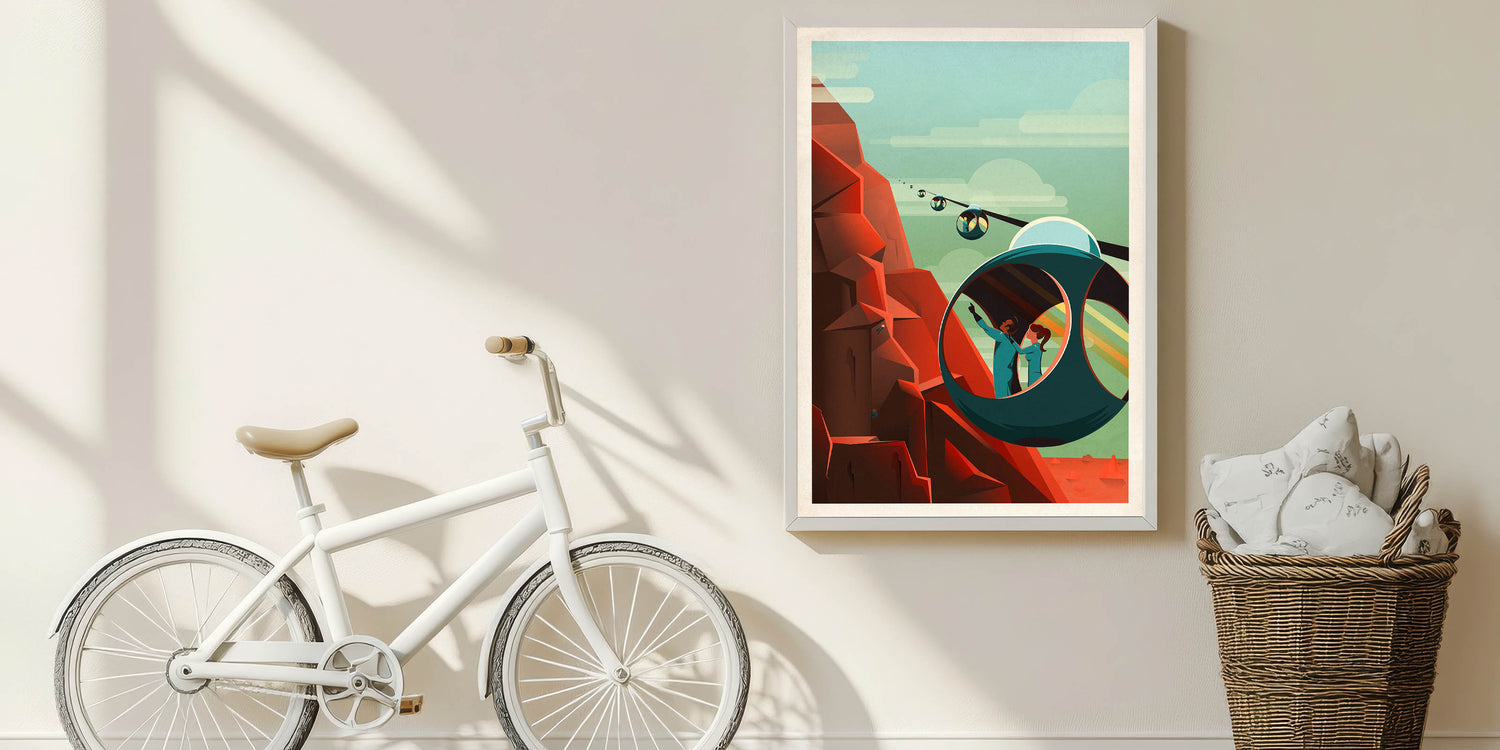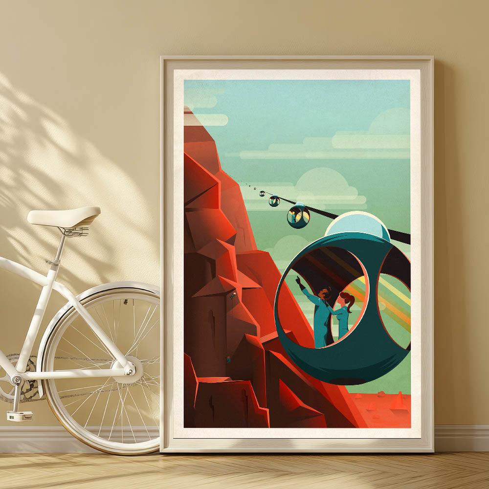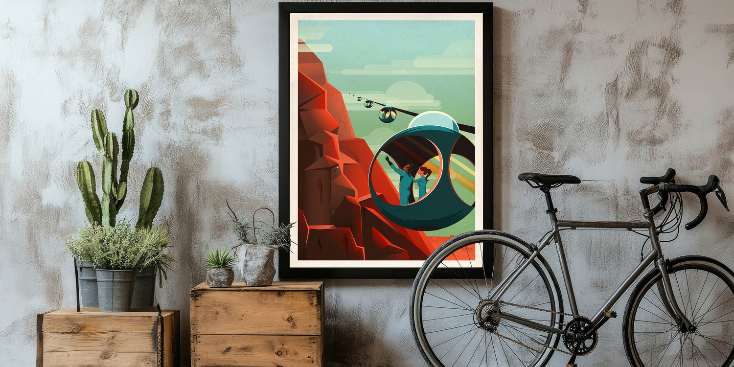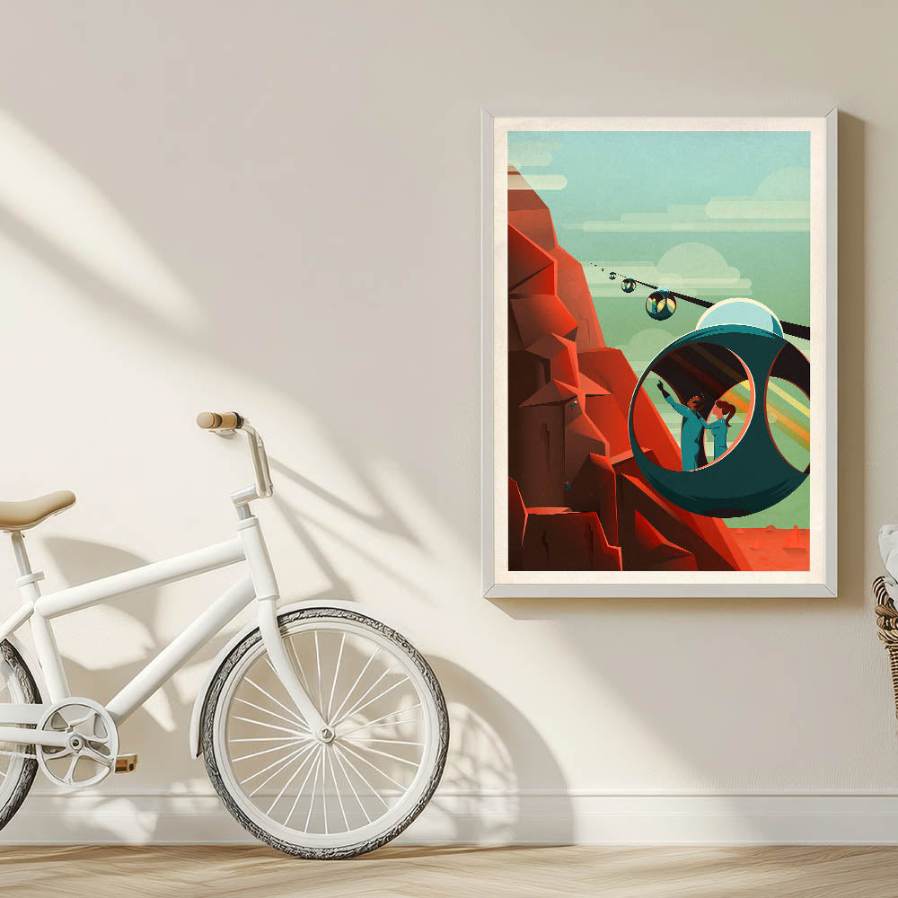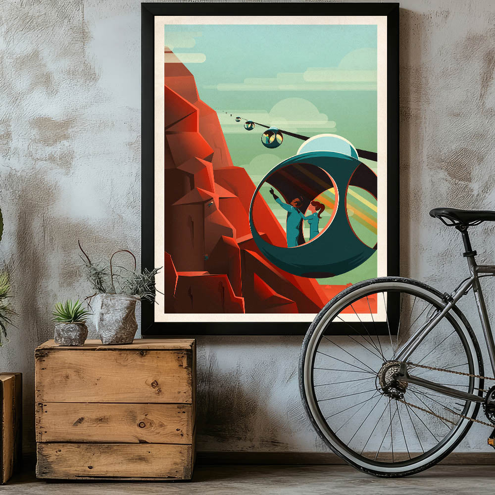 Experience the thrill of a scenic adventure with this Vintage Cable Car Adventure Poster. The artwork features a stunning view of travelers soaring through the sky in futuristic cable cars, set against a vibrant red rock landscape. The bold, geometric design and colorful details capture the excitement of travel and exploration, making this retro travel print an ideal addition to any space. Whether you're an adventure enthusiast or a fan of vintage tourism illustrations, this piece will transport you to a time of boundless discovery and exploration.
