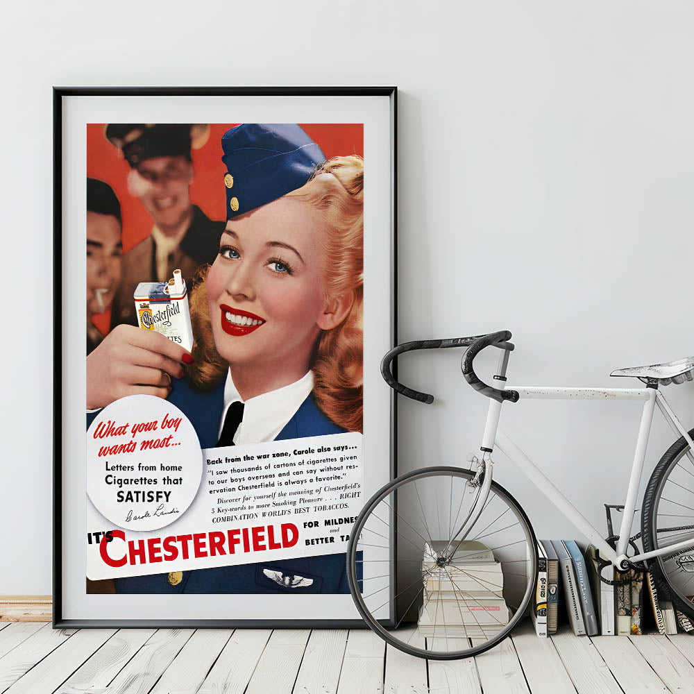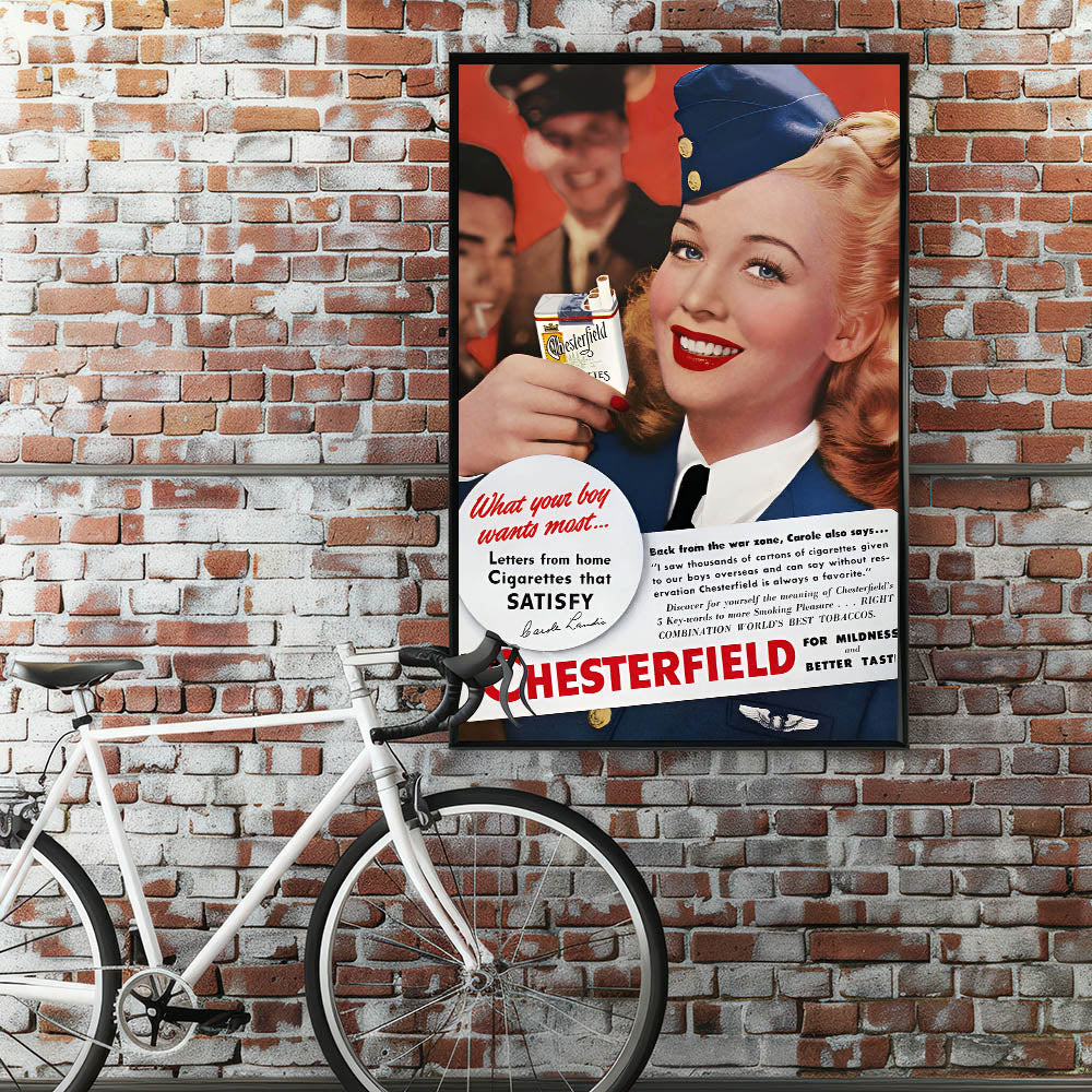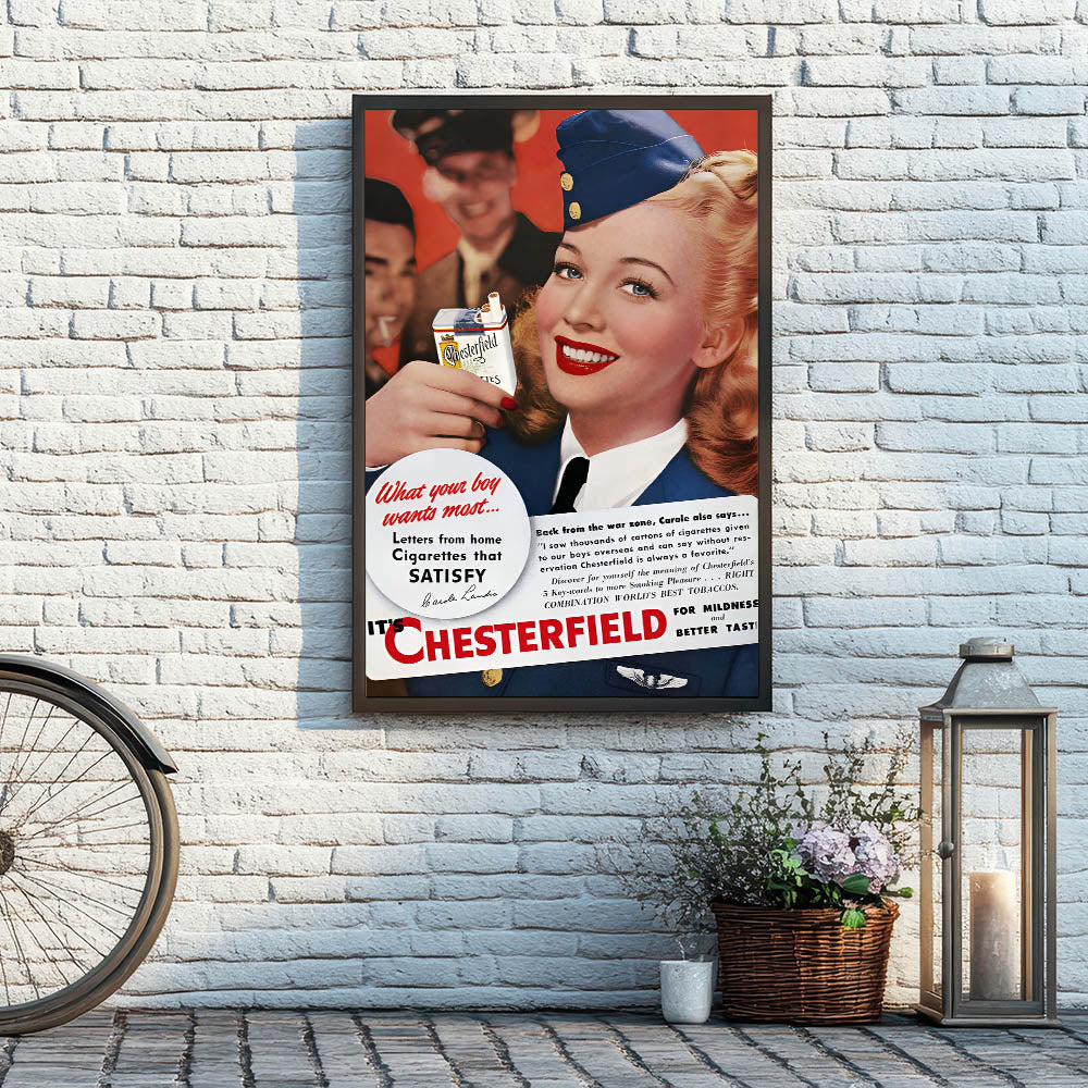 Bring home the charm of this vintage Chesterfield ad, a nod to the glamour and bold advertising of the past. This piece is sure to stand out in any retro-inspired collection.