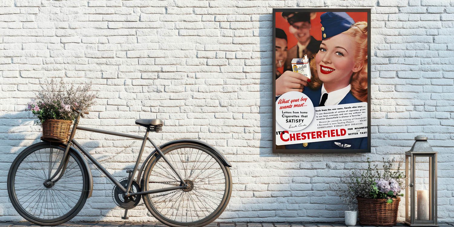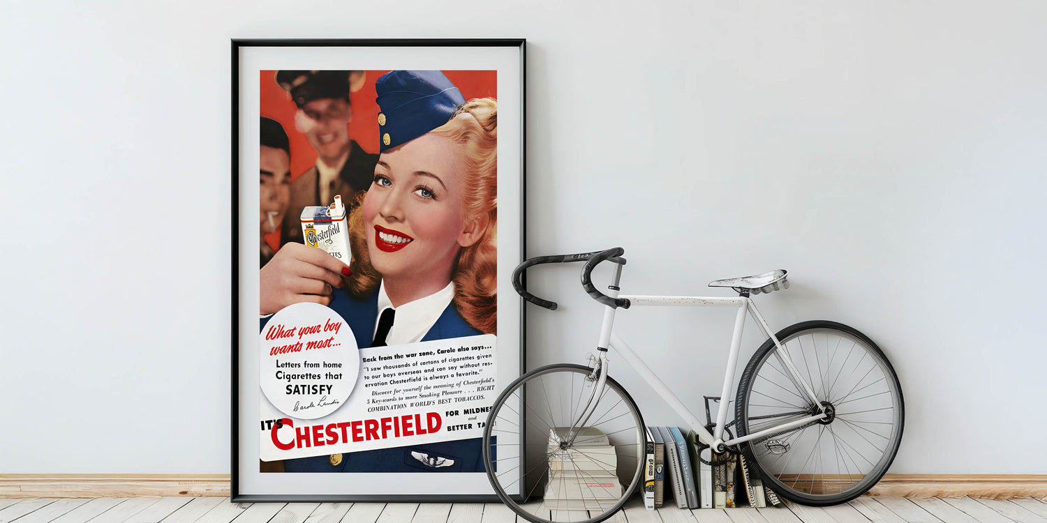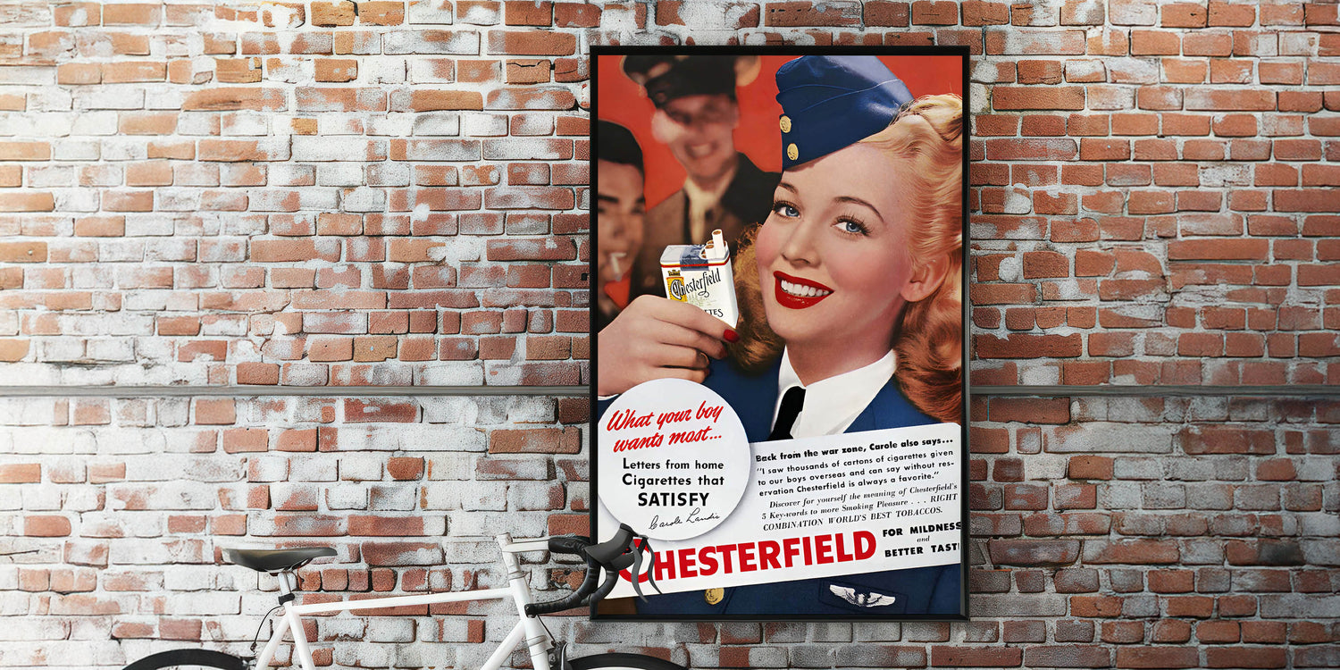 Bring home the charm of this vintage Chesterfield ad, a nod to the glamour and bold advertising of the past. This piece is sure to stand out in any retro-inspired collection.