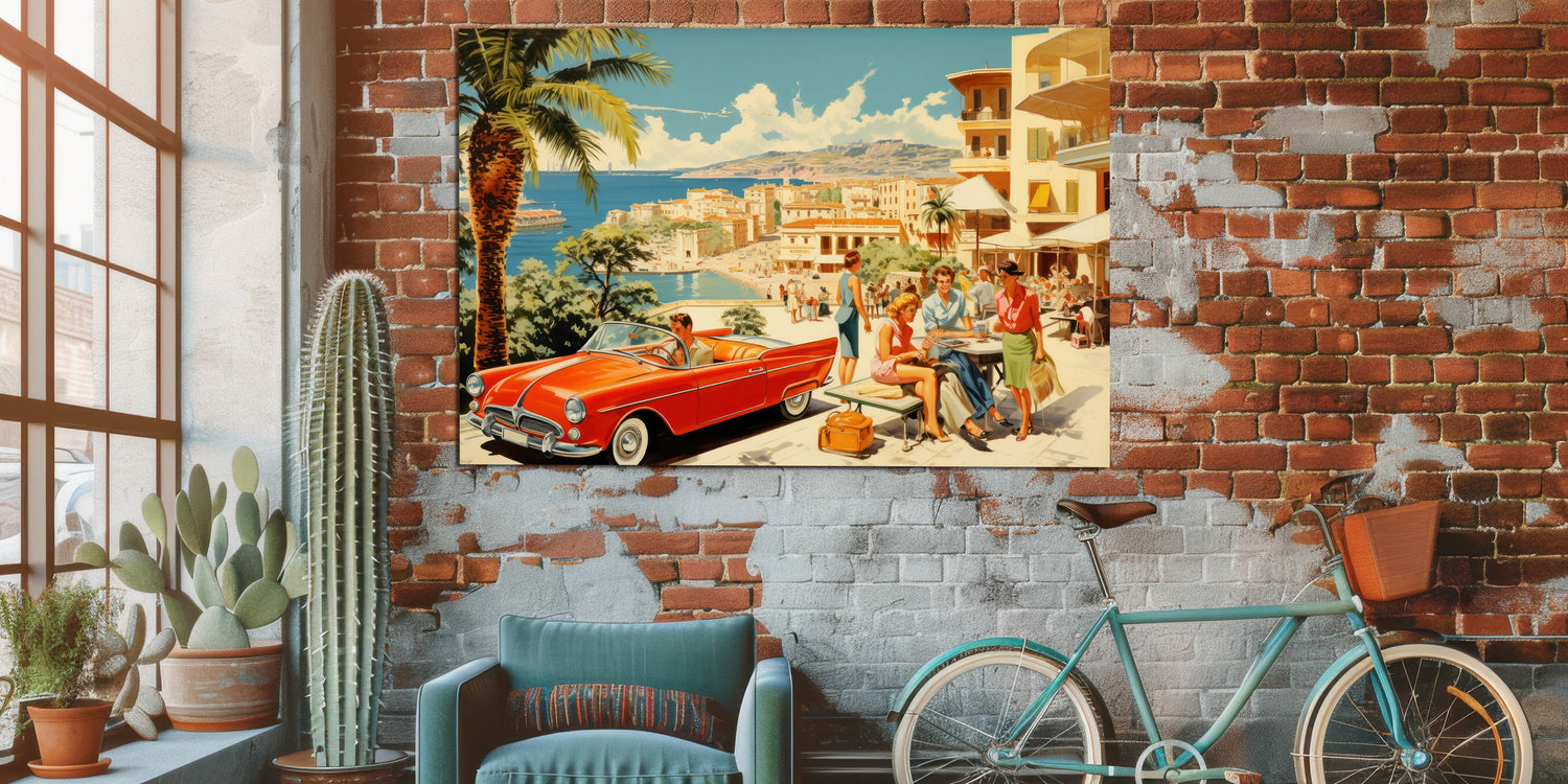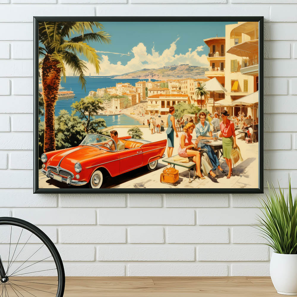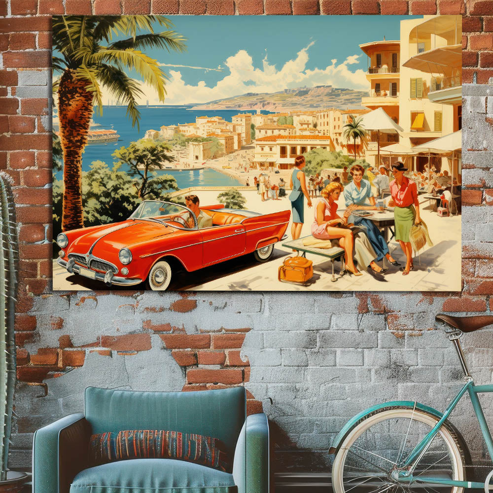 Step into the glamour of a vintage seaside escape with this stunning travel poster. Featuring a vibrant red convertible, fashionable travelers, and a picturesque coastal backdrop, this artwork evokes the elegance and carefree spirit of mid-century vacations. With its beautiful blend of soft blues, sandy beaches, and bright pops of color, it’s perfect for anyone who appreciates retro travel art and idyllic holiday scenes.