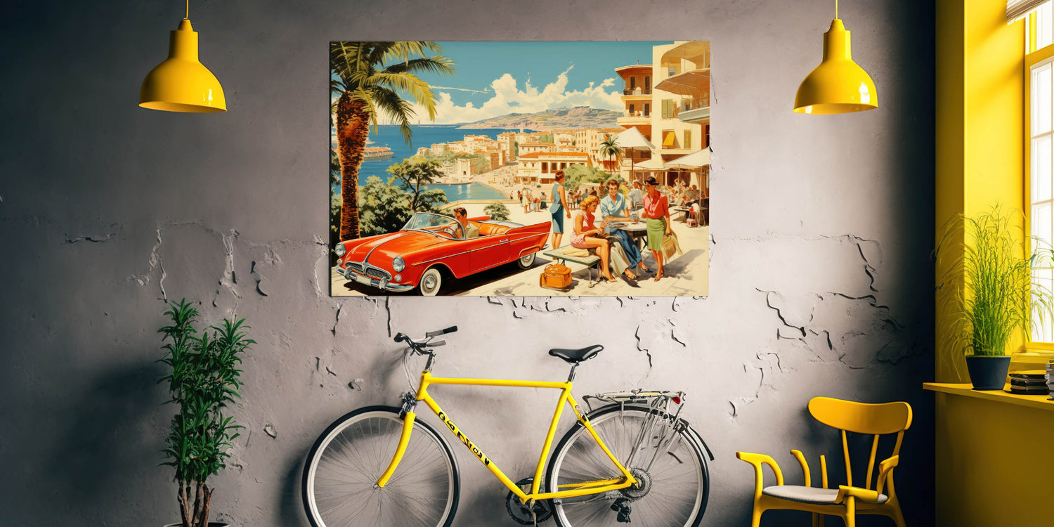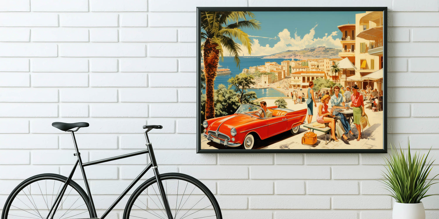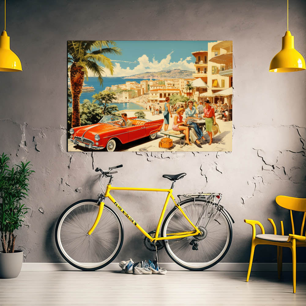Step into the glamour of a vintage seaside escape with this stunning travel poster. Featuring a vibrant red convertible, fashionable travelers, and a picturesque coastal backdrop, this artwork evokes the elegance and carefree spirit of mid-century vacations. With its beautiful blend of soft blues, sandy beaches, and bright pops of color, it’s perfect for anyone who appreciates retro travel art and idyllic holiday scenes.