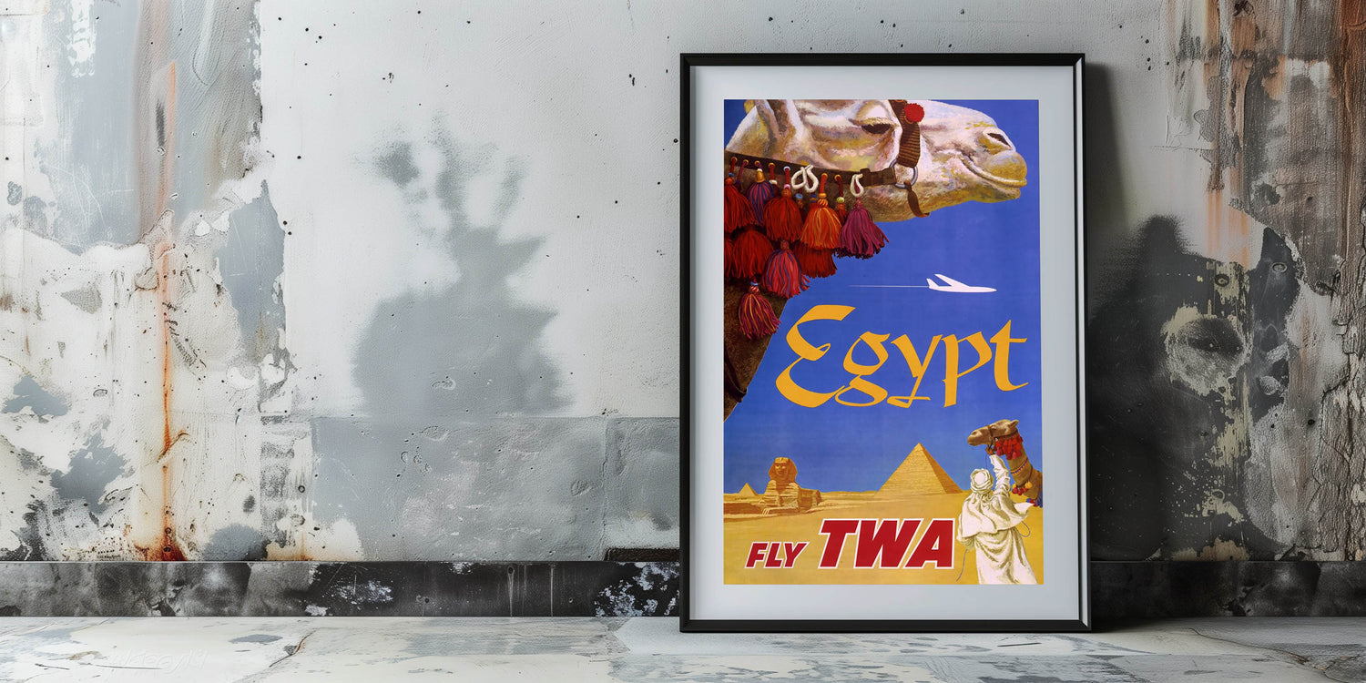 Step back into the golden age of air travel with this Vintage Egypt Travel Poster, featuring the majestic pyramids, the Sphinx, and a regal camel adorned with vibrant tassels. Created for TWA, this retro travel print captures the allure of Egypt’s deserts and ancient wonders. The bold typography and vivid colors of blue, yellow, and red make it an eye-catching piece for fans of classic travel decor and authentic vintage travel art.
