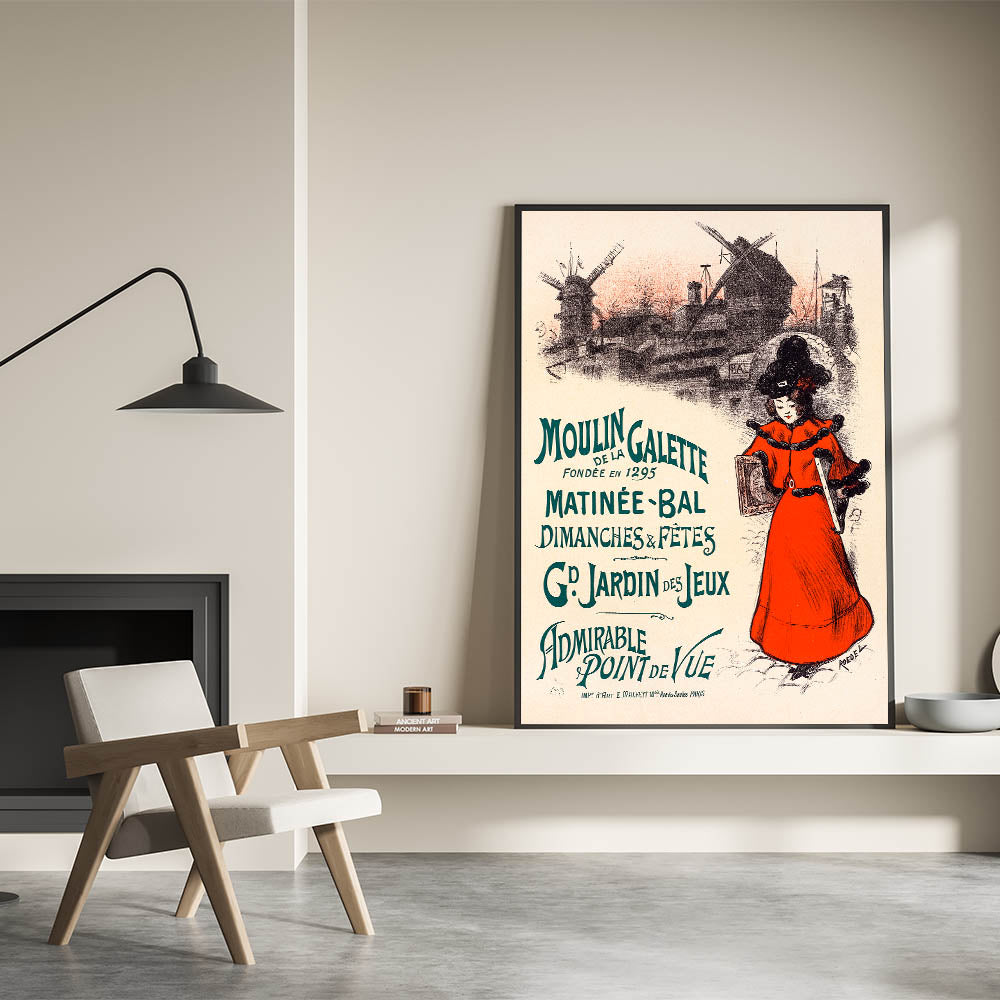 Step into the lively world of Parisian entertainment with this vintage exhibition poster for Moulin de la Galette. Depicting the iconic windmill and a fashionable figure in a red dress, the poster promotes the matinee balls and festivities at this famous location. With its vibrant colors and detailed illustration, it captures the charm of Montmartre and the vibrant nightlife of early 20th-century Paris.