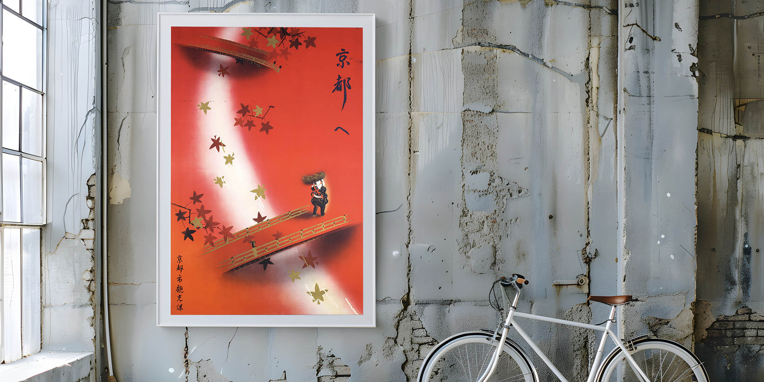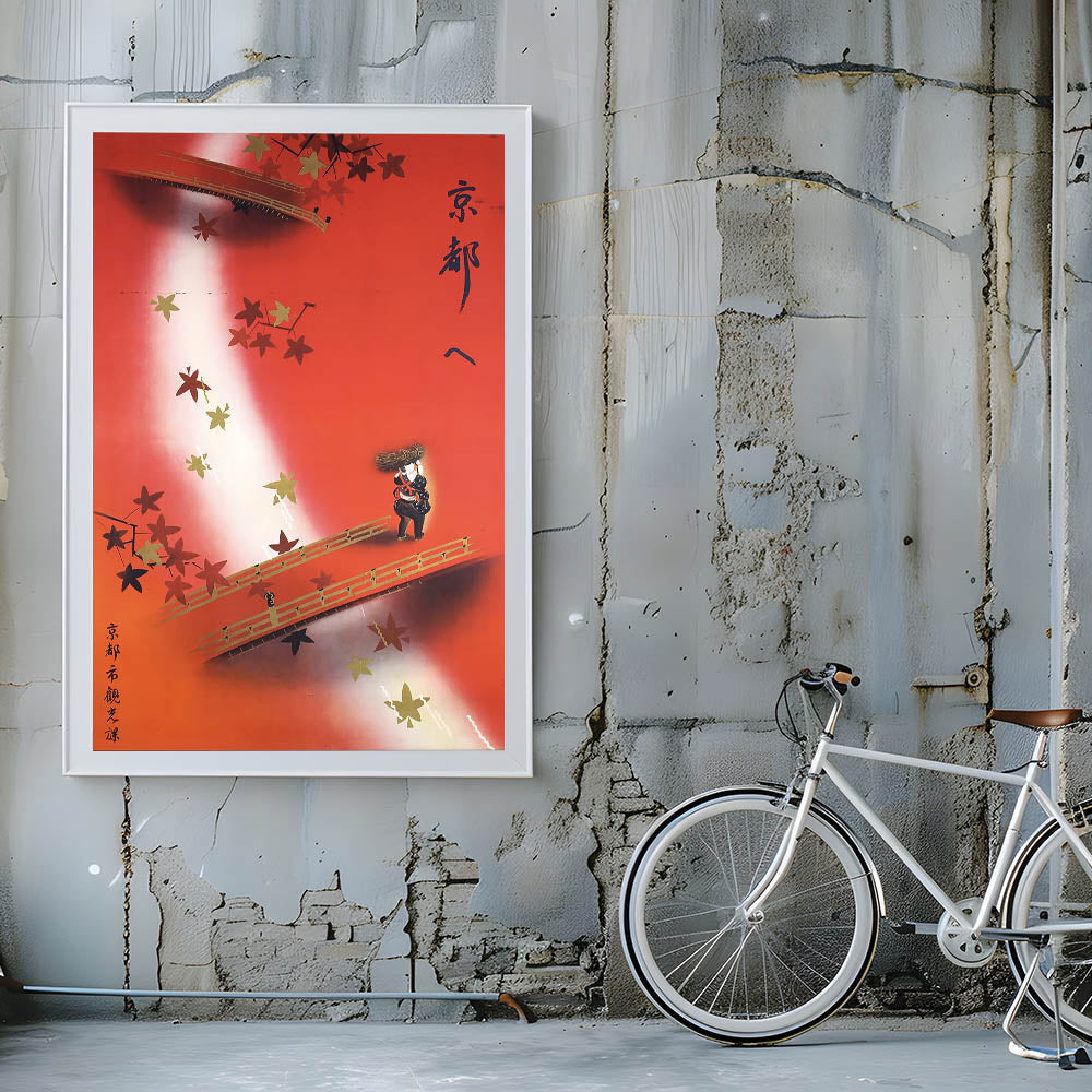 Experience the serene beauty of Kyoto in autumn with this Vintage Kyoto Travel Poster. Featuring a graceful bridge adorned with golden and red maple leaves, this retro travel print captures the essence of traditional Japanese elegance. A lone figure carrying a basket adds a touch of nostalgia and depth to the scene, set against a warm gradient of red and white. The intricate details and soft hues make it a perfect piece for fans of classic travel decor and authentic vintage travel art.