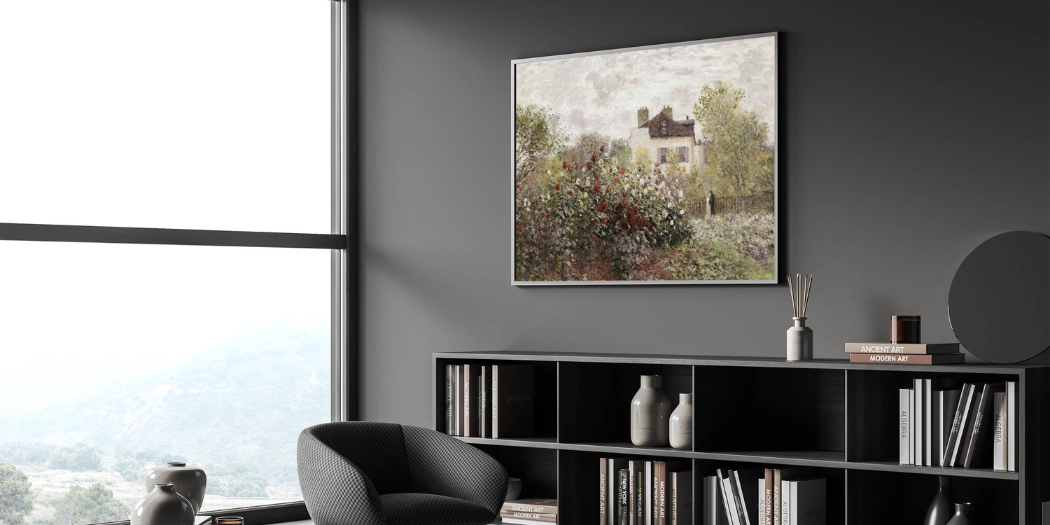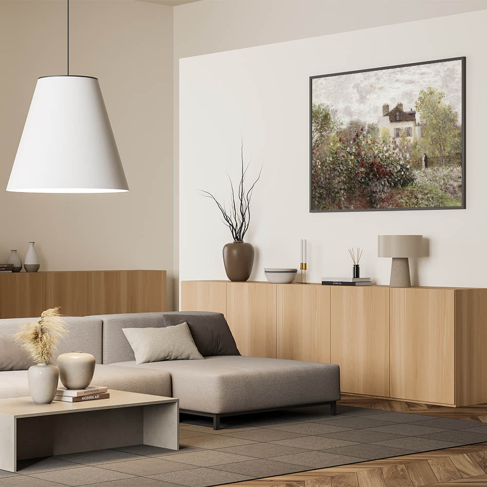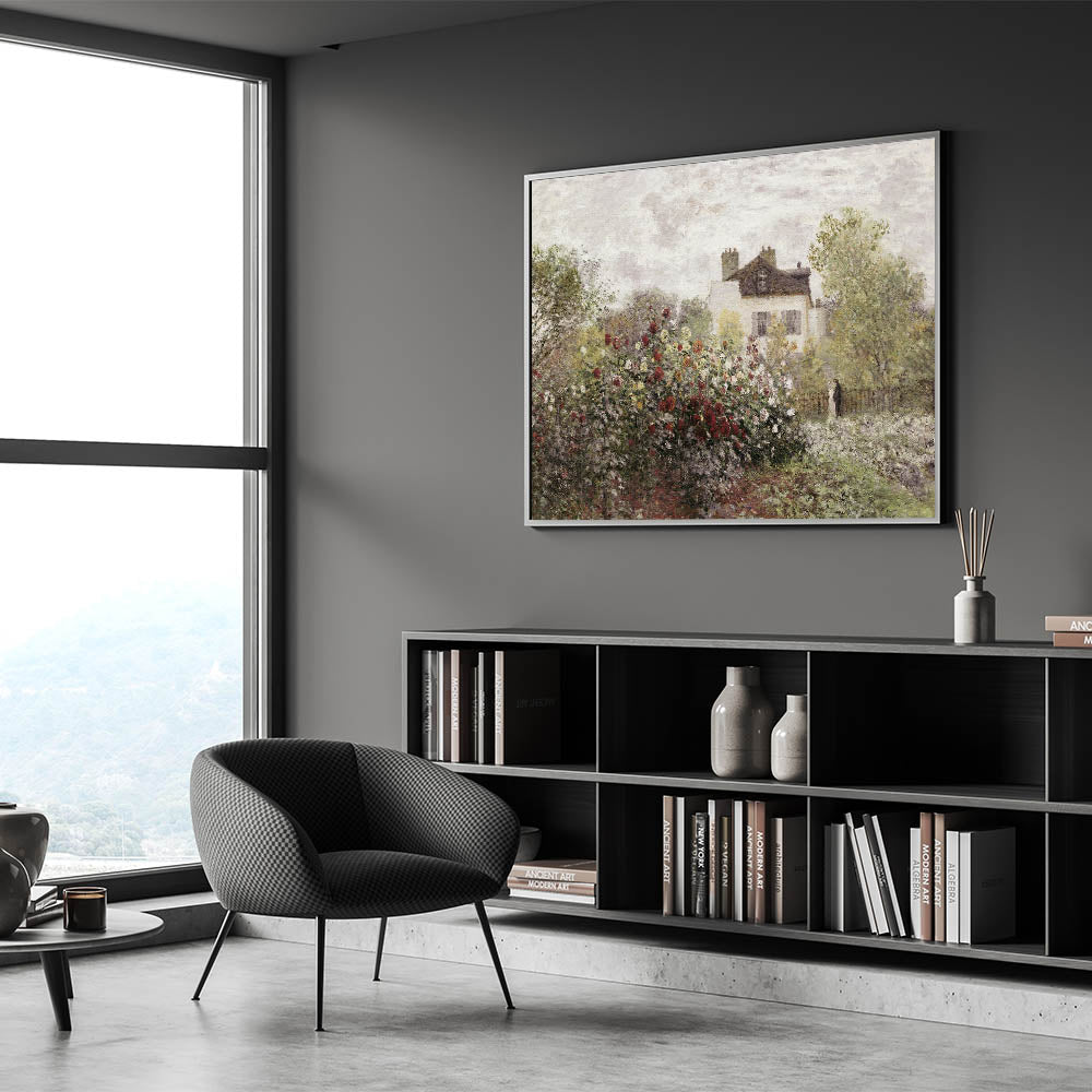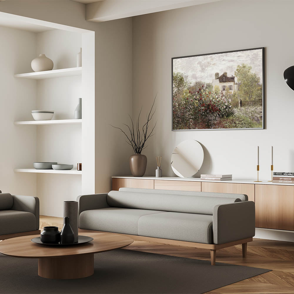 This Vintage Landscape Art captures the charm of a quaint garden in full bloom, set against a picturesque house. The vibrant flowers, ranging from deep reds to soft whites, create a timeless scene of peaceful countryside living. This Classic Landscape Print embodies the serene beauty of a well-tended garden, offering a nostalgic glimpse into a simpler, more peaceful time.