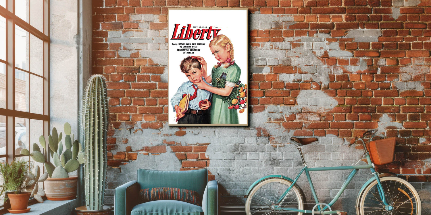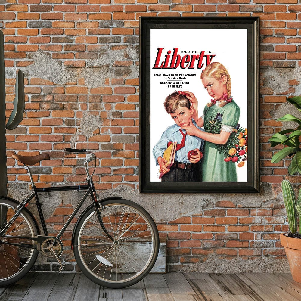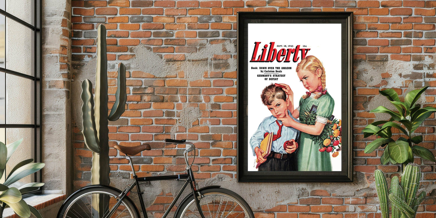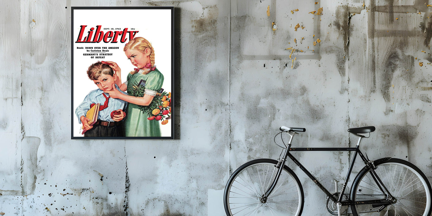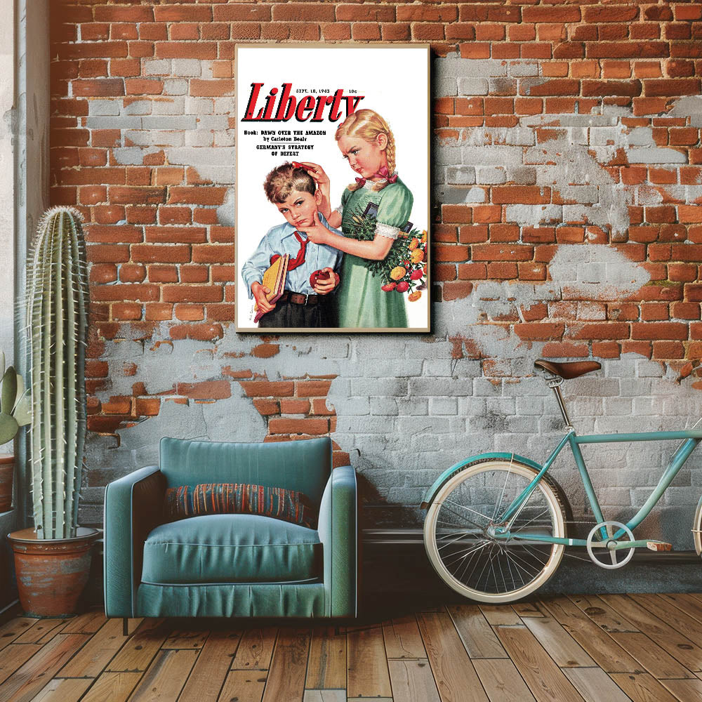 Step back into 1940s Americana with this vintage magazine cover wall art from Liberty magazine. This classic magazine cover artwork features a charming and humorous school-themed illustration of a young girl fixing a boy’s hair, evoking childhood nostalgia and the innocence of a bygone era. The vibrant colors and heartwarming composition make this a standout piece for any collection of nostalgic vintage decor prints.