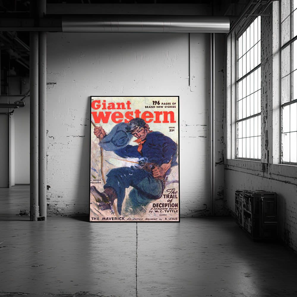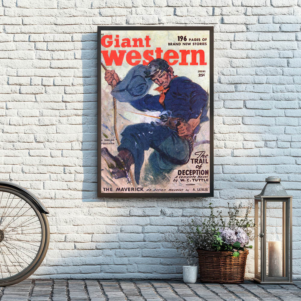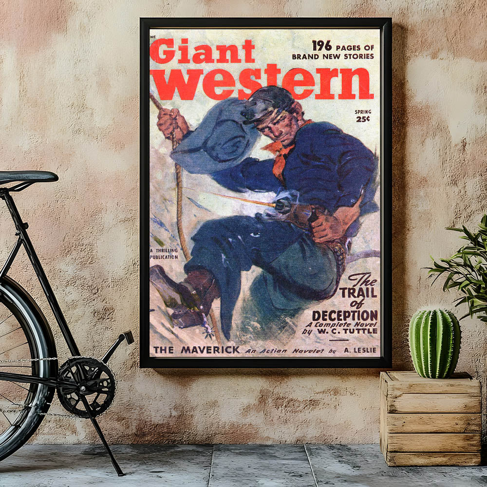 Experience the thrill of the Wild West with this vintage magazine cover wall art featuring a dramatic cowboy escape scene. This classic magazine cover artwork captures a rugged cowboy gripping a rope as he navigates a dangerous descent, embodying the adventure and suspense of classic Western tales. The rich color palette and dynamic action make this an eye-catching addition to any nostalgic vintage decor prints collection.