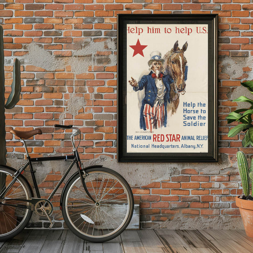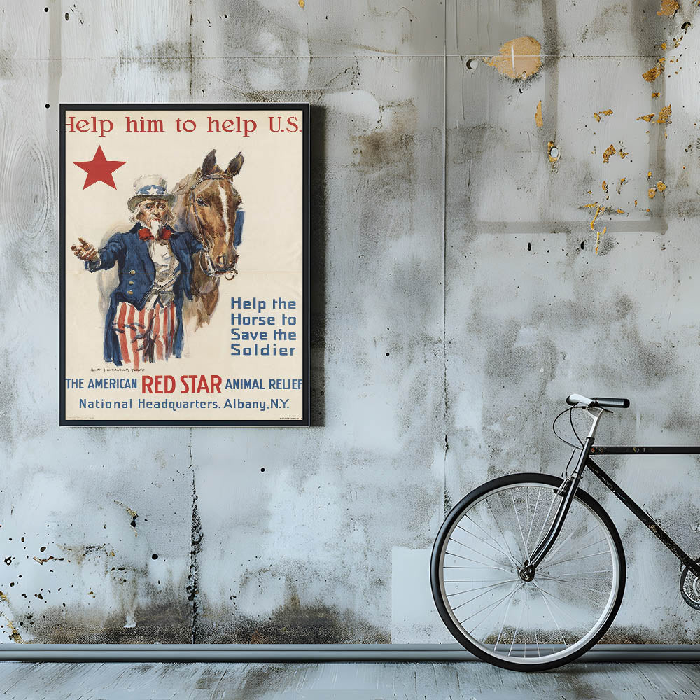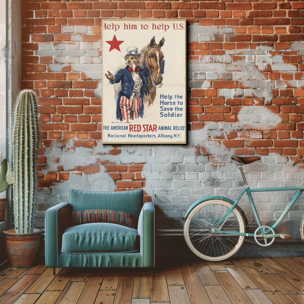 Step back in time with our Vintage Patriotic Poster - Uncle Sam American War Art. This classic travel art captures the spirit of World War I-era patriotism, featuring Uncle Sam alongside a noble horse, emphasizing the message of supporting soldiers. With its bold red, white, and blue tones, this nostalgic travel print brings history to life, making it a striking addition to any space. The vintage-inspired design and intricate details reflect the authentic charm of heritage travel illustrations and classic vacation posters.