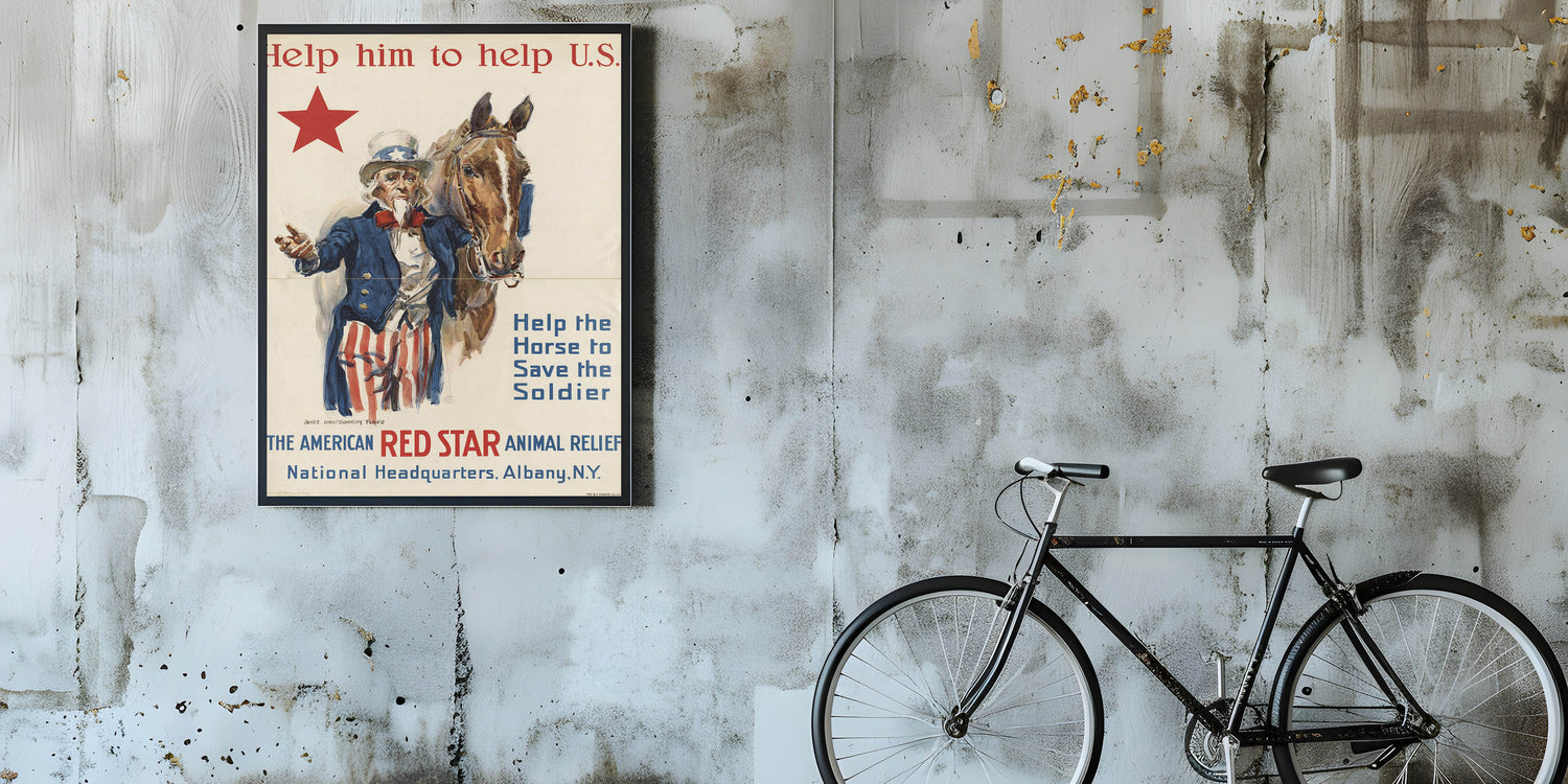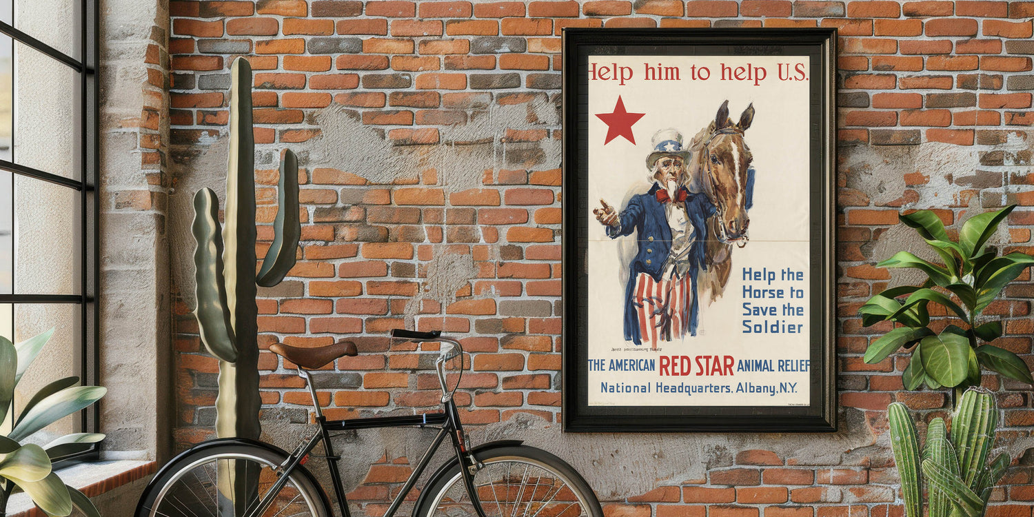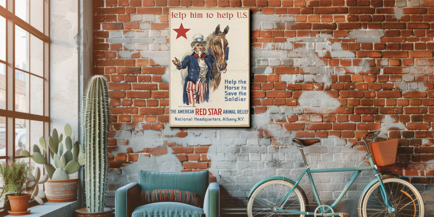 Step back in time with our Vintage Patriotic Poster - Uncle Sam American War Art. This classic travel art captures the spirit of World War I-era patriotism, featuring Uncle Sam alongside a noble horse, emphasizing the message of supporting soldiers. With its bold red, white, and blue tones, this nostalgic travel print brings history to life, making it a striking addition to any space. The vintage-inspired design and intricate details reflect the authentic charm of heritage travel illustrations and classic vacation posters.
