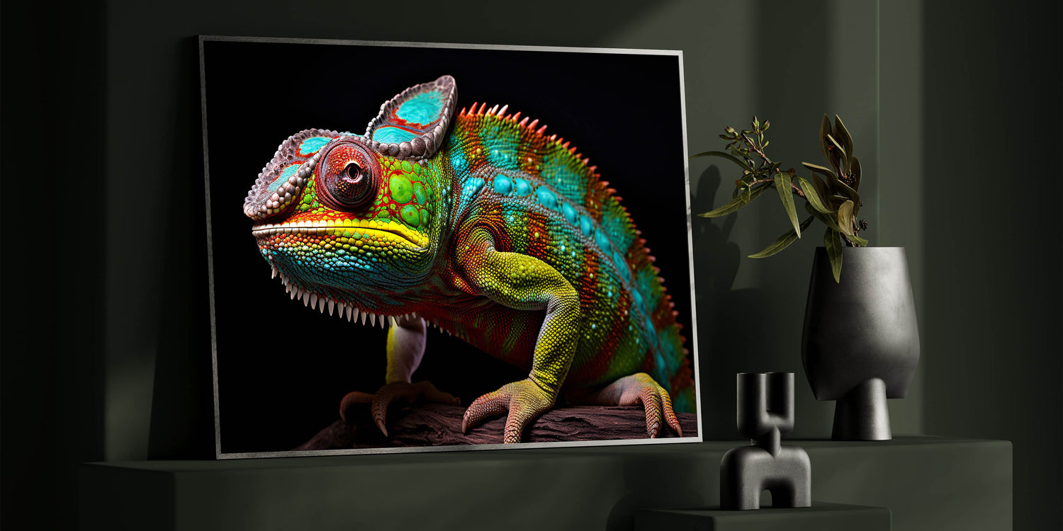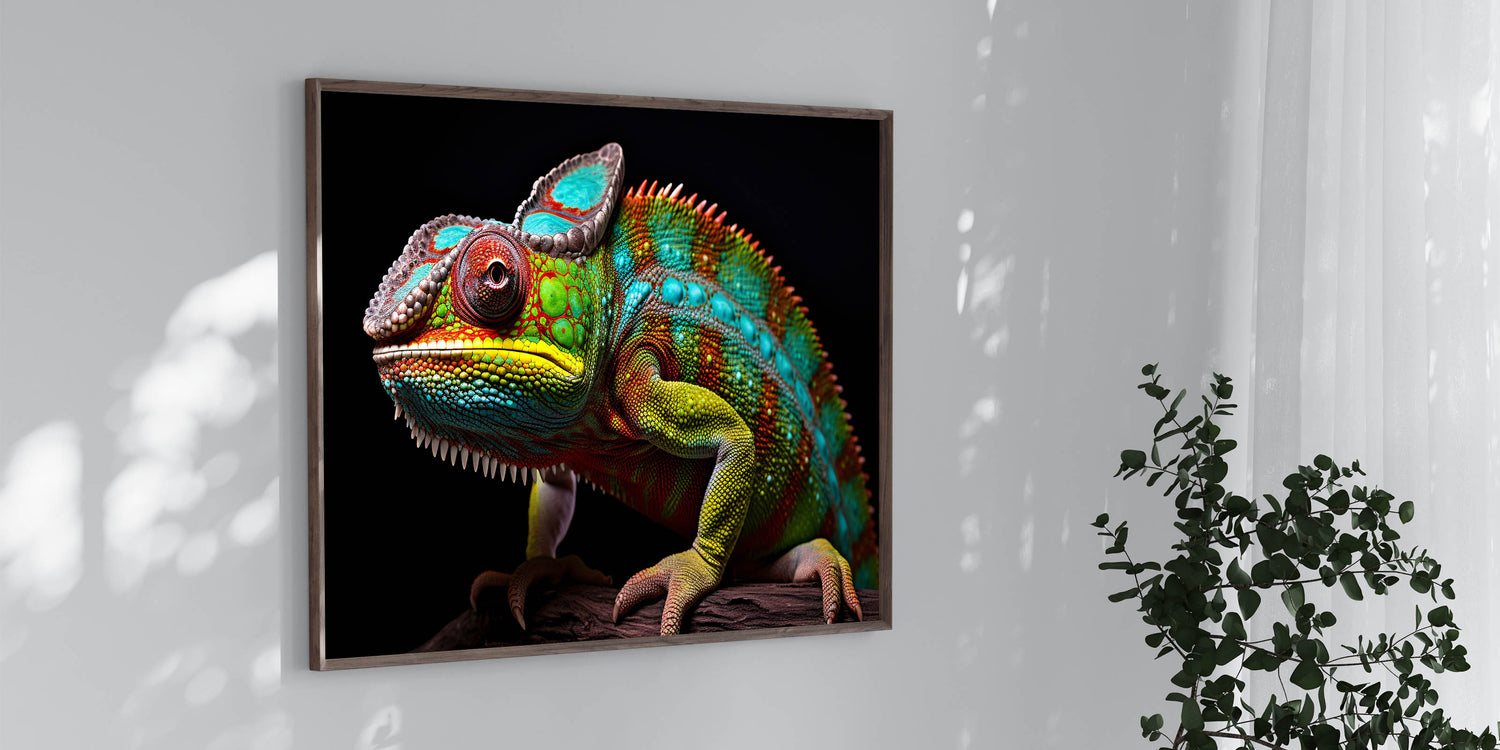 Whether you're enhancing a wildlife-themed space or simply looking for a standout piece of art, this chameleon canvas and acrylic print is sure to impress. Its vibrant colors and detailed design make it a standout addition to any collection.
