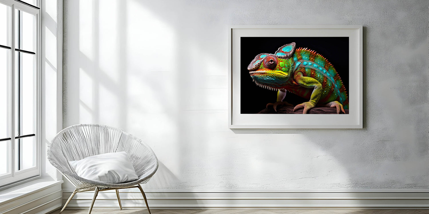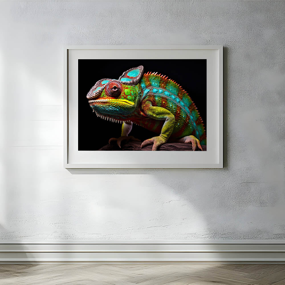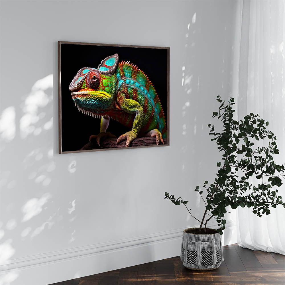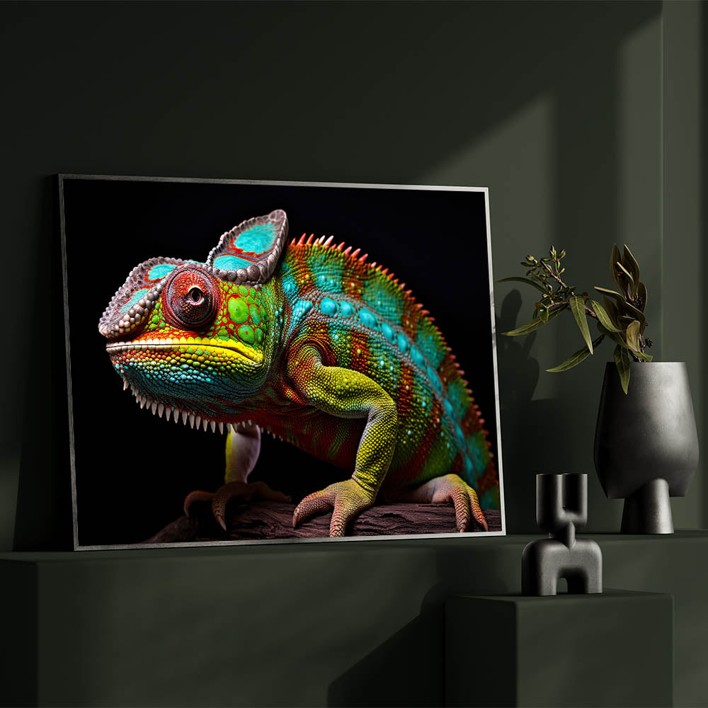 Elevate your home decor with this bold and vibrant chameleon wall art. This stunning piece captures the chameleon in vivid detail, with a rich spectrum of colors set against a dramatic black background. The intricate patterns and lifelike textures make this artwork a captivating focal point, ideal for those who appreciate nature's beauty and striking, colorful decor. Perfect for modern, eclectic, or nature-inspired interiors, this piece adds a touch of exotic elegance to any room.