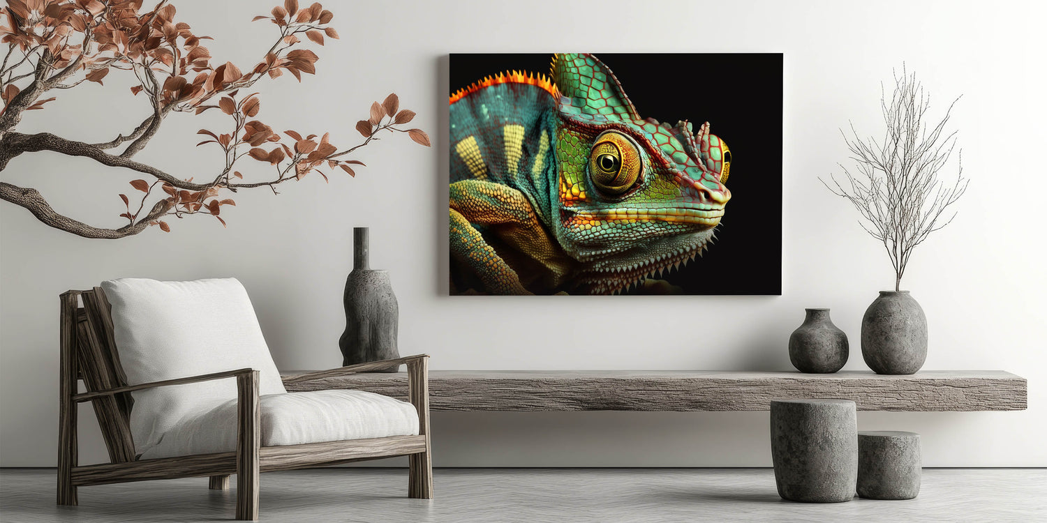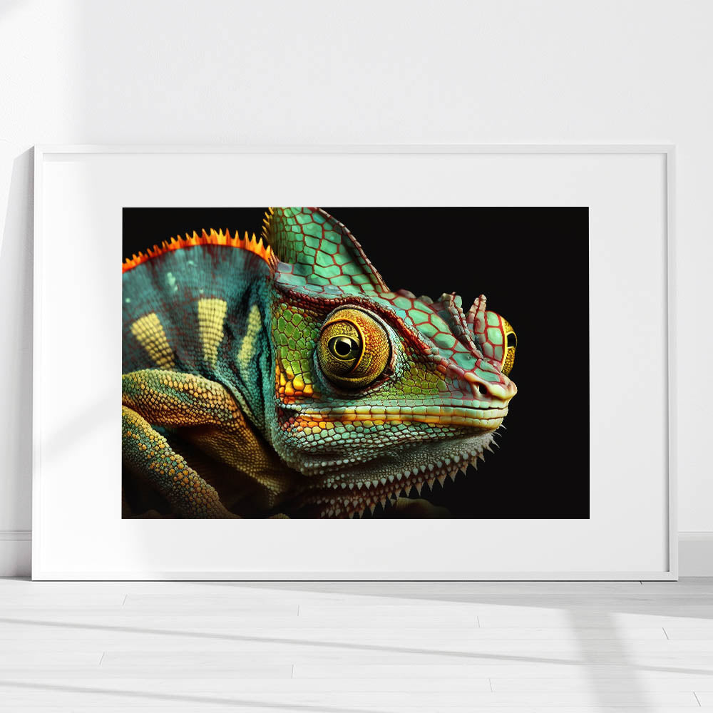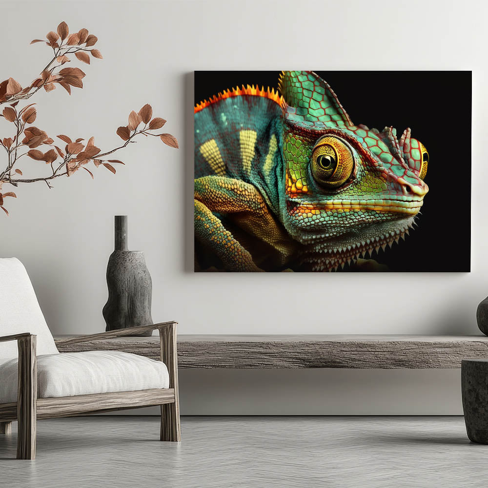 Immerse yourself in the intricate beauty of nature with this striking chameleon close-up wall art. This piece captures the chameleon's detailed scales and vibrant colors in stunning clarity, creating a powerful focal point that draws the eye. Perfect for reptile enthusiasts and those who appreciate wildlife-inspired decor, this artwork brings the wild into your home in a sophisticated and artistic way.