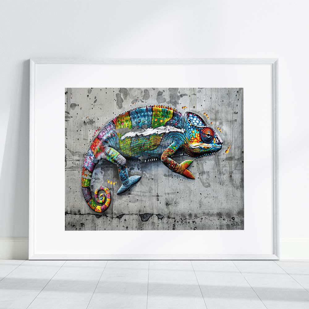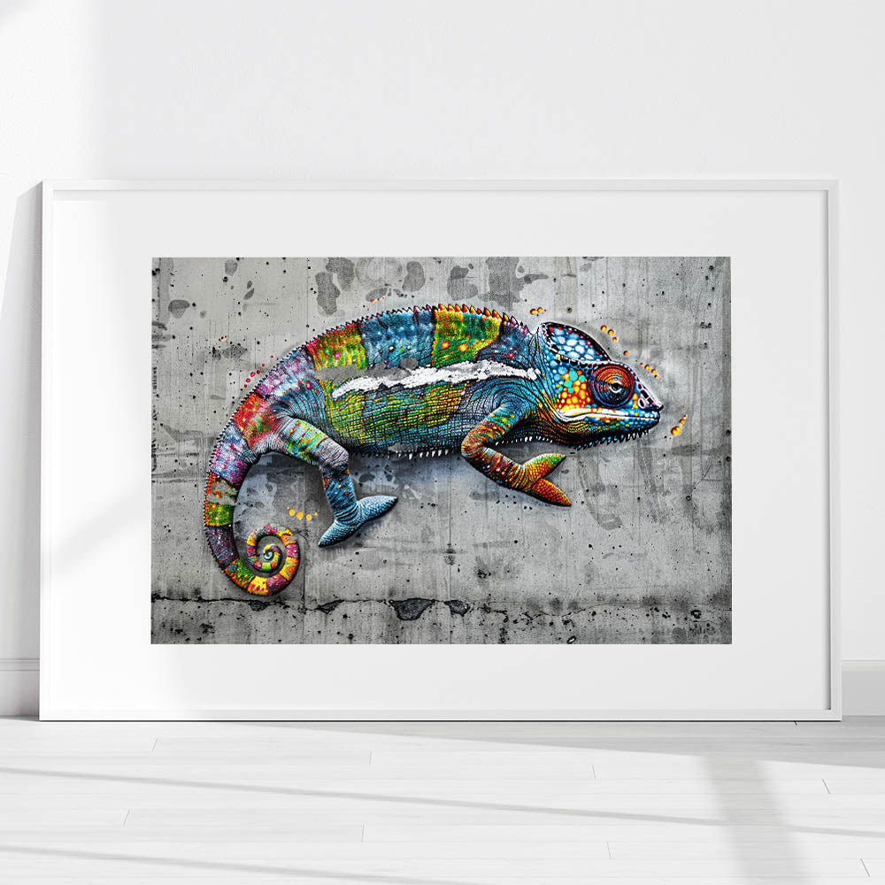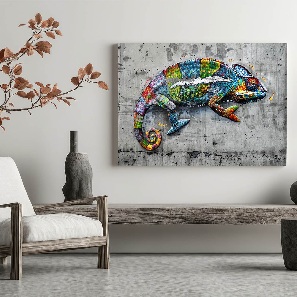 Whether you're a fan of street art or looking to add a splash of color to your home, this chameleon canvas and acrylic print is sure to impress. Its vibrant, urban aesthetic makes it a standout piece in any collection.