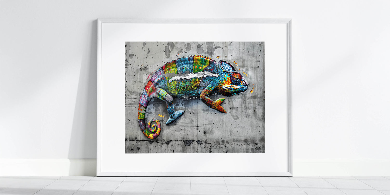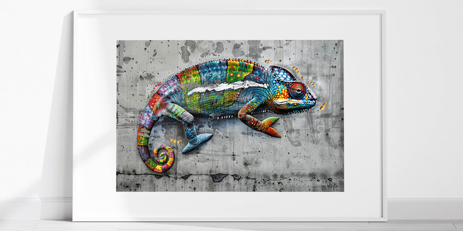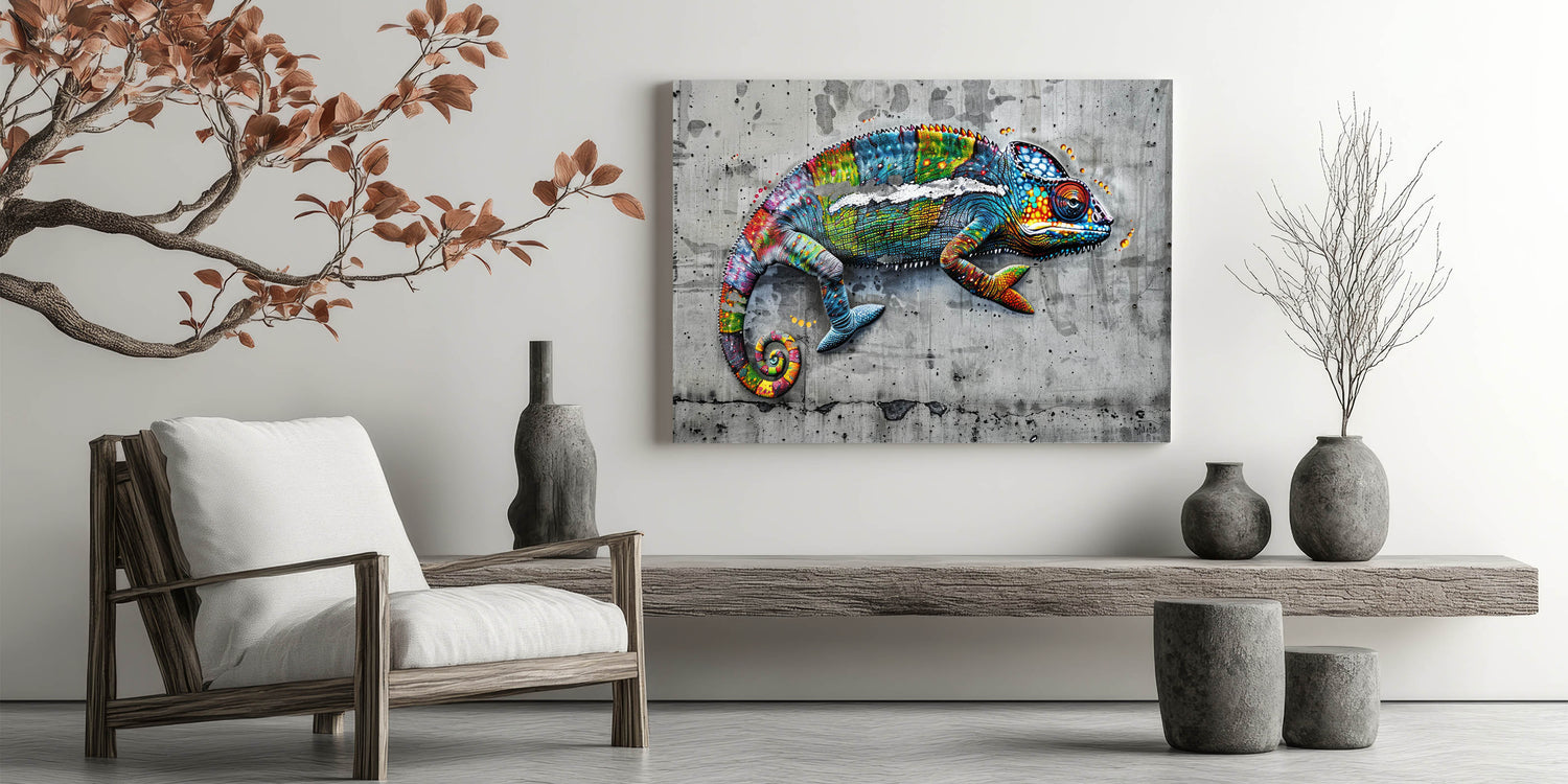 Whether you're a fan of street art or looking to add a splash of color to your home, this chameleon canvas and acrylic print is sure to impress. Its vibrant, urban aesthetic makes it a standout piece in any collection.