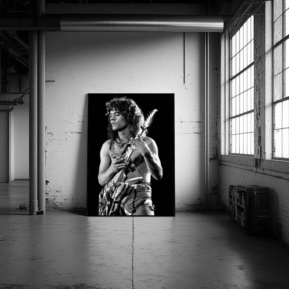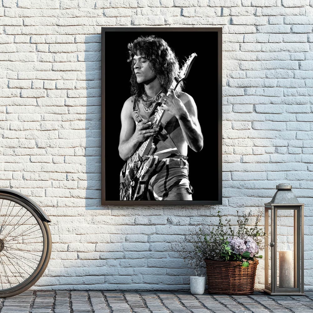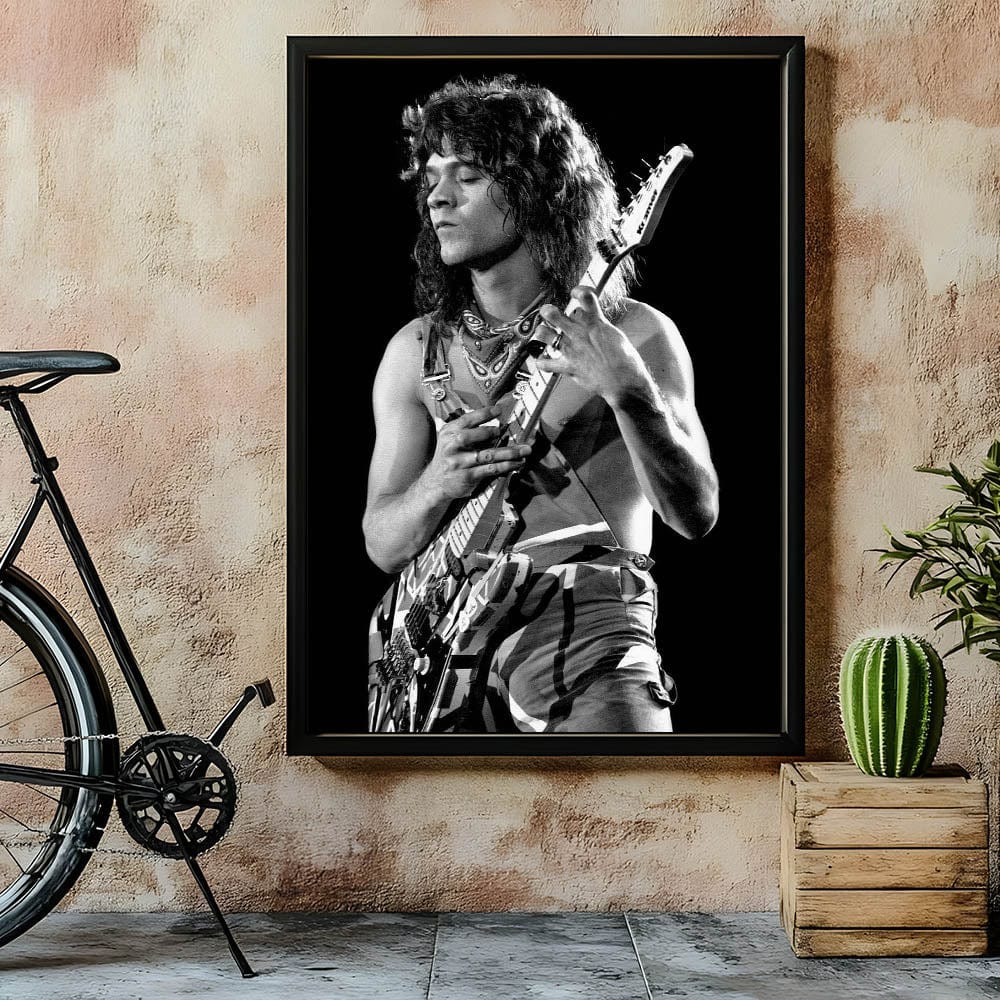 This striking black-and-white poster of Eddie Van Halen captures the raw energy and brilliance of one of rock's greatest guitarists. Known for his electrifying performances and revolutionary guitar techniques, Eddie Van Halen is immortalized in this iconic image, showcasing him mid-performance with his famous striped guitar. The intense focus and passion he exudes make this piece a must-have for fans of classic rock and guitar virtuosity. This poster not only celebrates Eddie's musical legacy but also adds a touch of vintage rock style to any space.