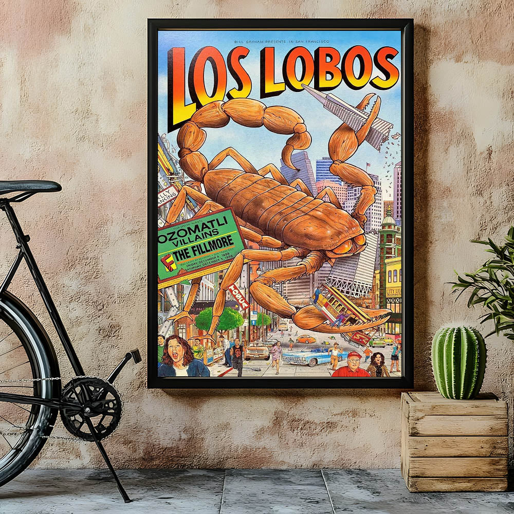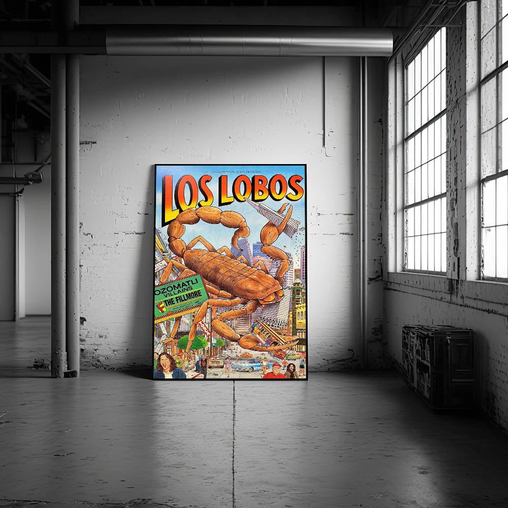 This vibrant Los Lobos concert poster from 1998 brings a fun, whimsical twist to your retro wall art collection. With its colorful cartoon style and dynamic city scene, featuring a giant scorpion rampaging through the streets of San Francisco, it’s a unique piece that blends music and playful illustration. Perfect for adding a bold statement to any room, this poster is ideal for fans of Los Lobos and collectors of vintage rock concert prints.