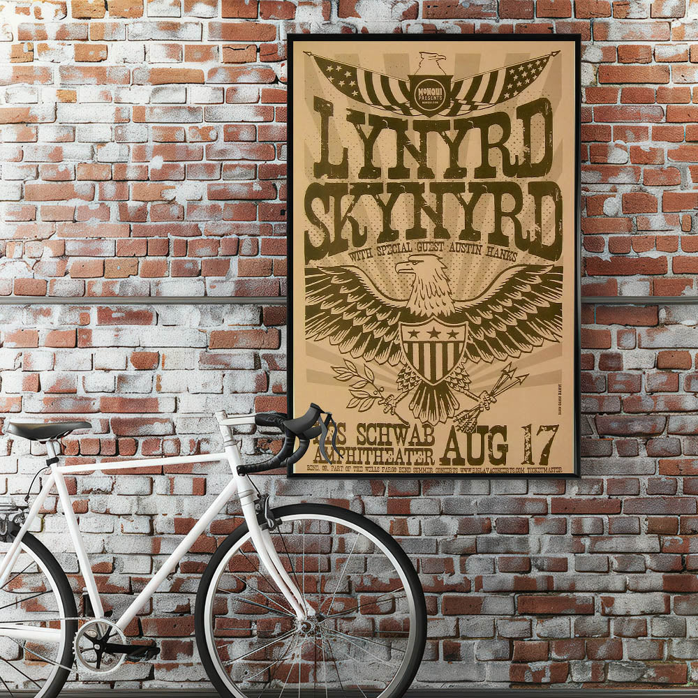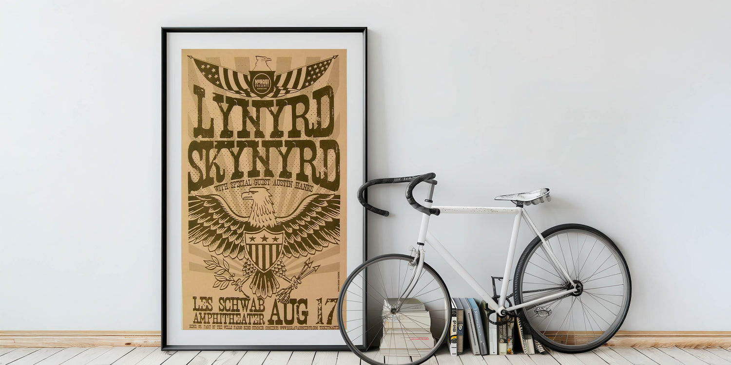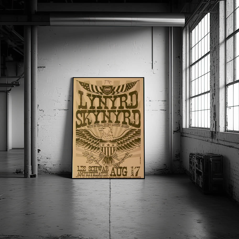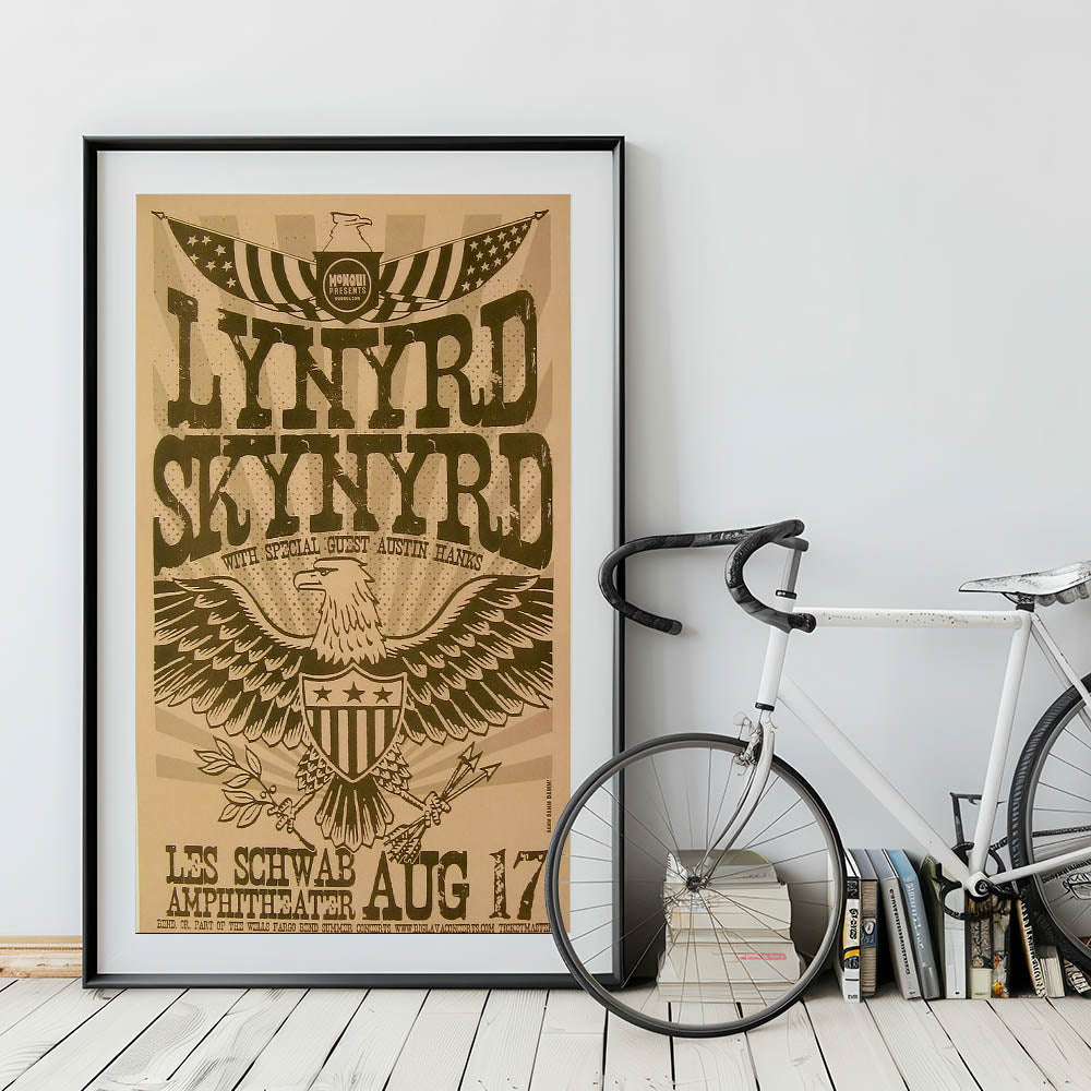 This vintage Lynyrd Skynyrd concert poster captures the essence of American rock with its bold and iconic design. Featuring the band's name in classic typography with a patriotic eagle graphic, this piece celebrates their performance at the Les Schwab Amphitheater. The poster is the perfect mix of Americana and rock ‘n’ roll, with black and beige tones that bring a nostalgic touch to any room.
