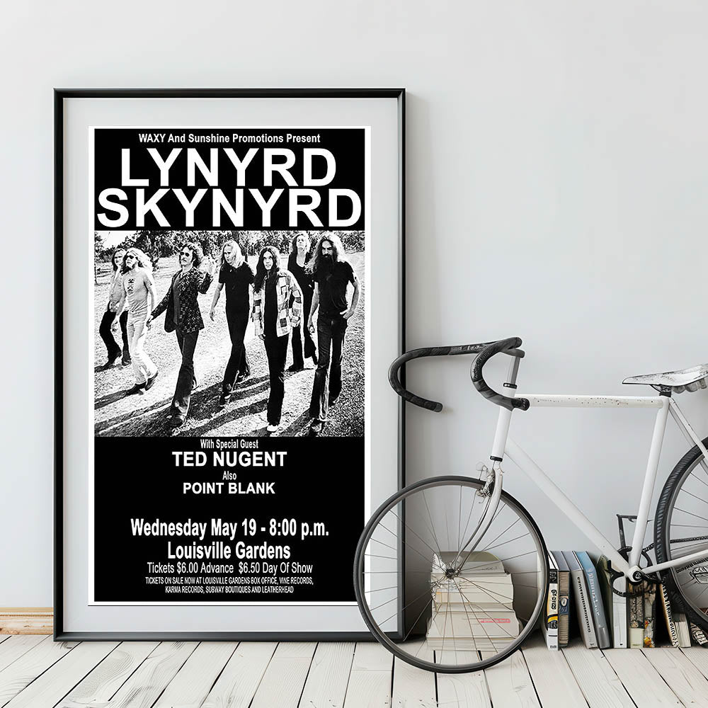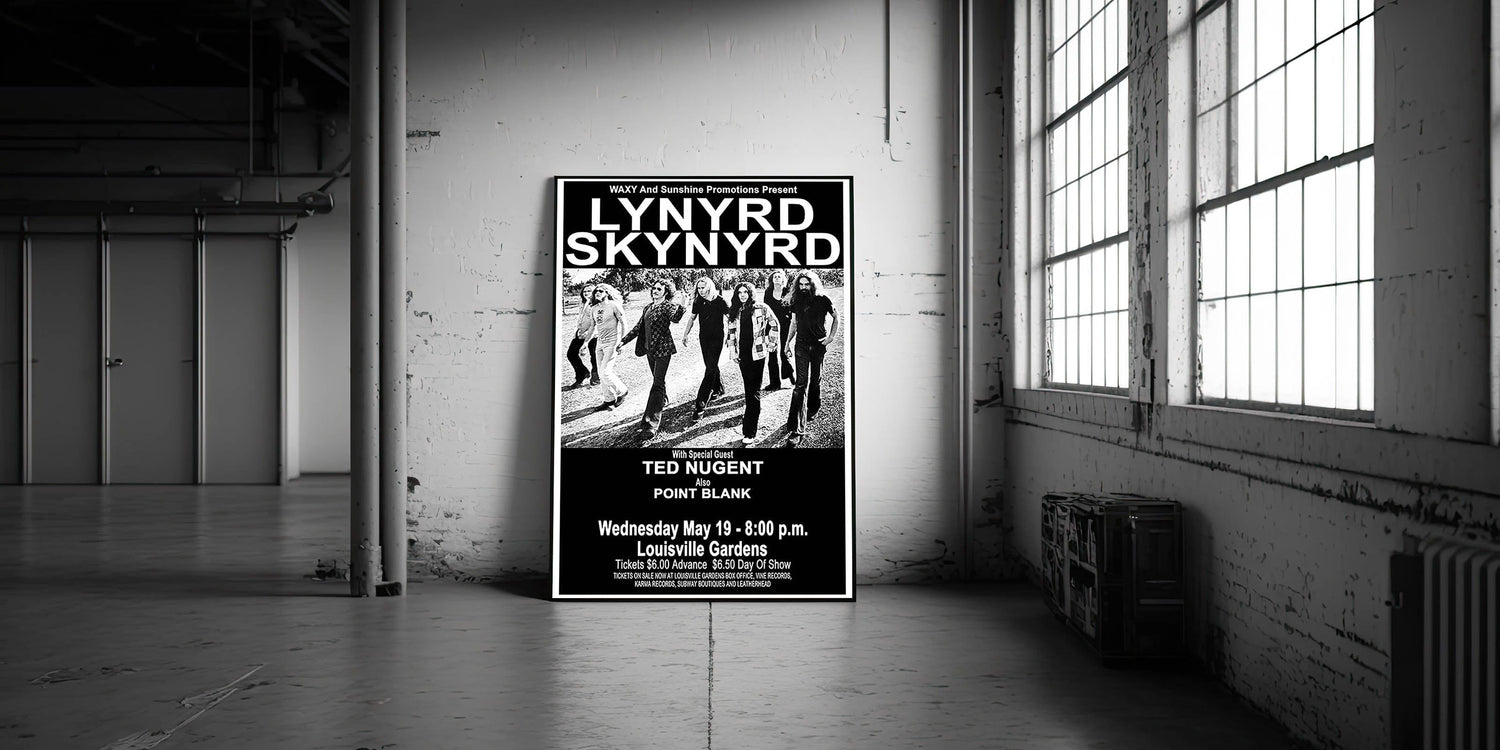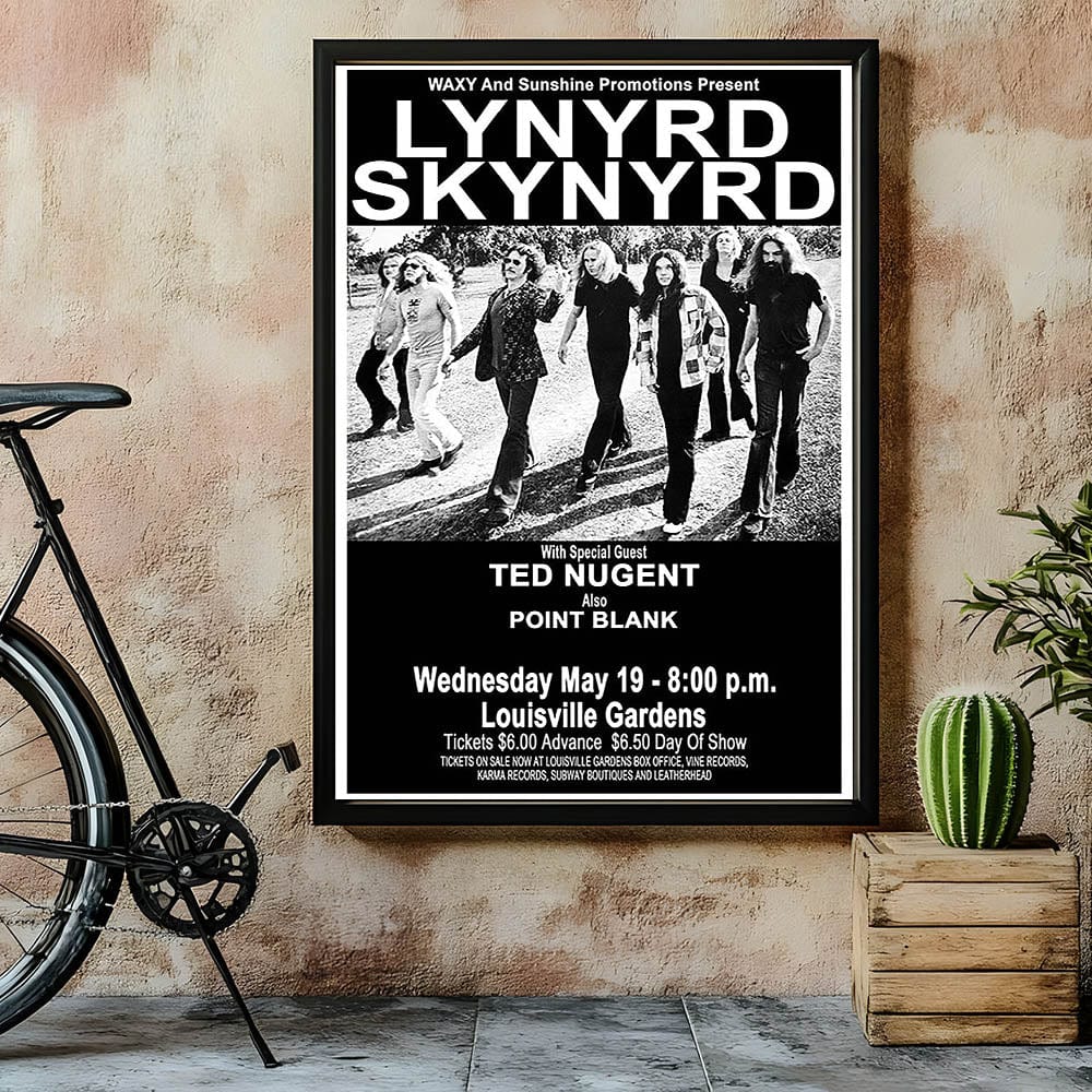 This Lynyrd Skynyrd Retro Poster from their 1976 concert, featuring special guest Ted Nugent, is the perfect addition to any classic rock fan's collection. With its striking black-and-white design, it captures the energy and iconic style of the Southern rock legends, bringing vintage rock decor into your home.