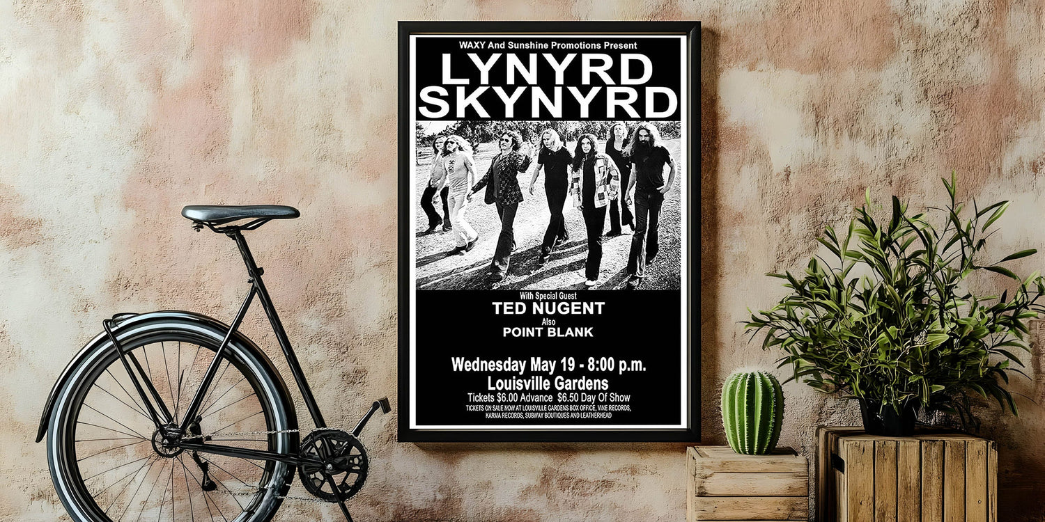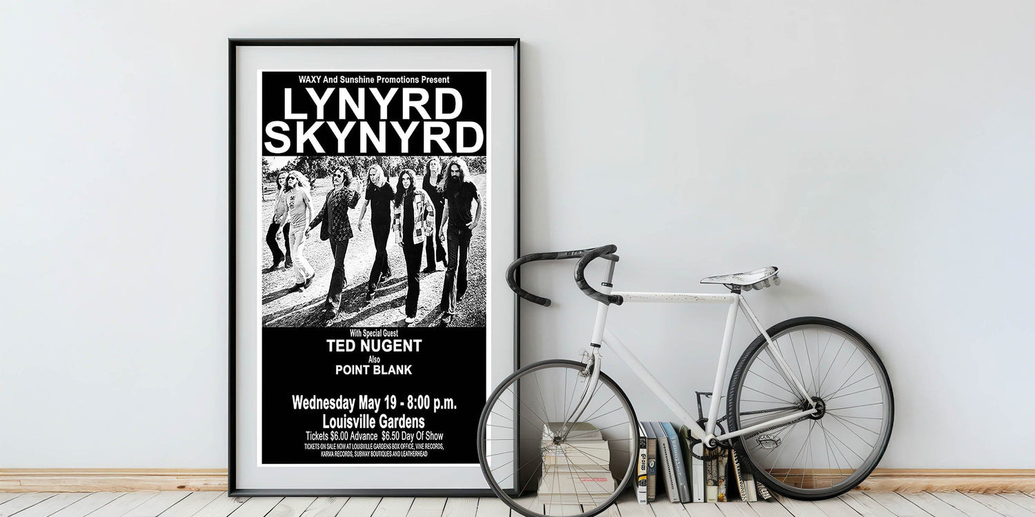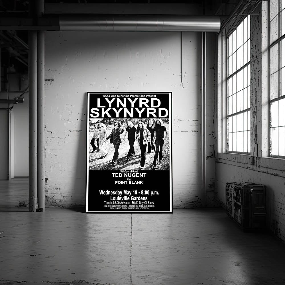This Lynyrd Skynyrd Retro Poster from their 1976 concert, featuring special guest Ted Nugent, is the perfect addition to any classic rock fan's collection. With its striking black-and-white design, it captures the energy and iconic style of the Southern rock legends, bringing vintage rock decor into your home.