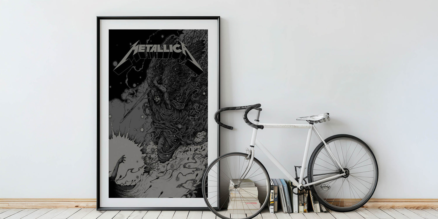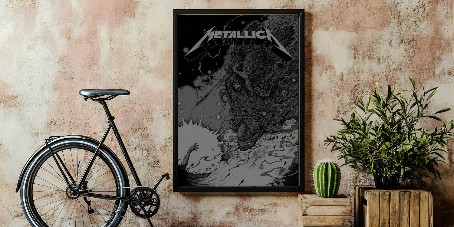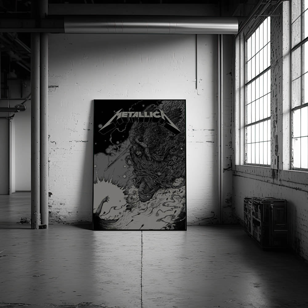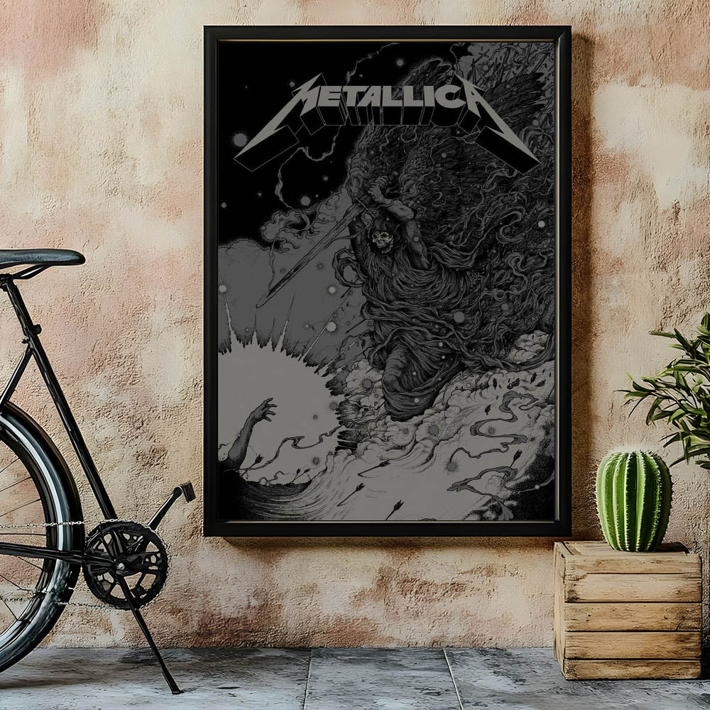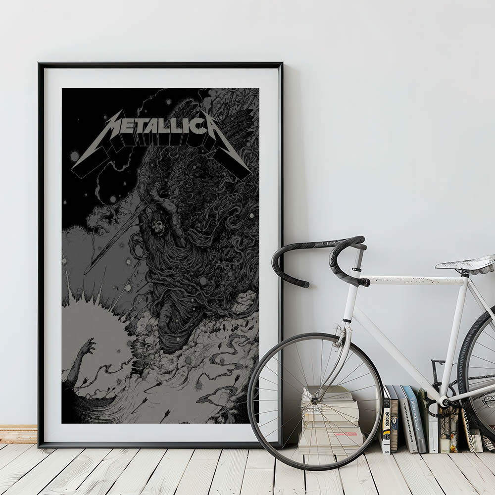 This powerful Metallica poster features a striking image of a skeletal angel wielding a sword, capturing the essence of Metallica’s intensity and dark aesthetic. With its intricate line work and ominous atmosphere, this artwork represents the raw power and rebellious spirit that defines Metallica’s music. The monochrome color scheme, with its dramatic contrasts, creates a bold visual impact, making it a perfect addition to any room. Whether you’re a longtime Metallica fan or an admirer of edgy, alternative art, this poster brings the energy of thrash metal into your space.