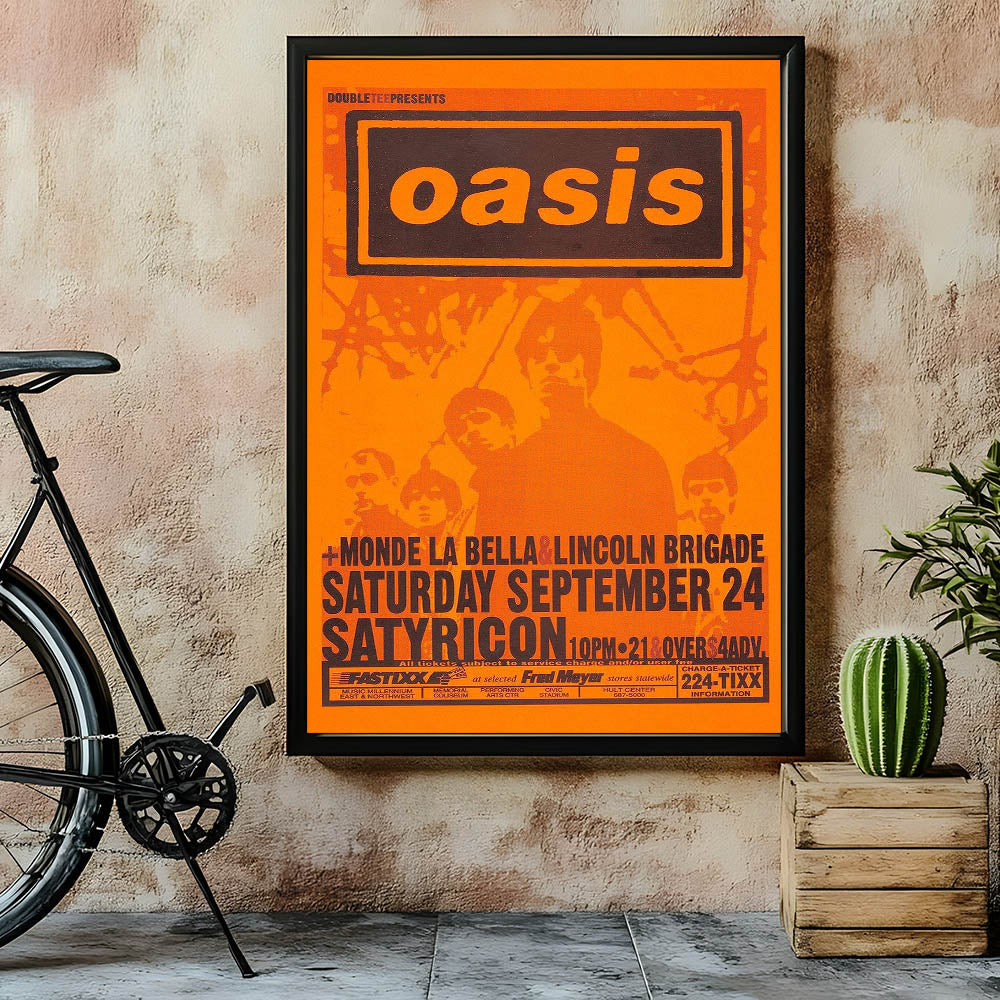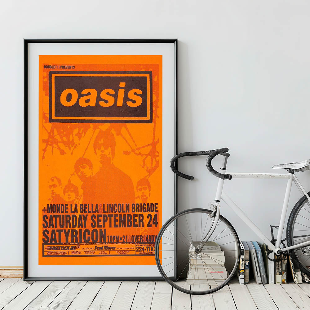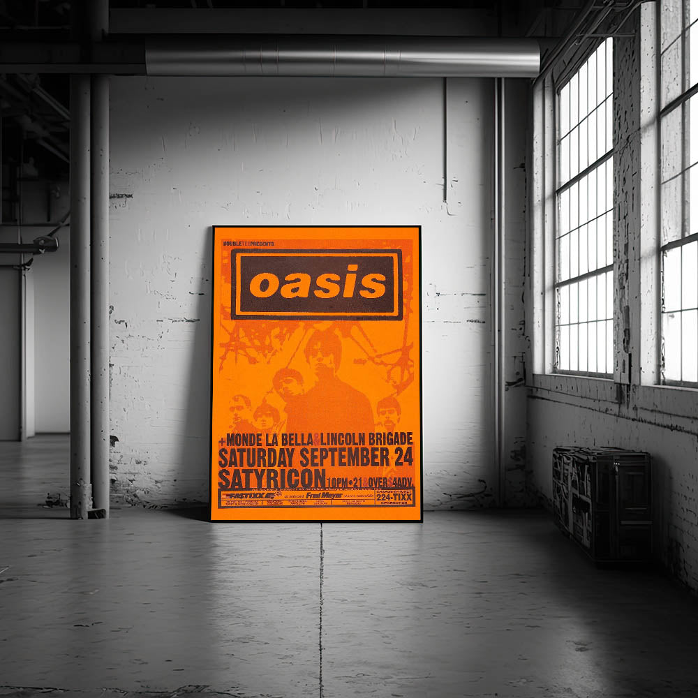 Bring the iconic energy of Oasis into your space with this vibrant retro concert poster. Featuring the legendary band in striking orange and black, this piece captures the essence of 90s Britpop with its bold design and captivating imagery. Perfect for any fan of Oasis, this poster features their performance at Satyricon, with a minimalist yet powerful aesthetic.
