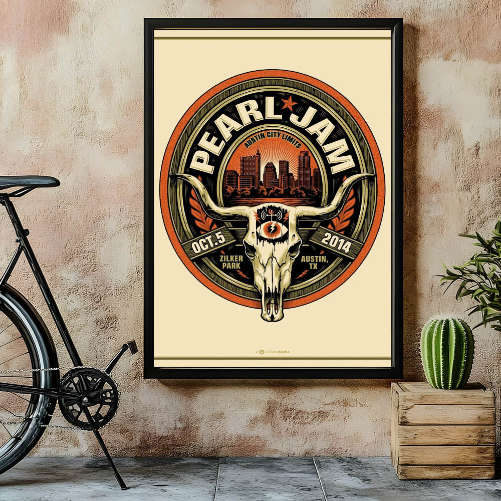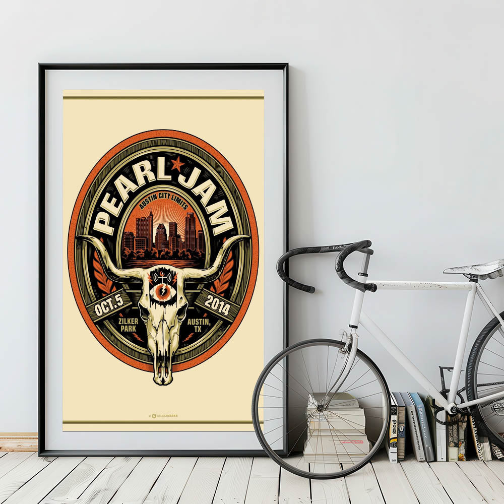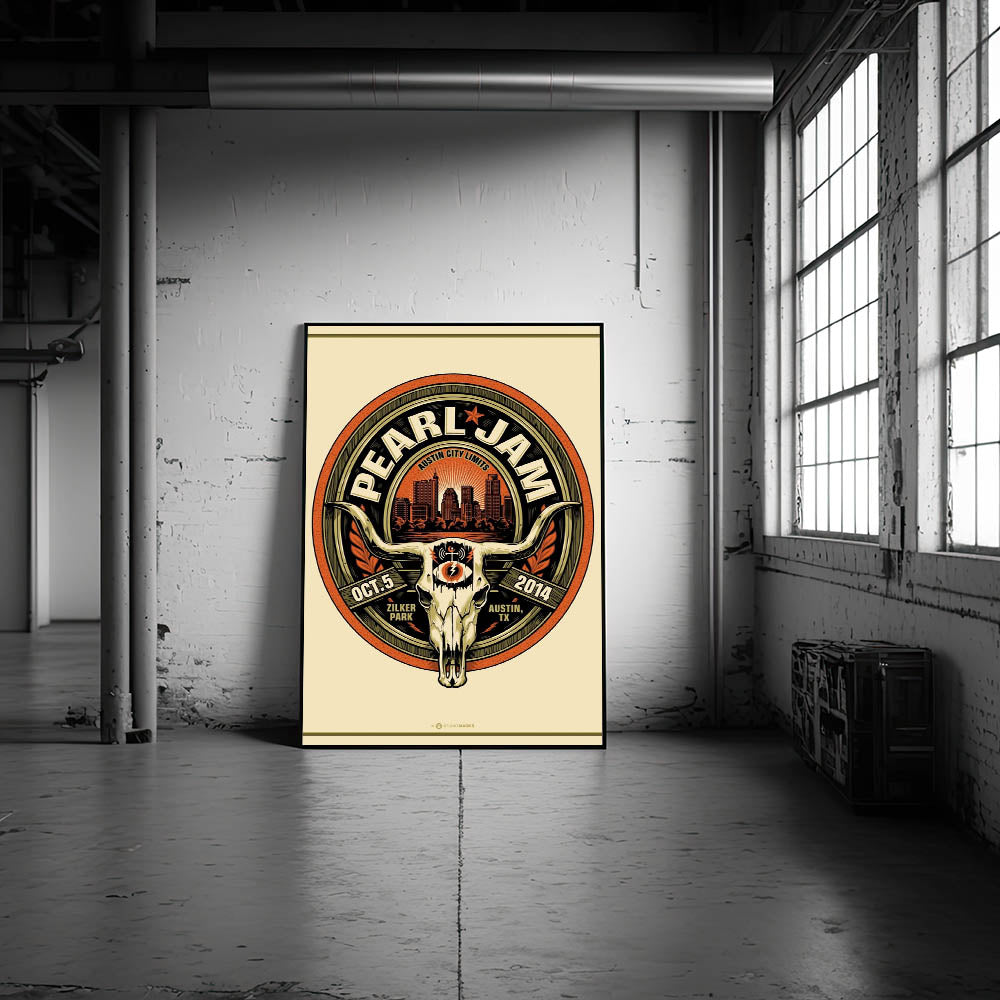 Celebrate the power and energy of Pearl Jam with this striking concert poster from their 2014 performance at Austin City Limits. Featuring a bold graphic of a steer skull, city skyline, and electrifying elements, this design is a perfect reflection of the raw energy of Pearl Jam’s live performance. The warm oranges and deep browns in the poster create a vintage yet modern aesthetic, while the skull and Austin city backdrop make this poster a must-have for music lovers and collectors.